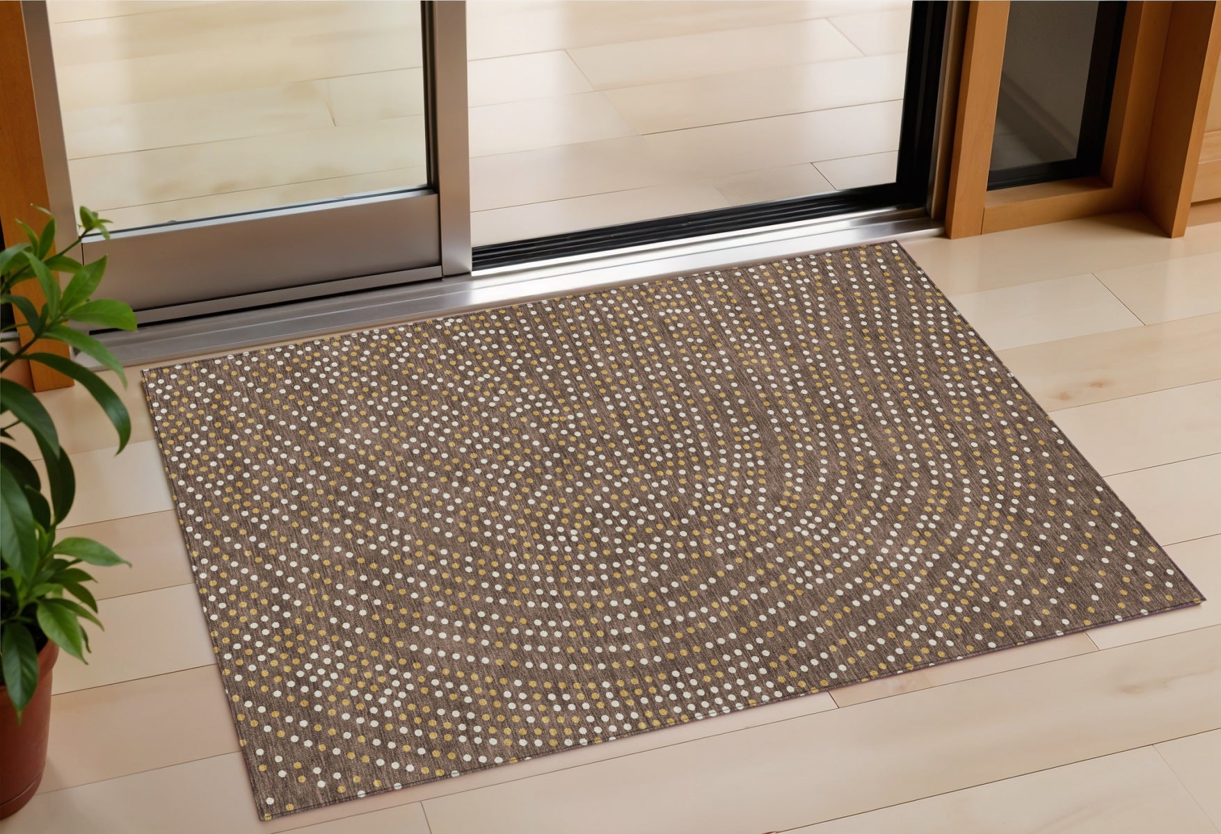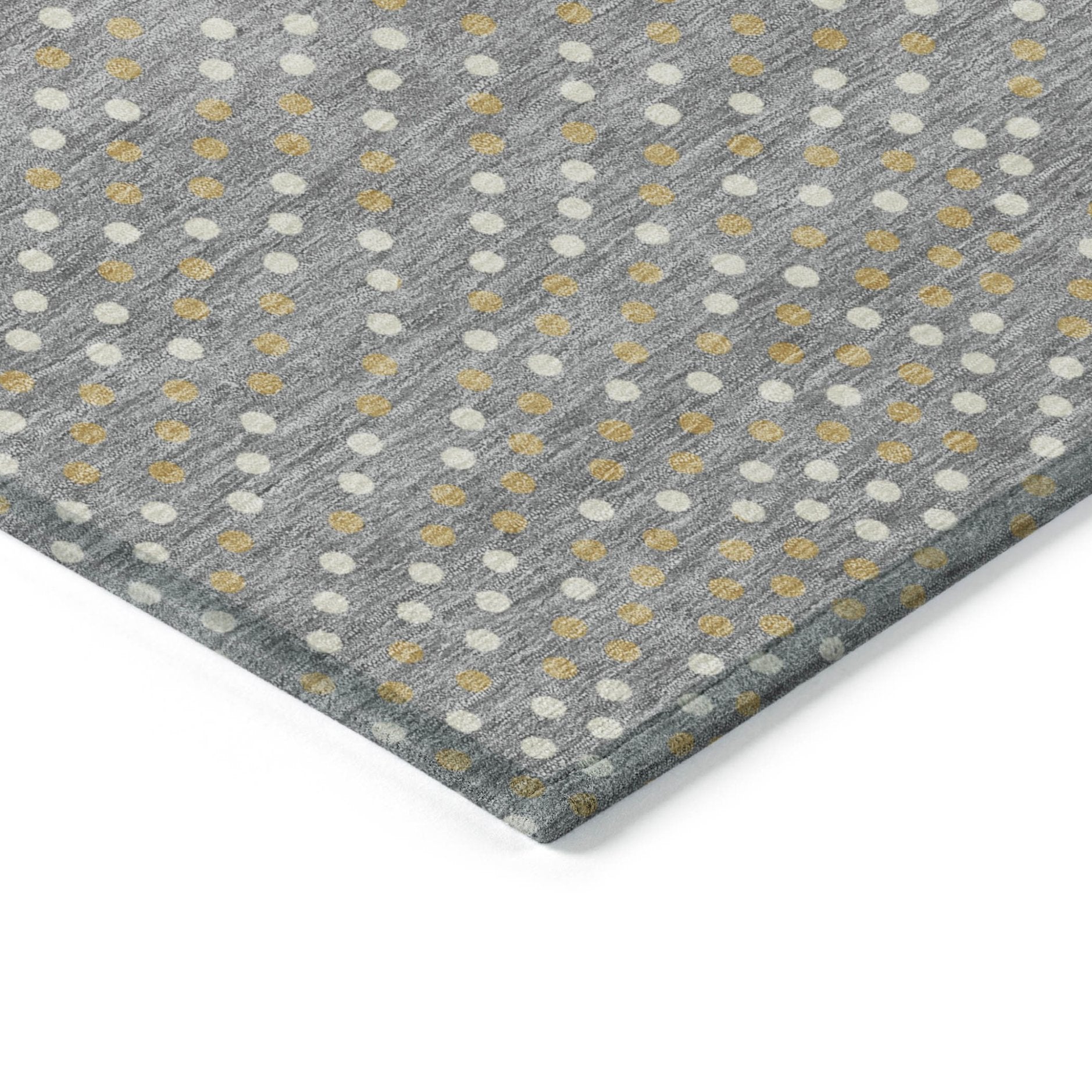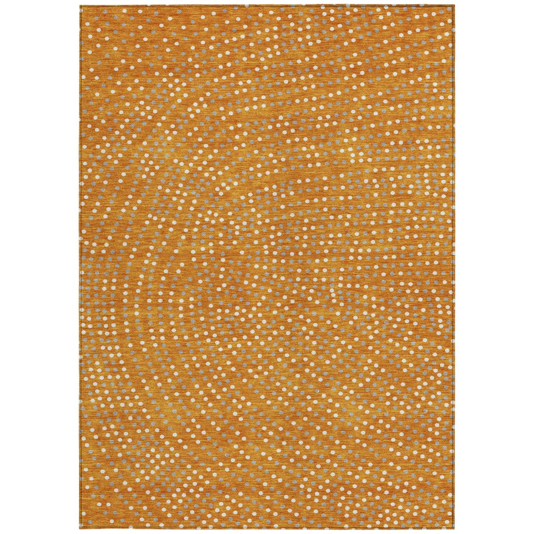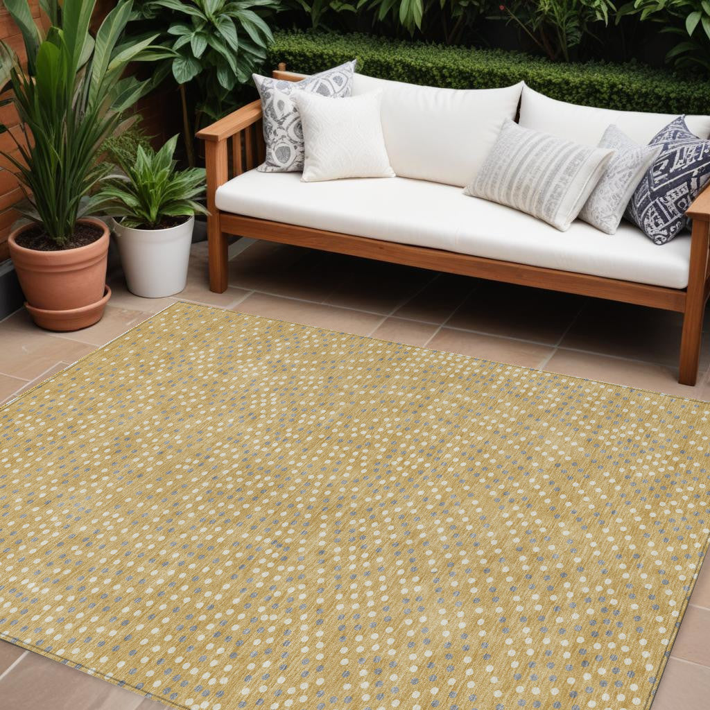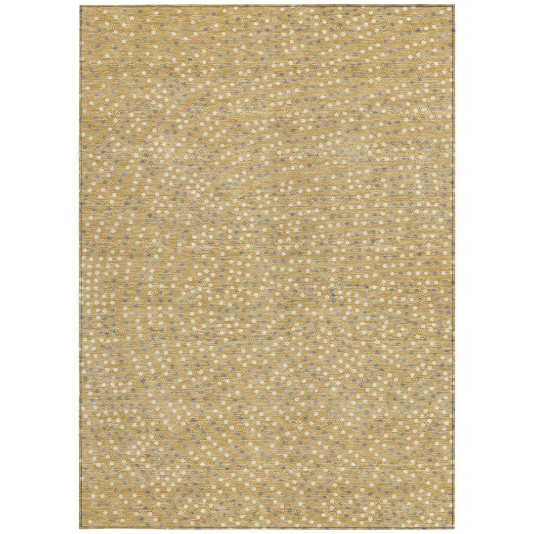 - Machine made outdoor rug with stain-resistant polyester material in a stylish gold color.