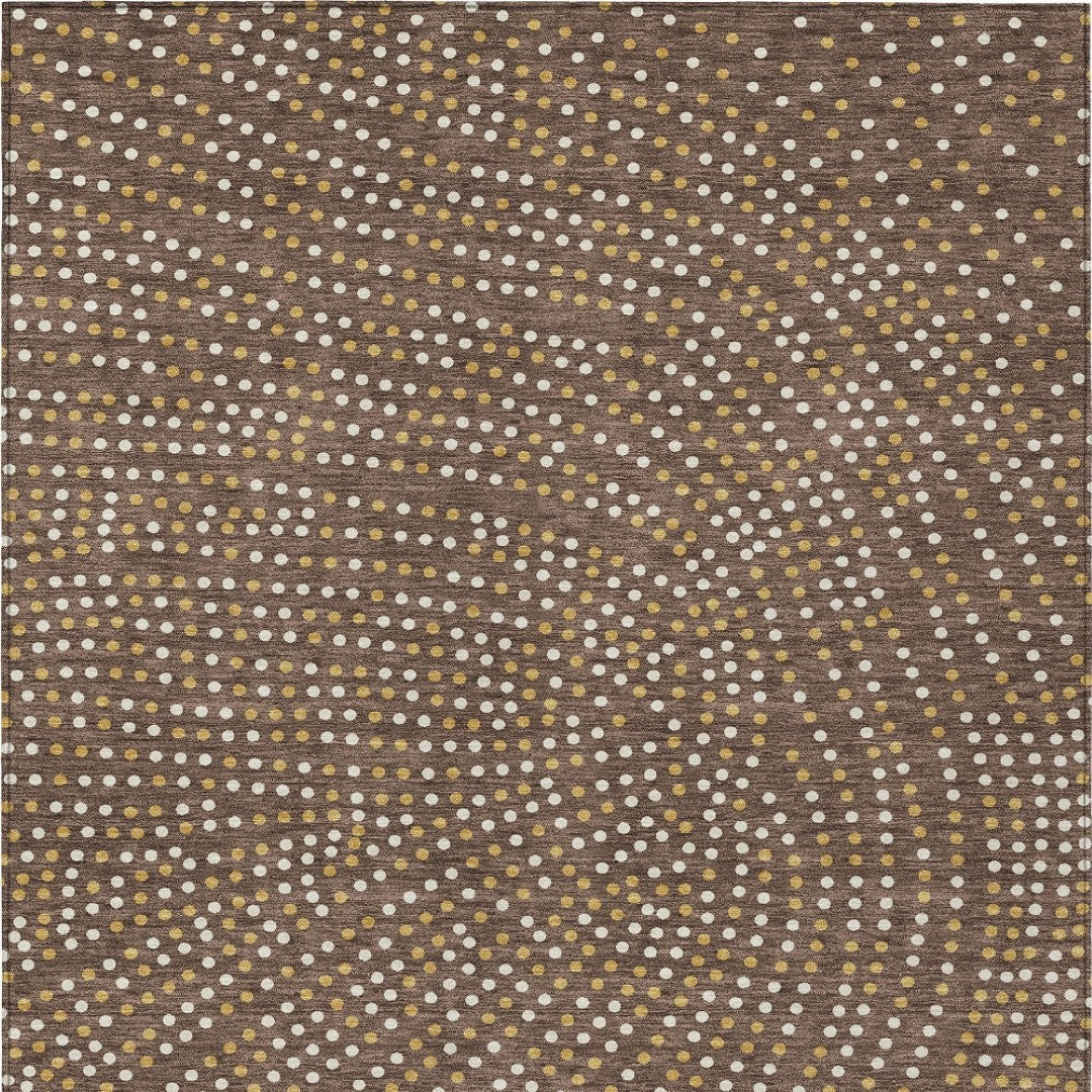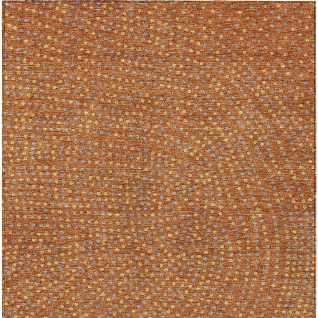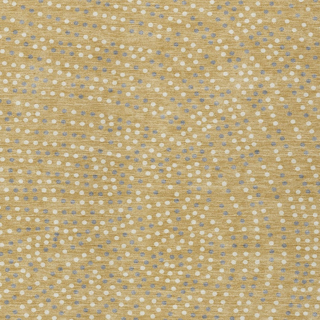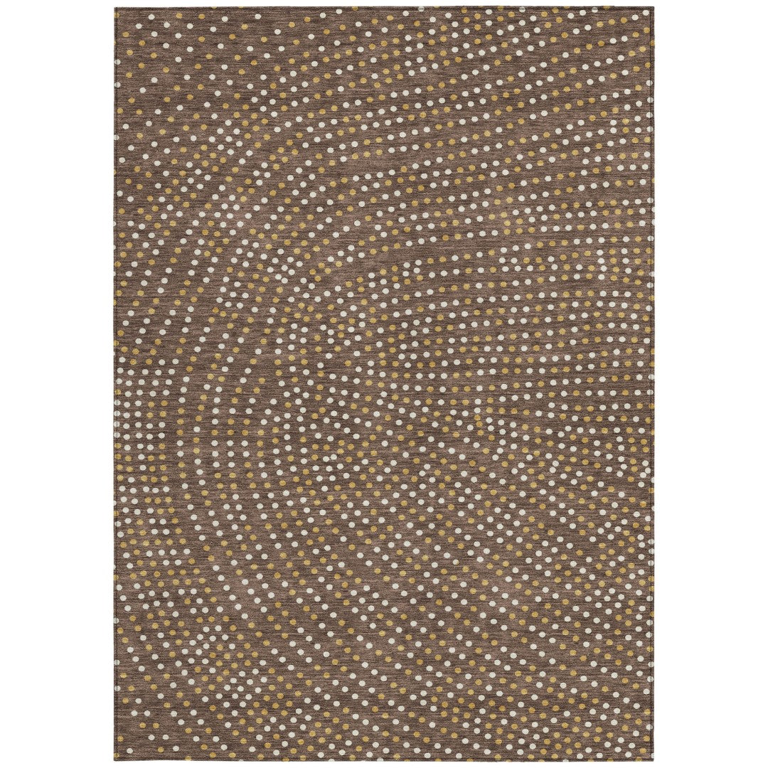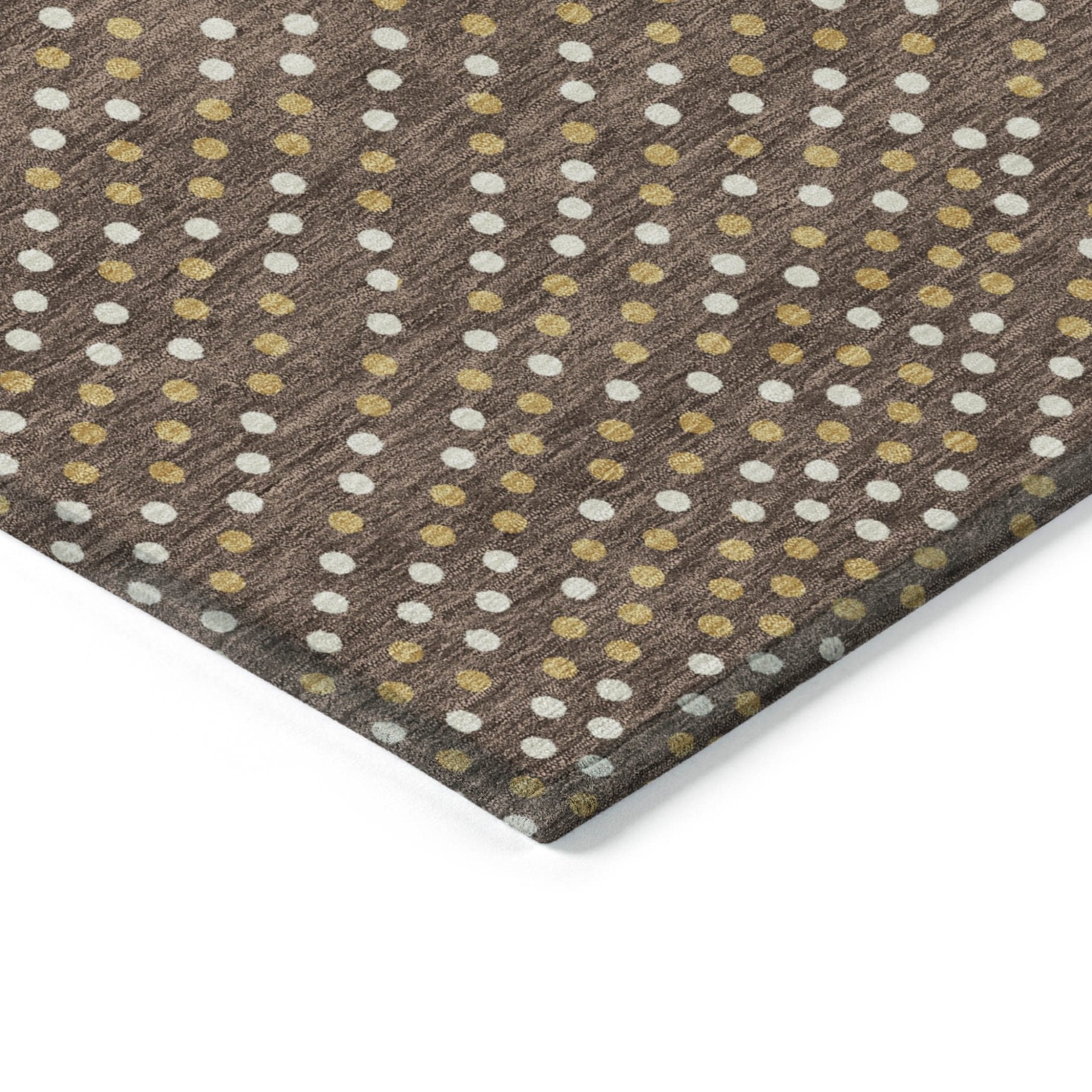 - Machine made outdoor rug with stain-resistant polyester material in a stylish gold color.