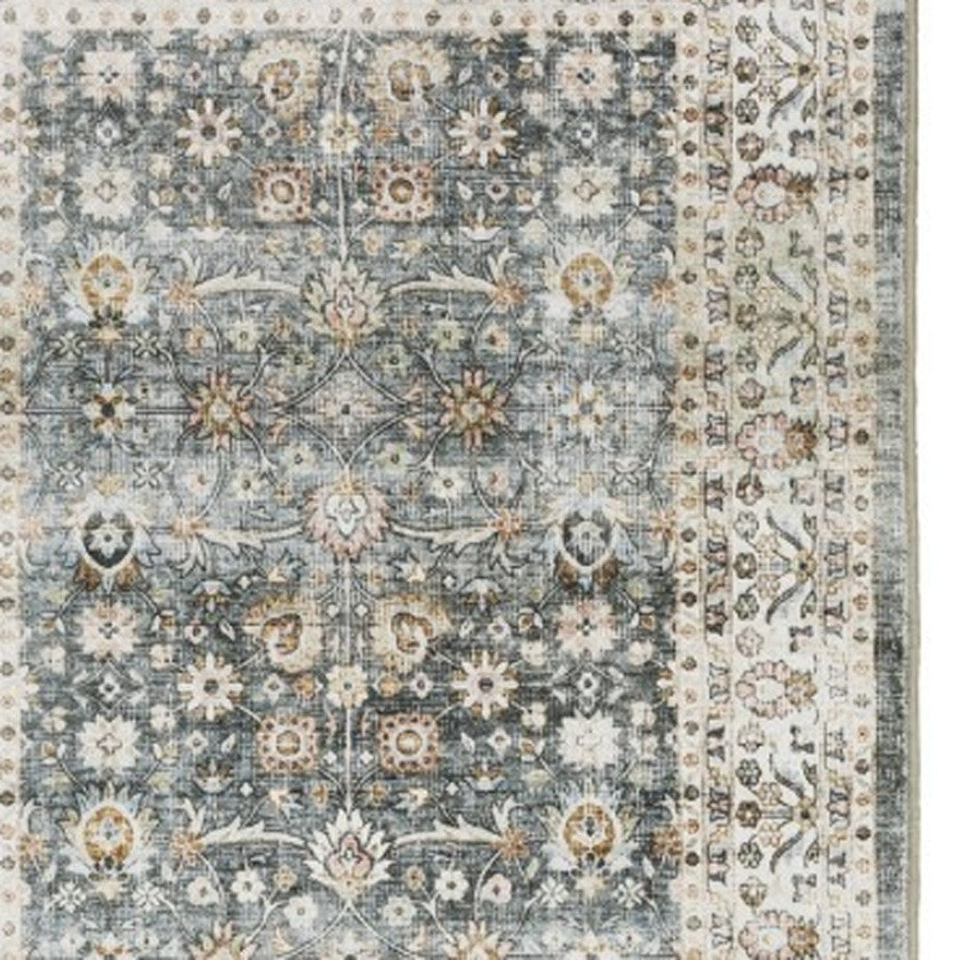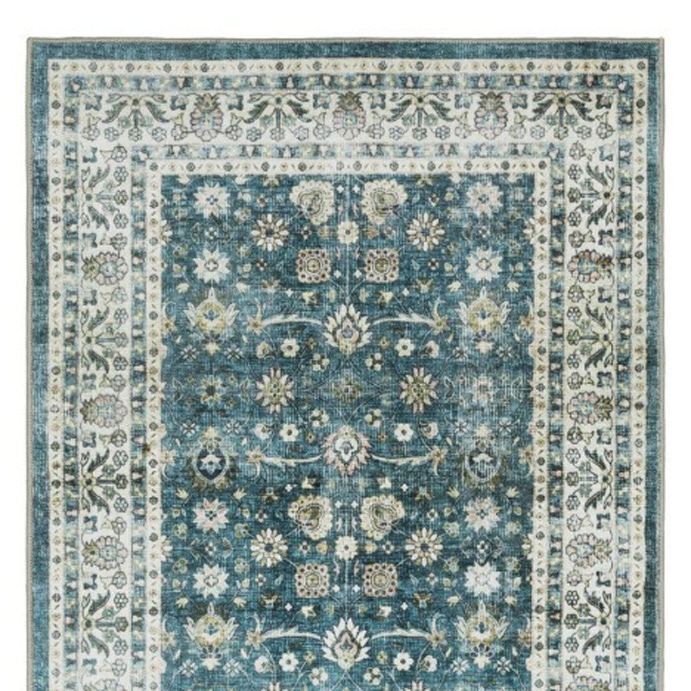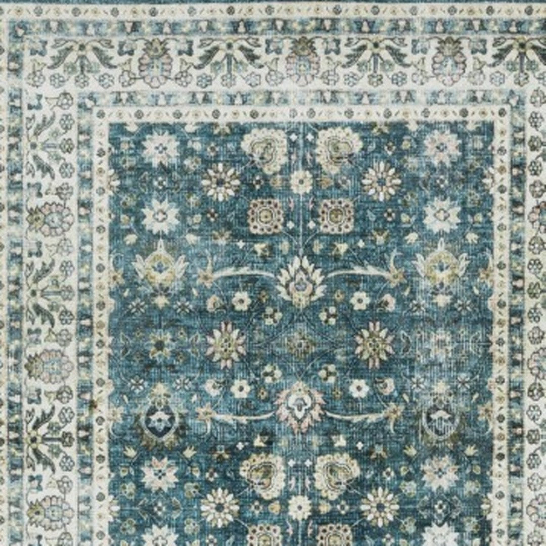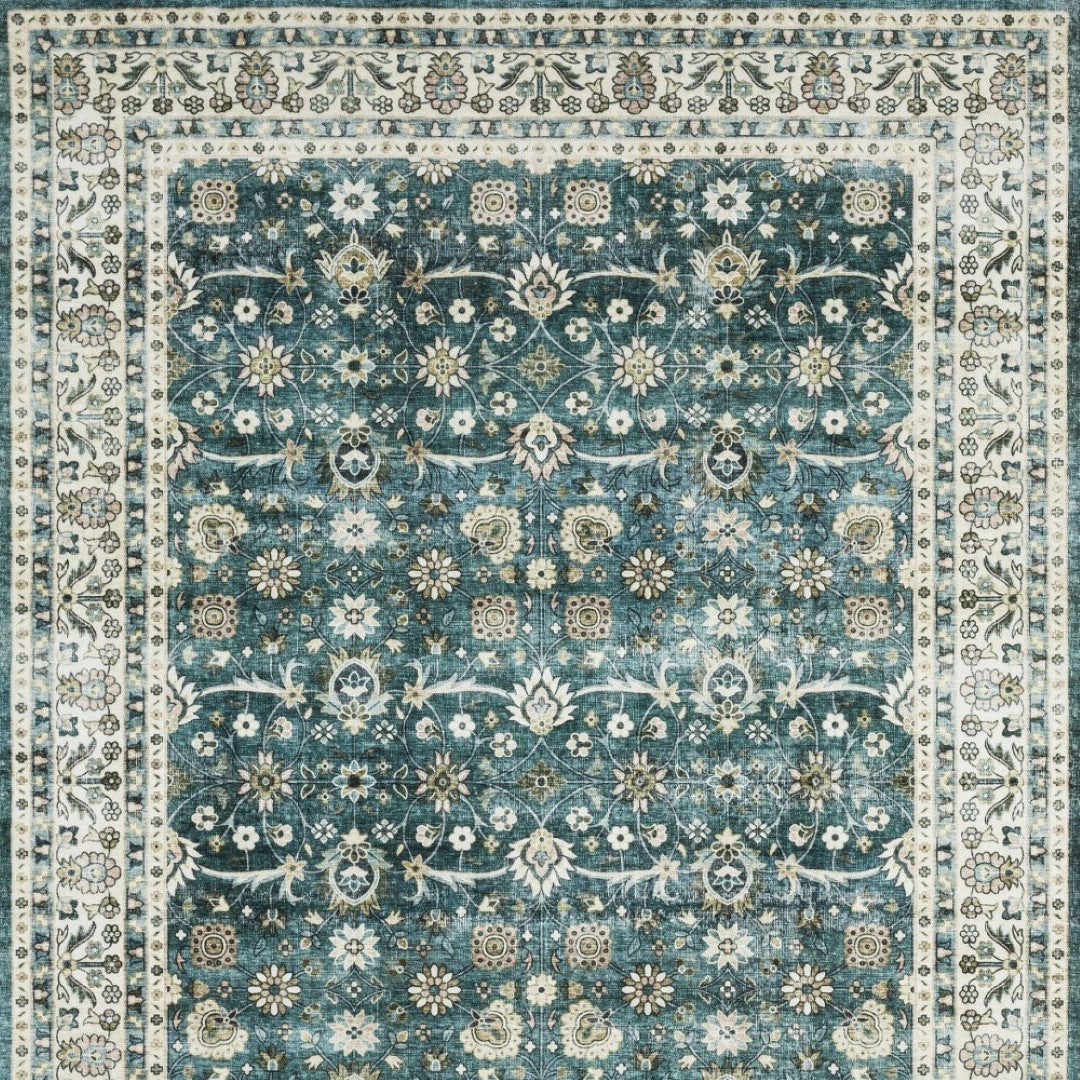 - traditional teal and ivory area rug with machine-made construction and a worn faded look.