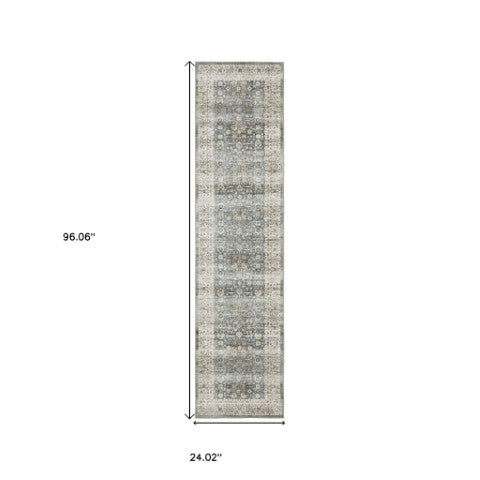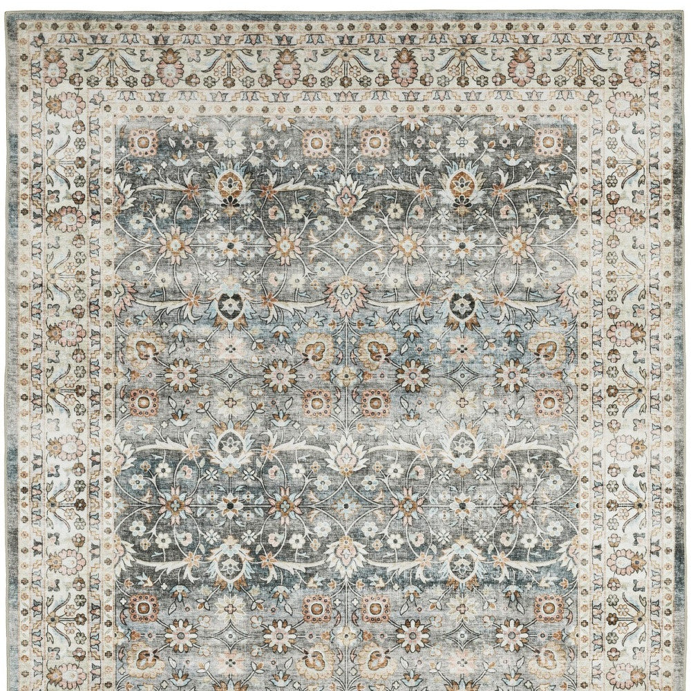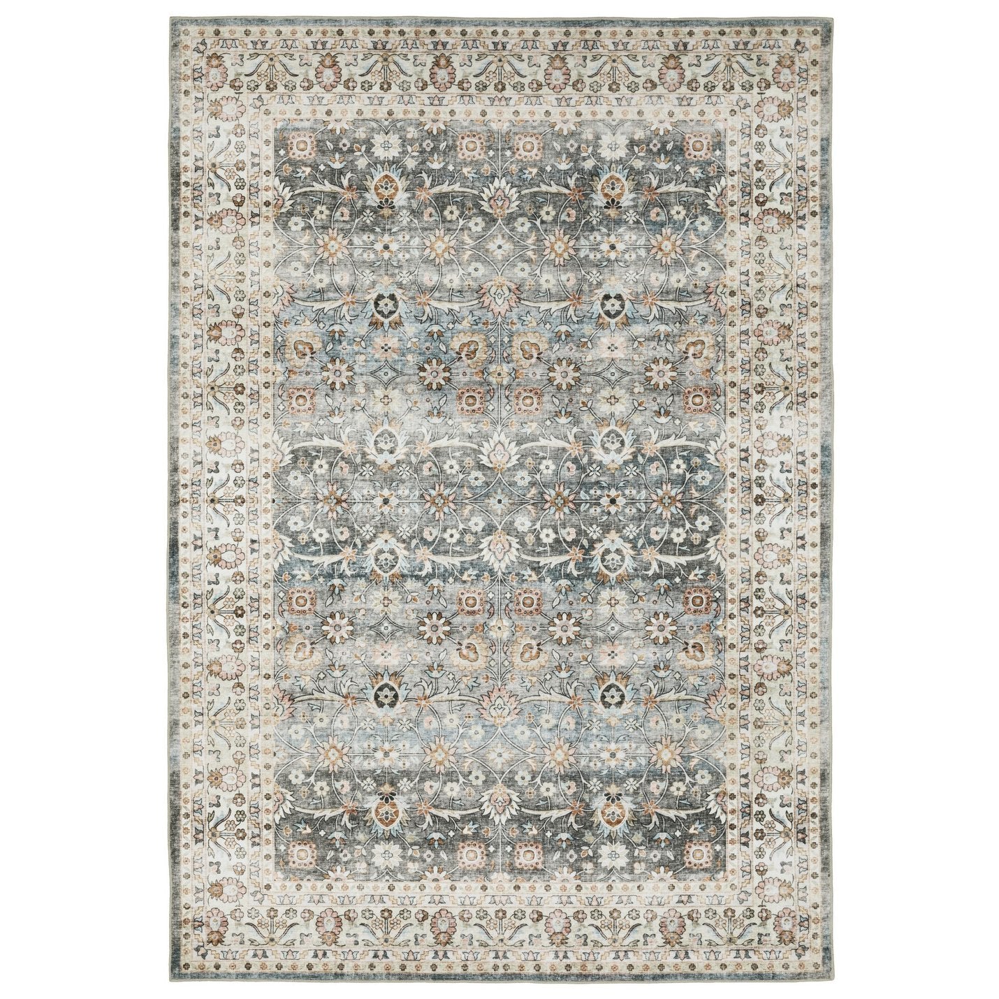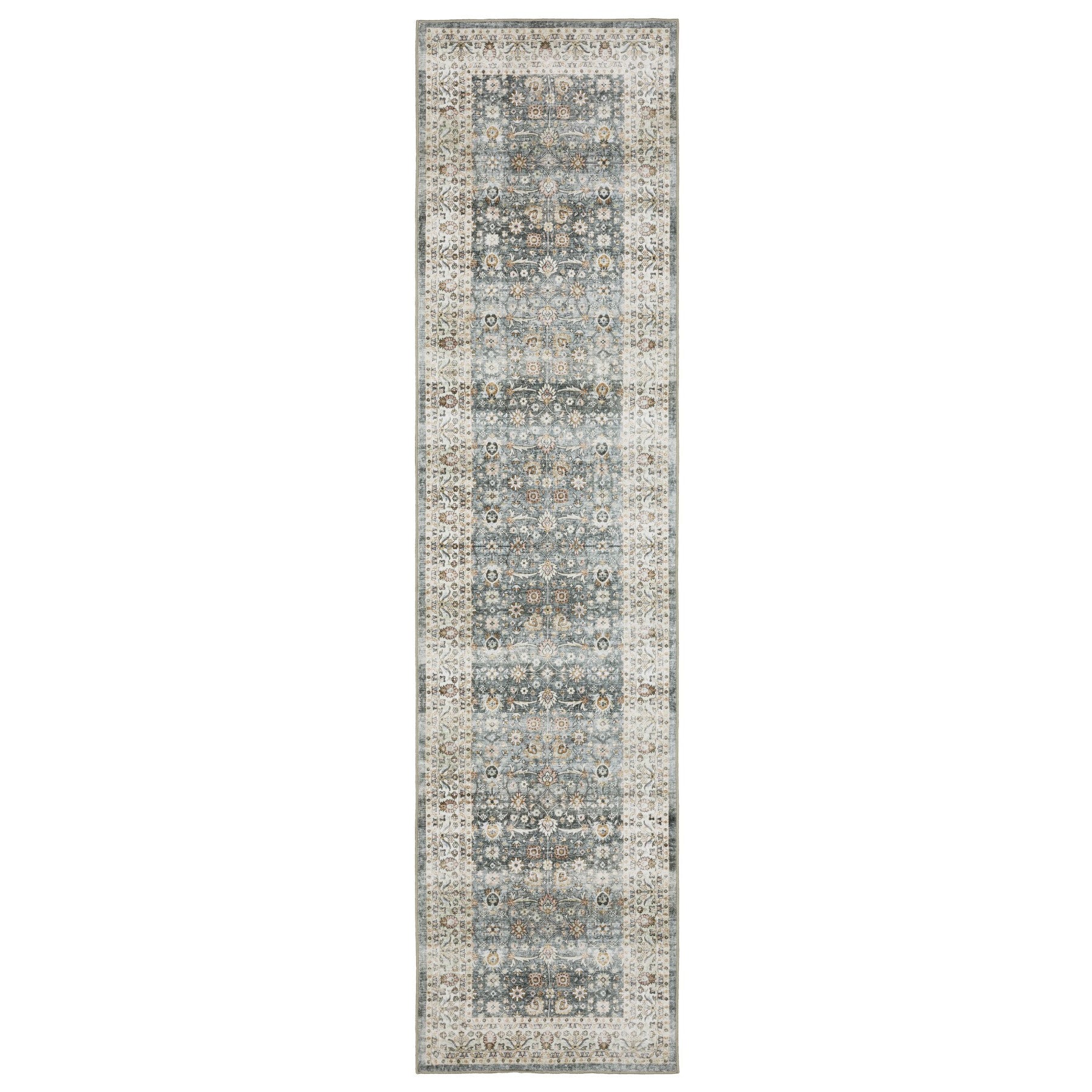 - traditional teal and ivory area rug with machine-made construction and a worn faded look.