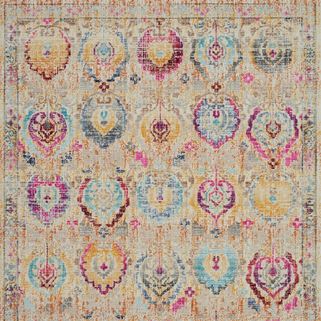 - Transitional ivory, pink, and orange area rug with a worn, faded look for the living room.