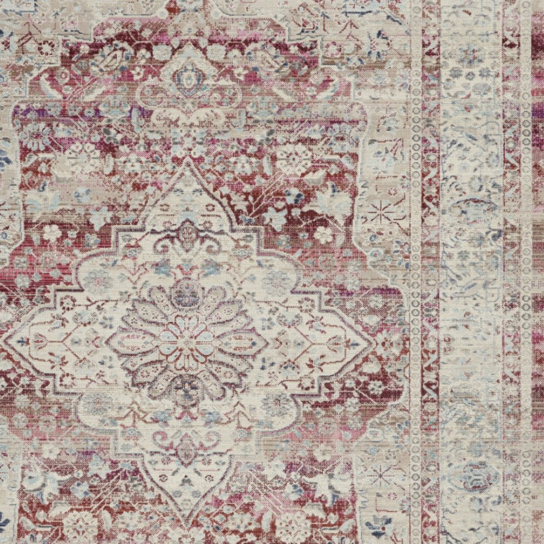- transitional style area rug in ivory, red, and brown for a worn faded look.