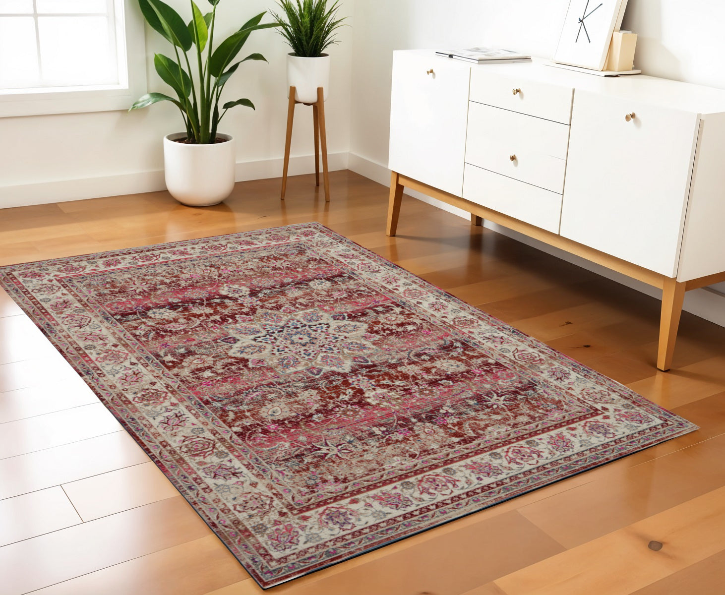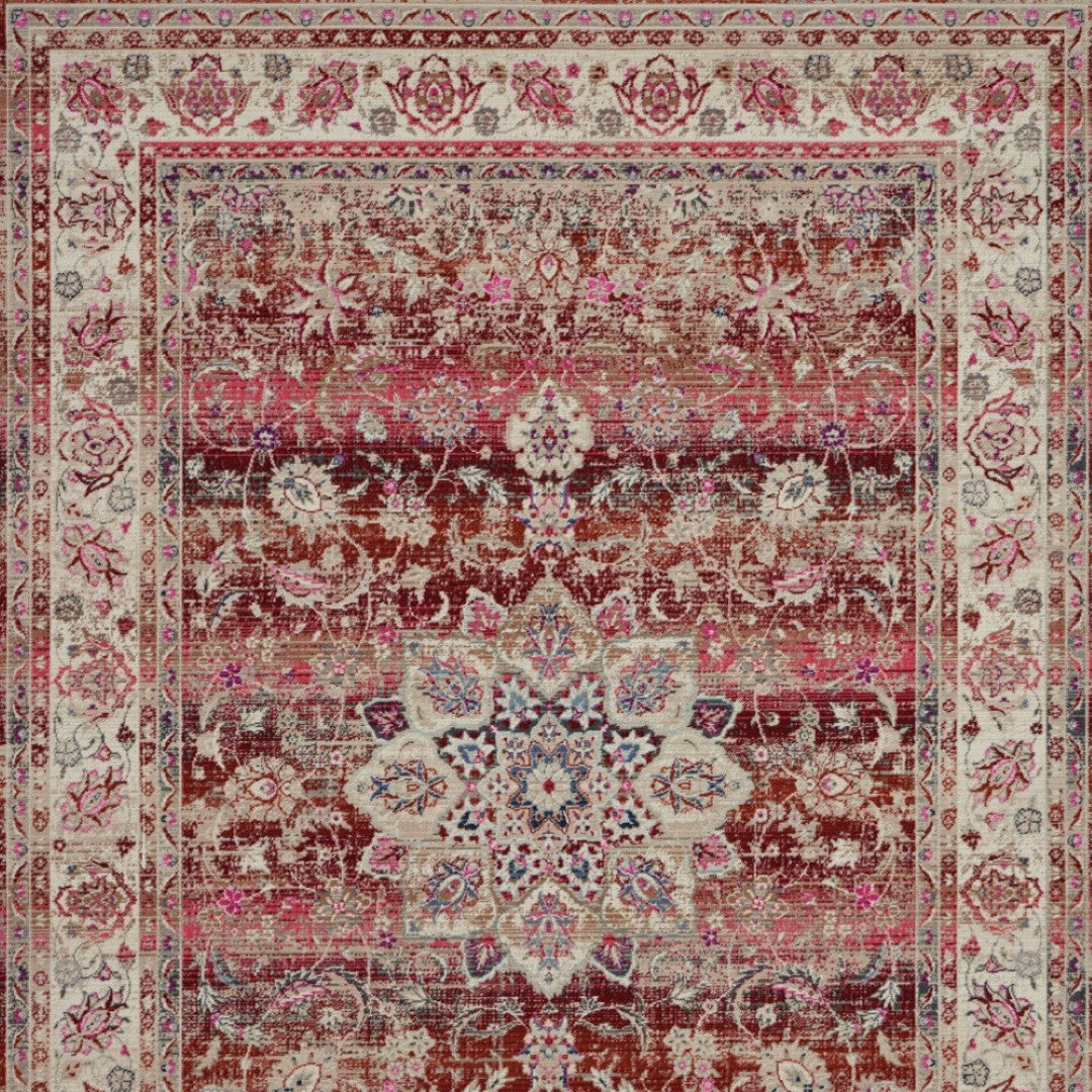 - Transitional style area rug in ivory and red color with a faded worn look.