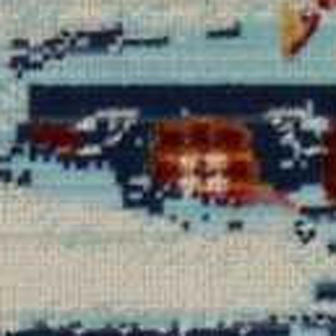 - Transitional style area rug in blue, red, and orange, with a worn faded look.