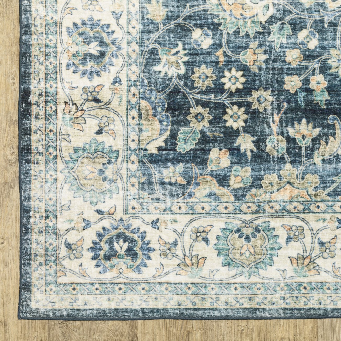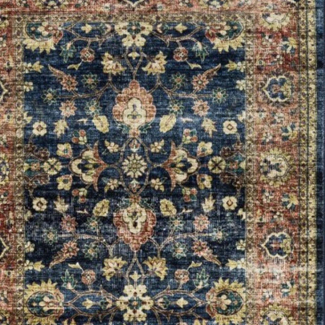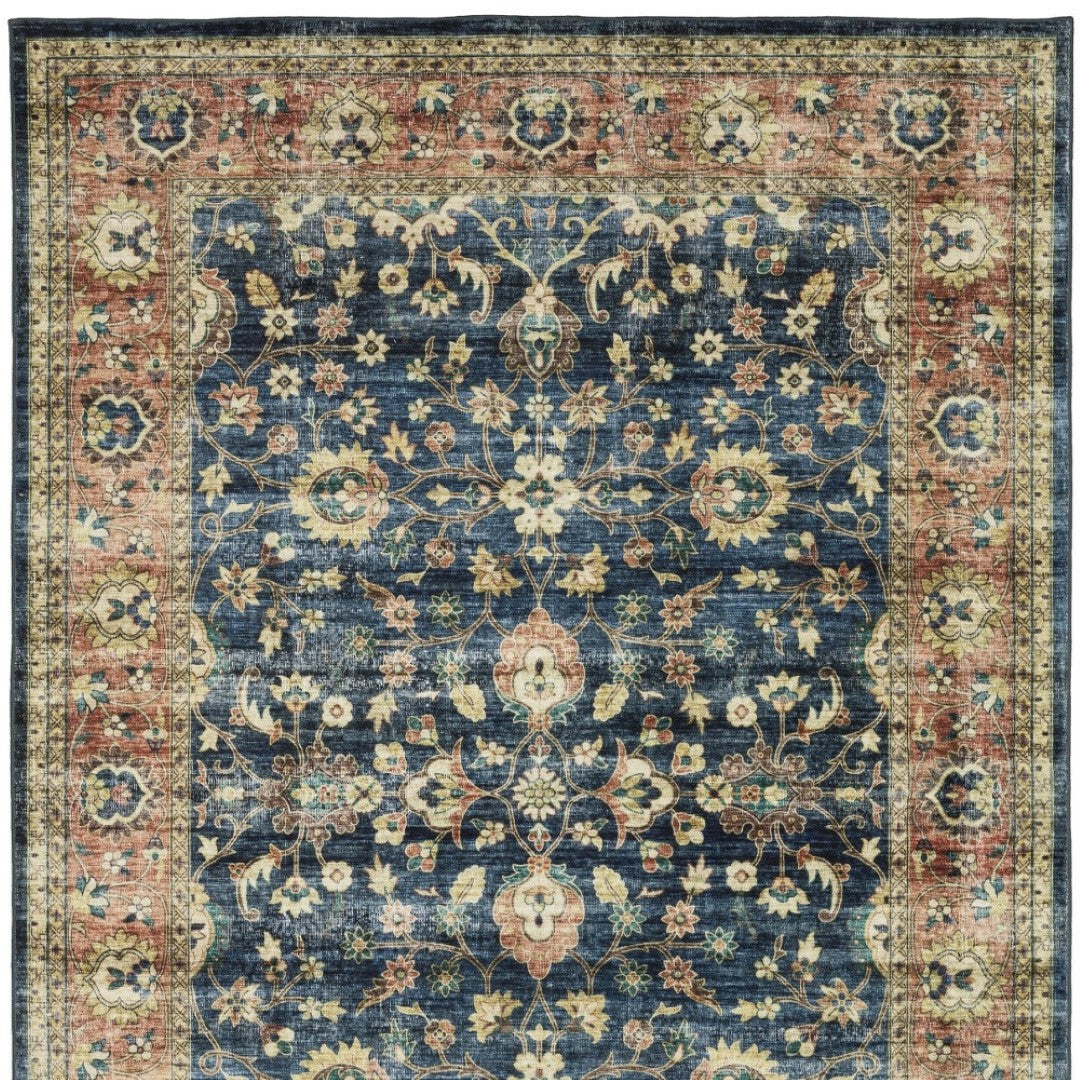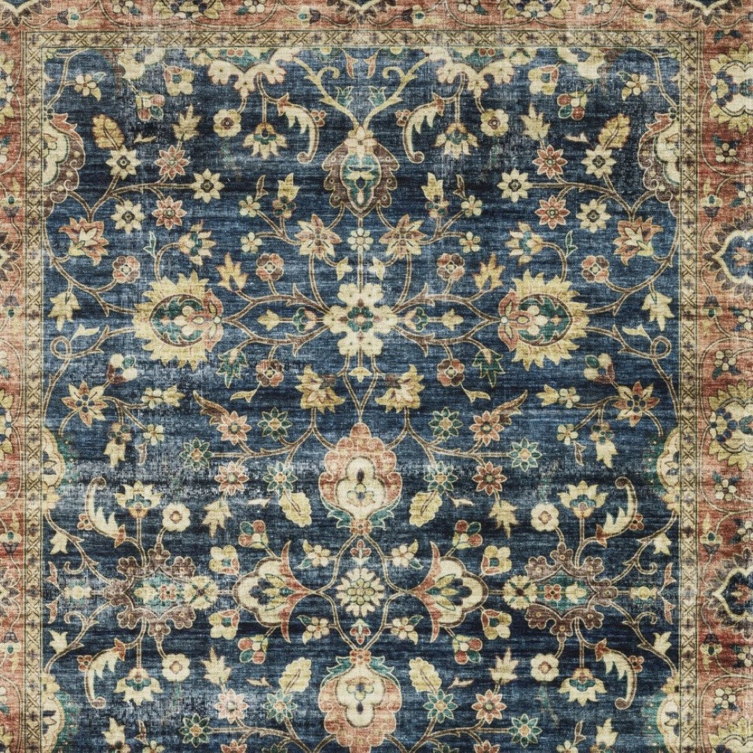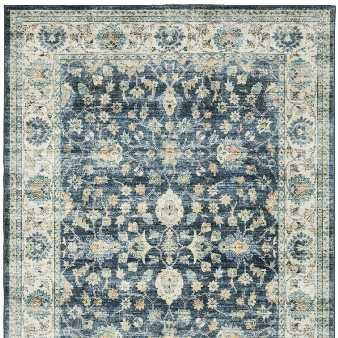 - Printed area rug in blue and ivory with a traditional style, ideal for the living room.