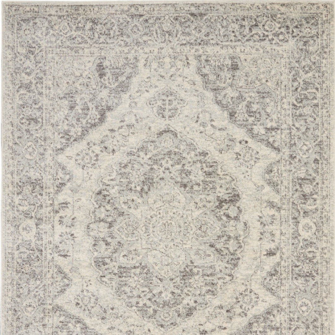 - Transitional ivory and gray area rug with worn faded distressing for the living room.