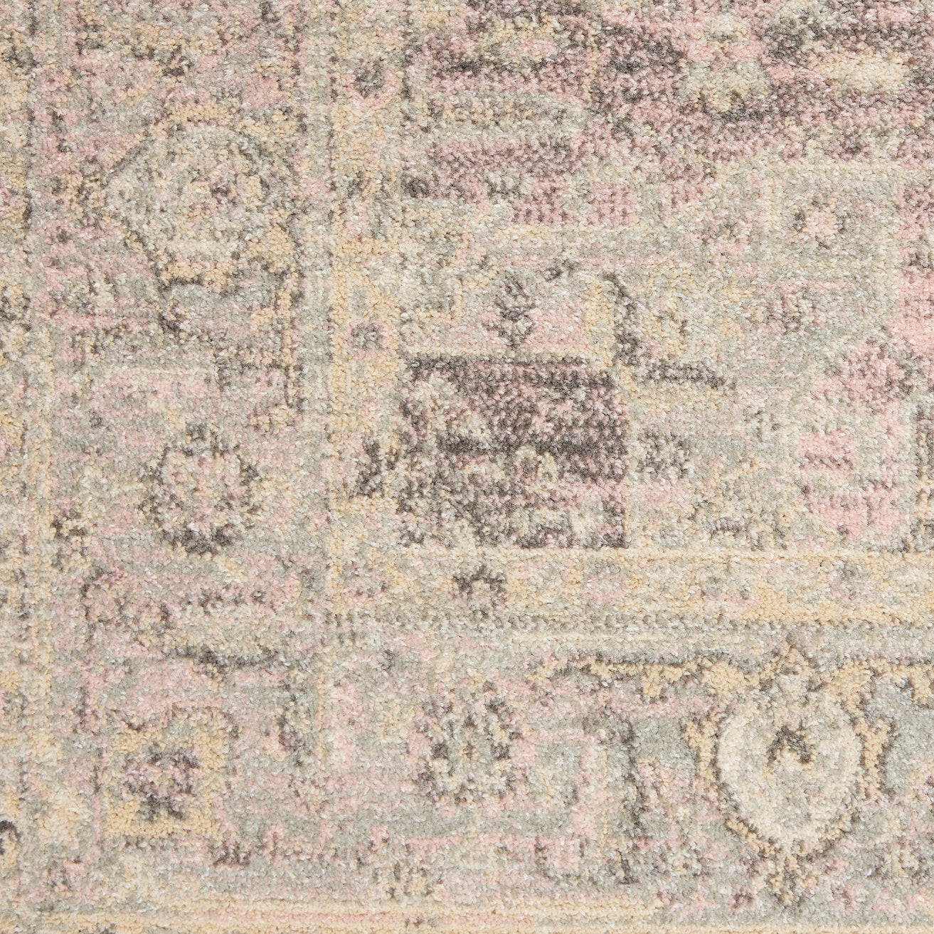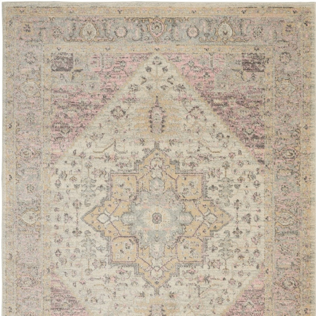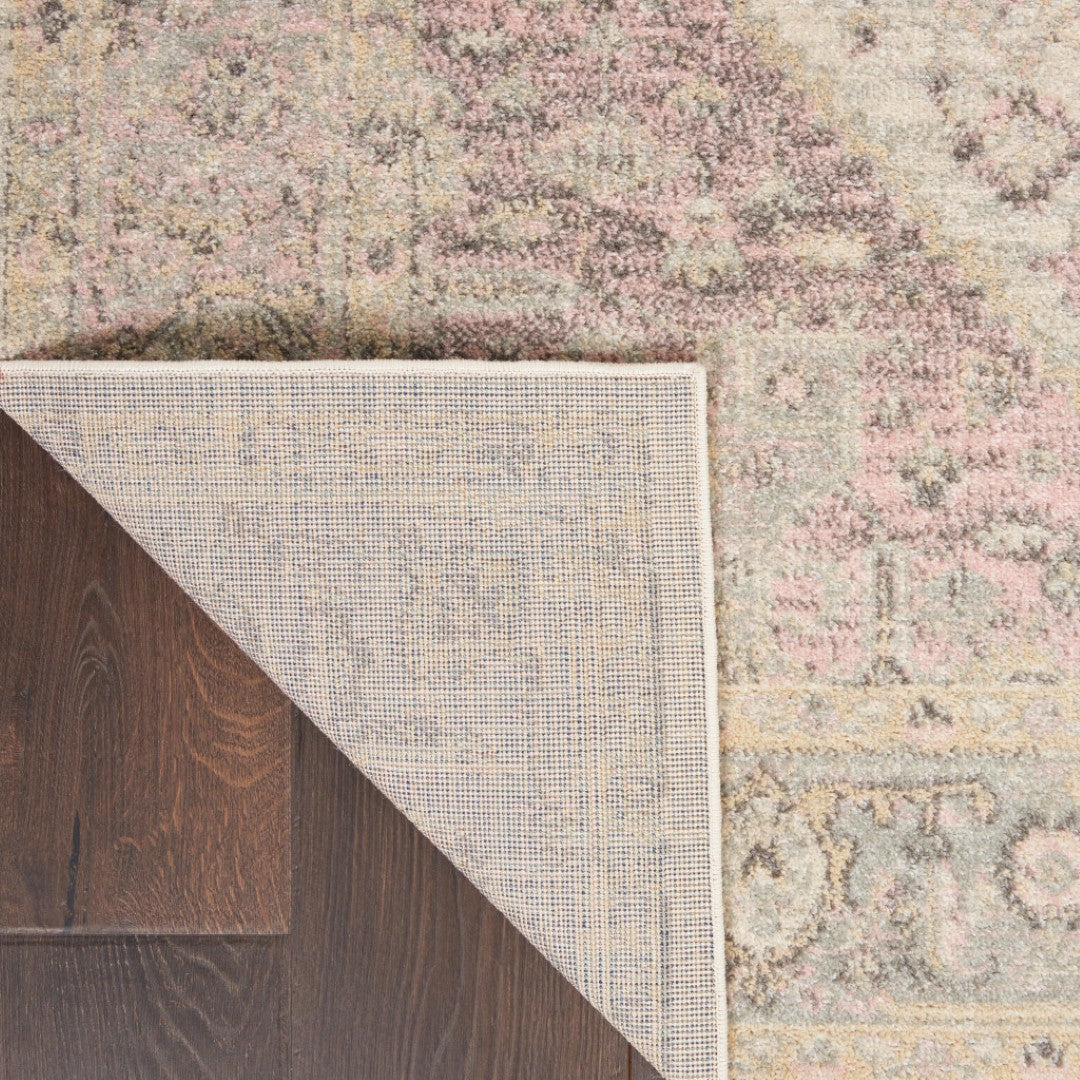 - Transitional ivory, pink, and gray area rug with worn, faded design for the living room.