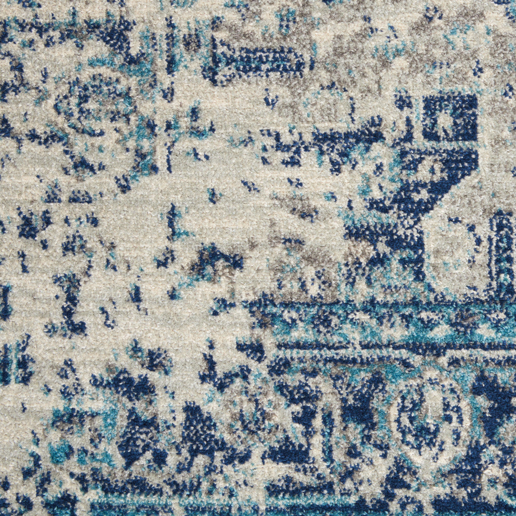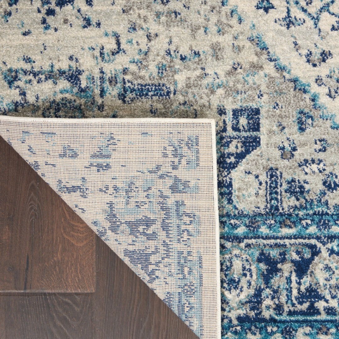 - Transitional style ivory and light blue area rug with a worn faded look, ideal for the living room.