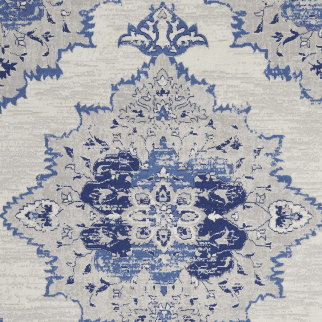 - Bohemian style area rug in ivory and blue with a worn faded look.