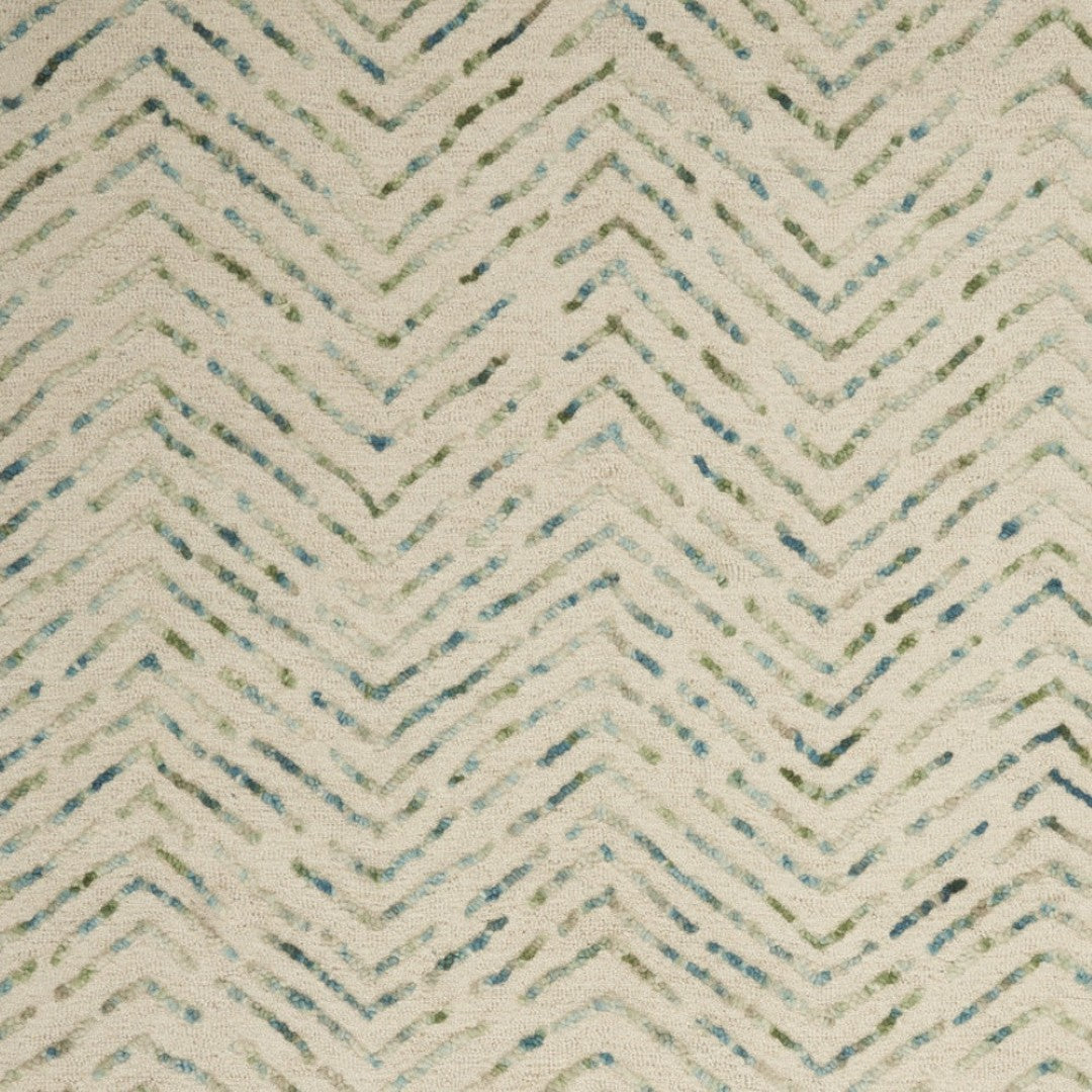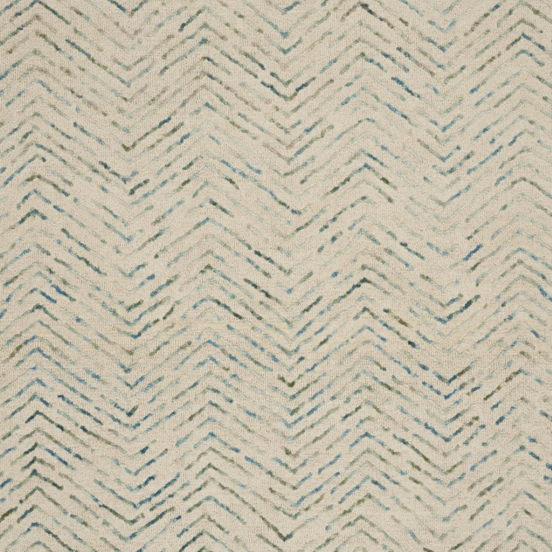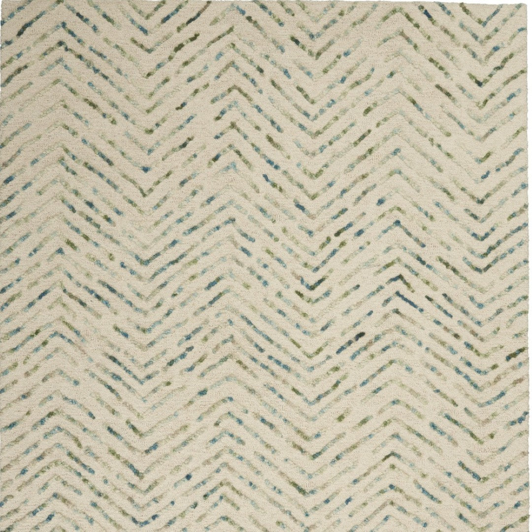 - modern ivory, blue, and green machine-made area rug suitable for the living room, easy to vacuum without a beater bar/rotating brush.