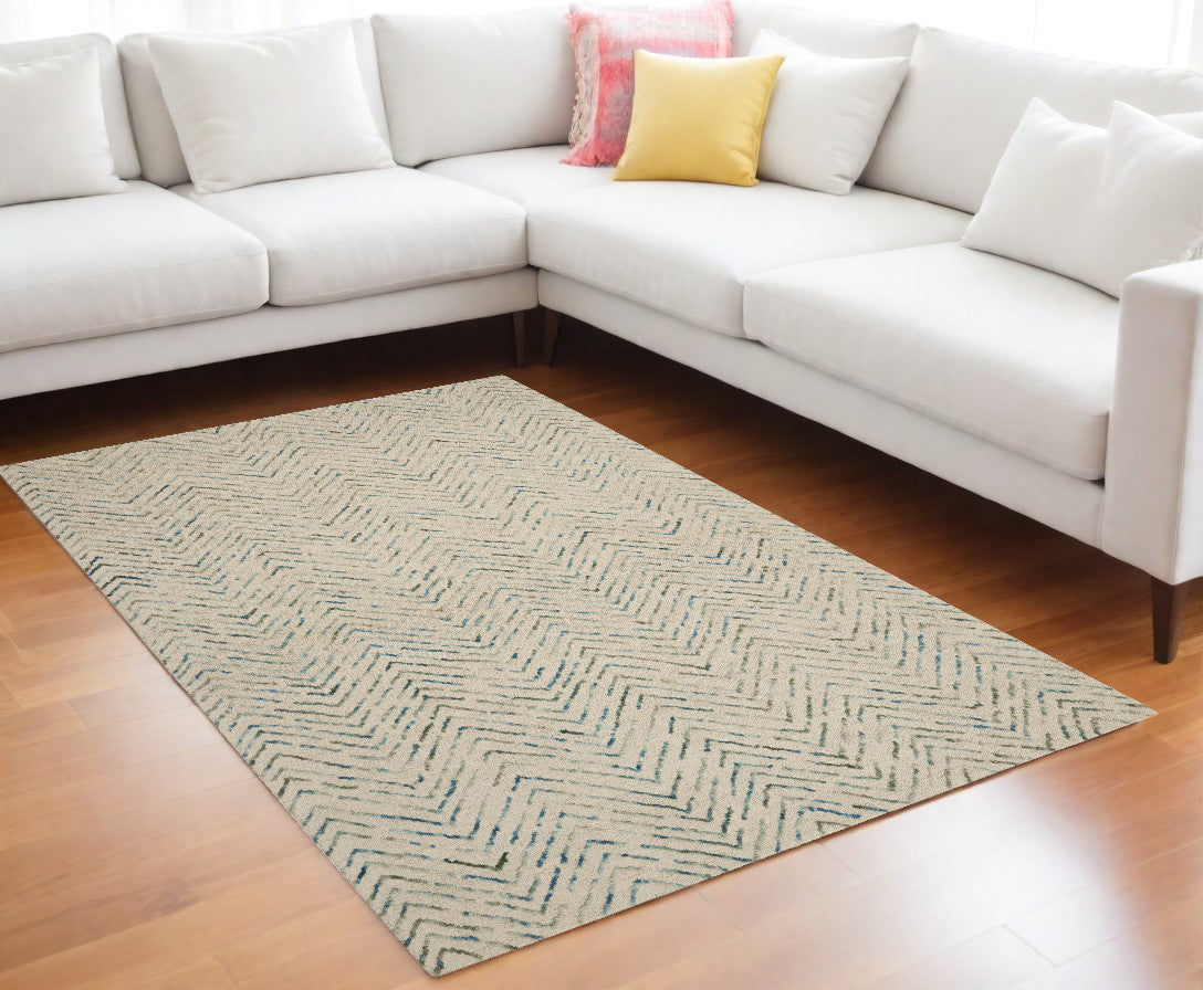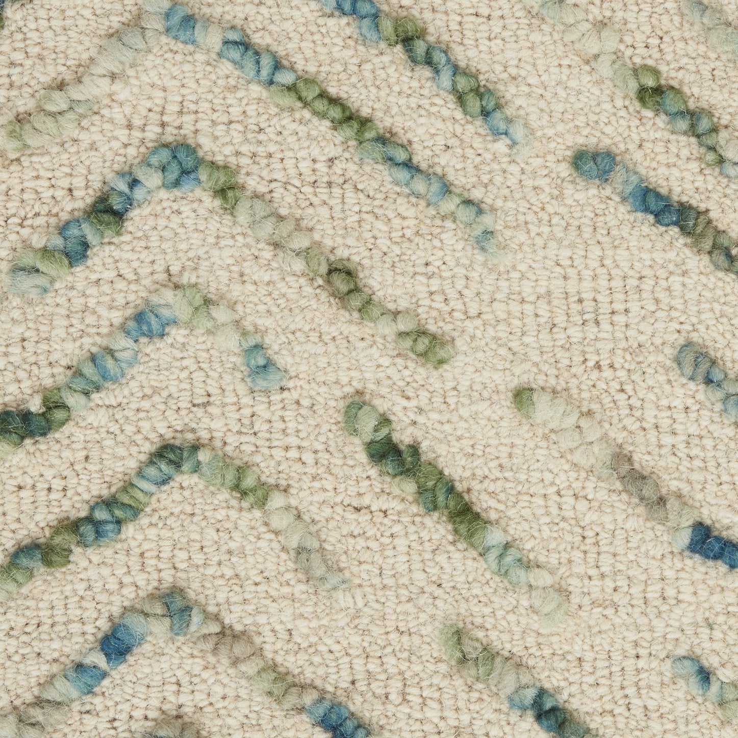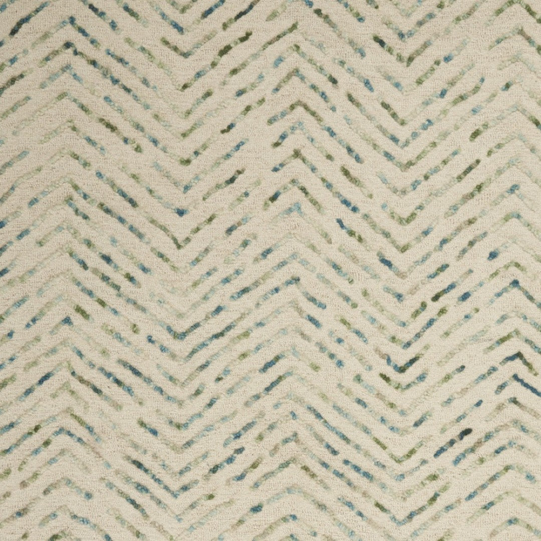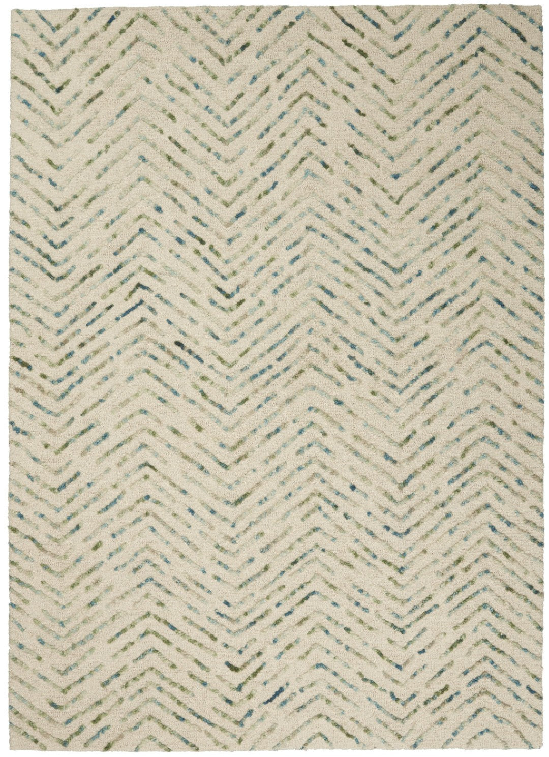 - modern ivory, blue, and green machine-made area rug suitable for the living room, easy to vacuum without a beater bar/rotating brush.