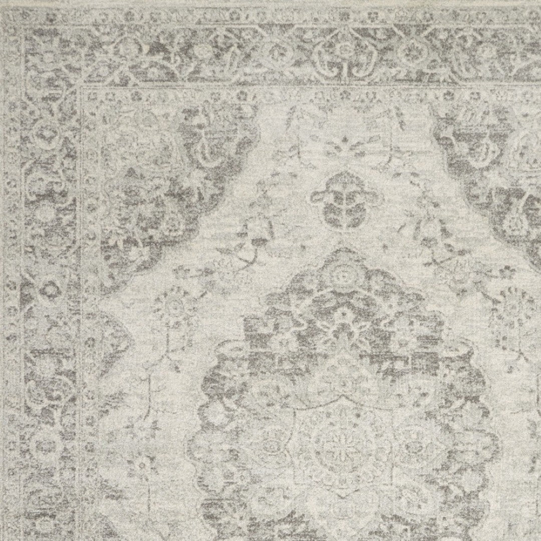 - Transitional ivory and gray area rug with worn faded distressing for the living room.