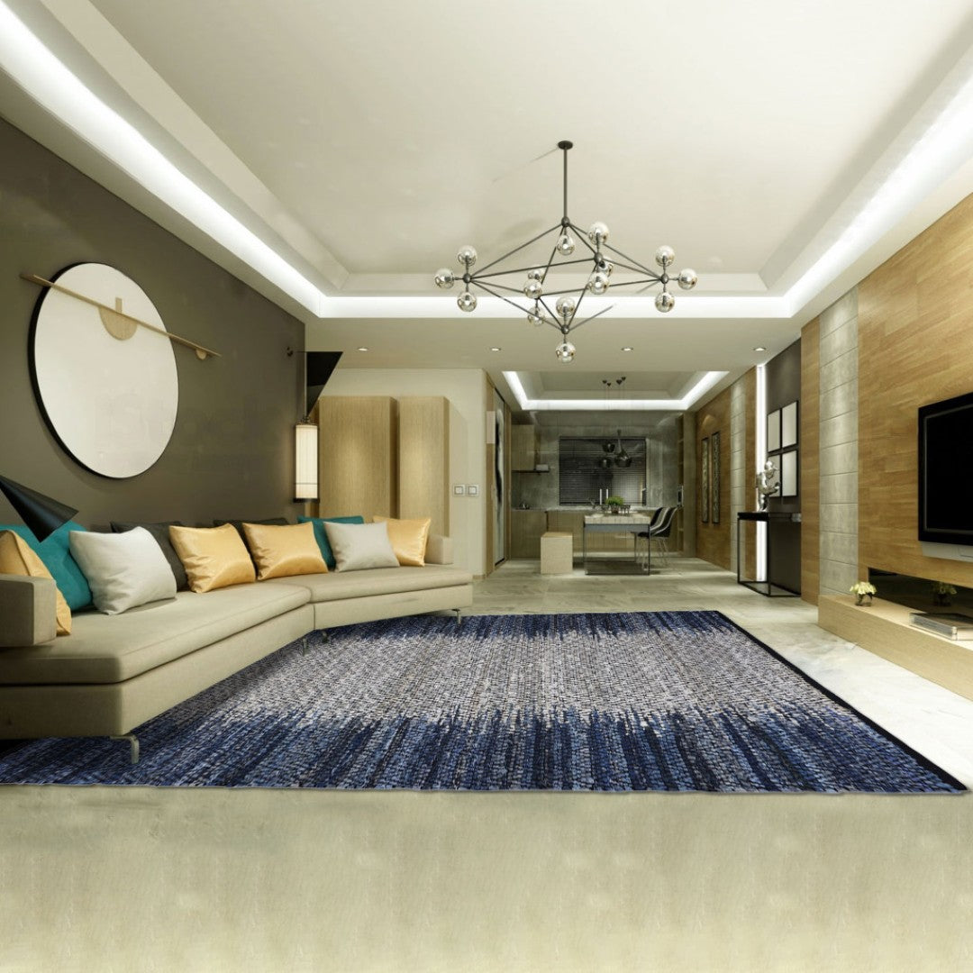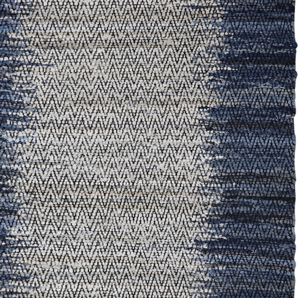 - Handmade area rug crafted from a cotton blend material in a modern blue color palette.