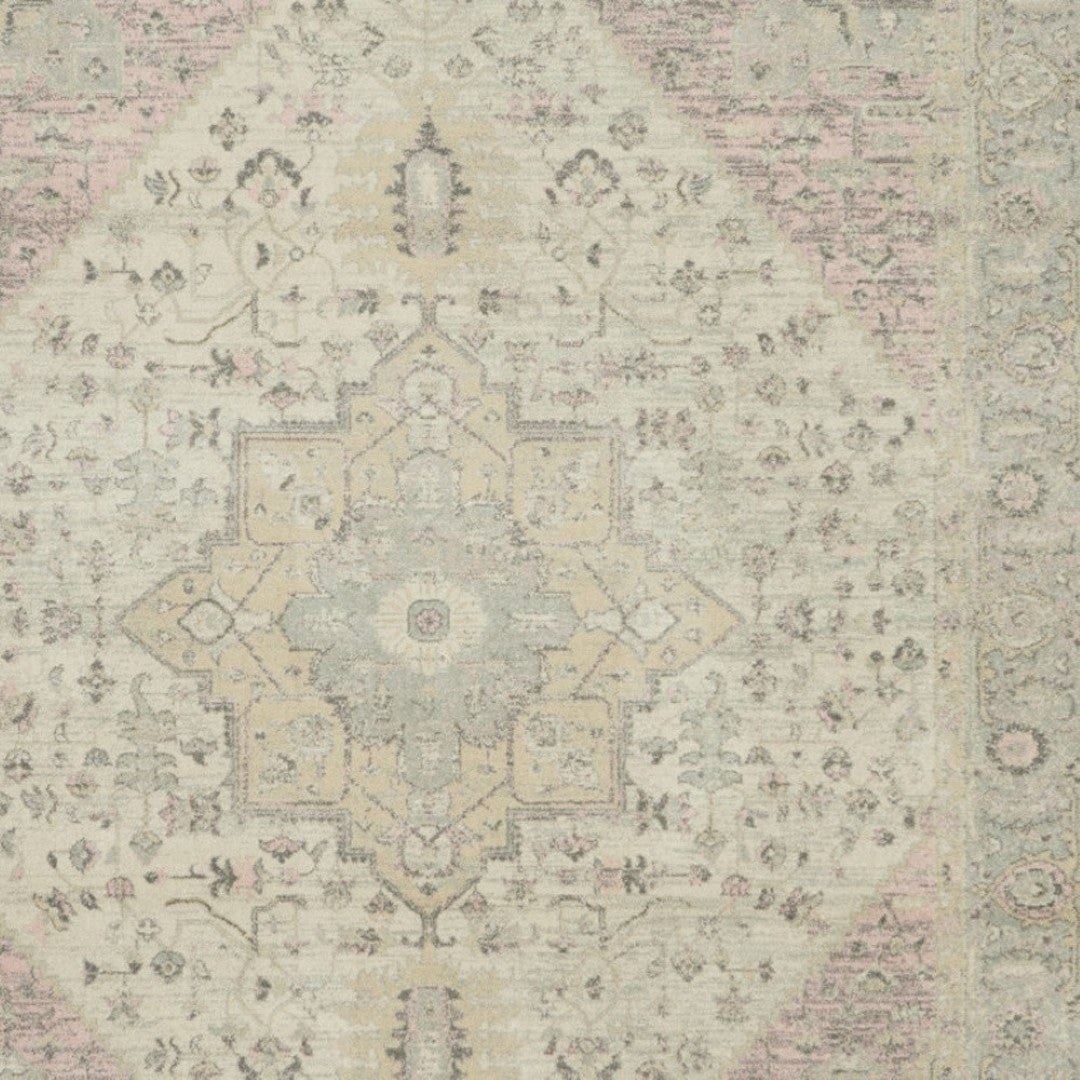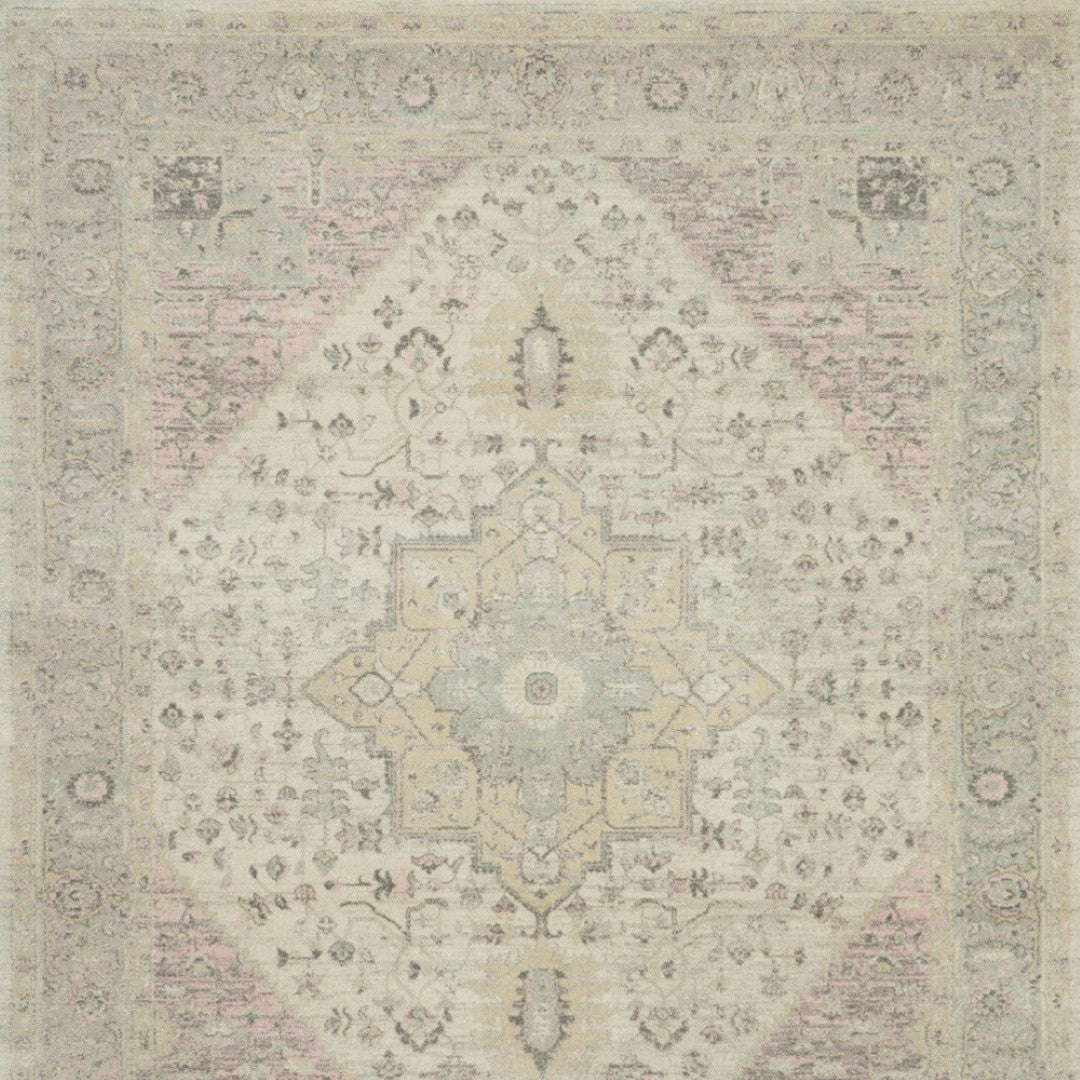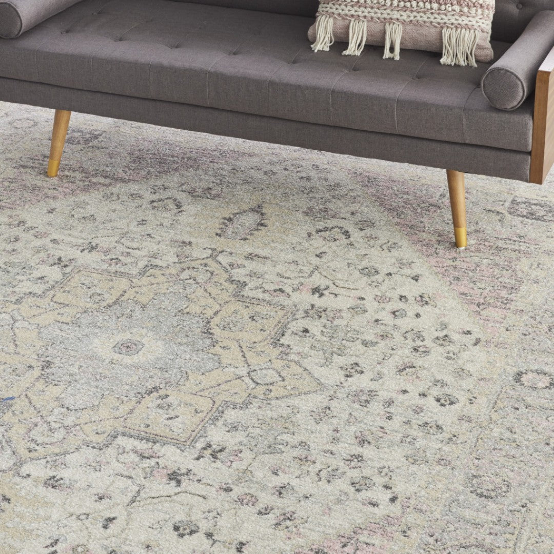 - Transitional style area rug in ivory, pink, and gray colors with a worn faded design.