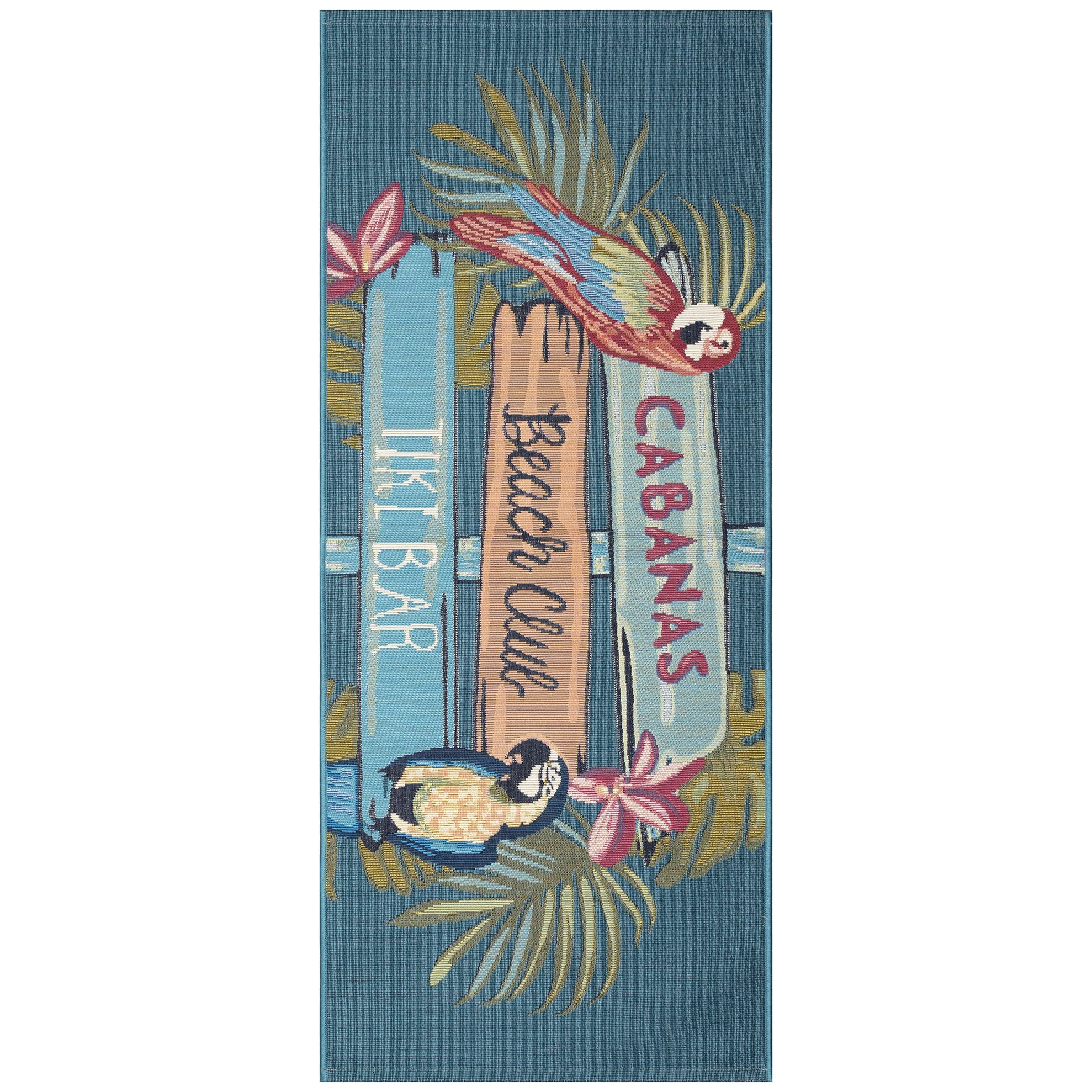 - Designed with a deep turquoise background accented with vibrant red, bule and yellow parrots and bright signs