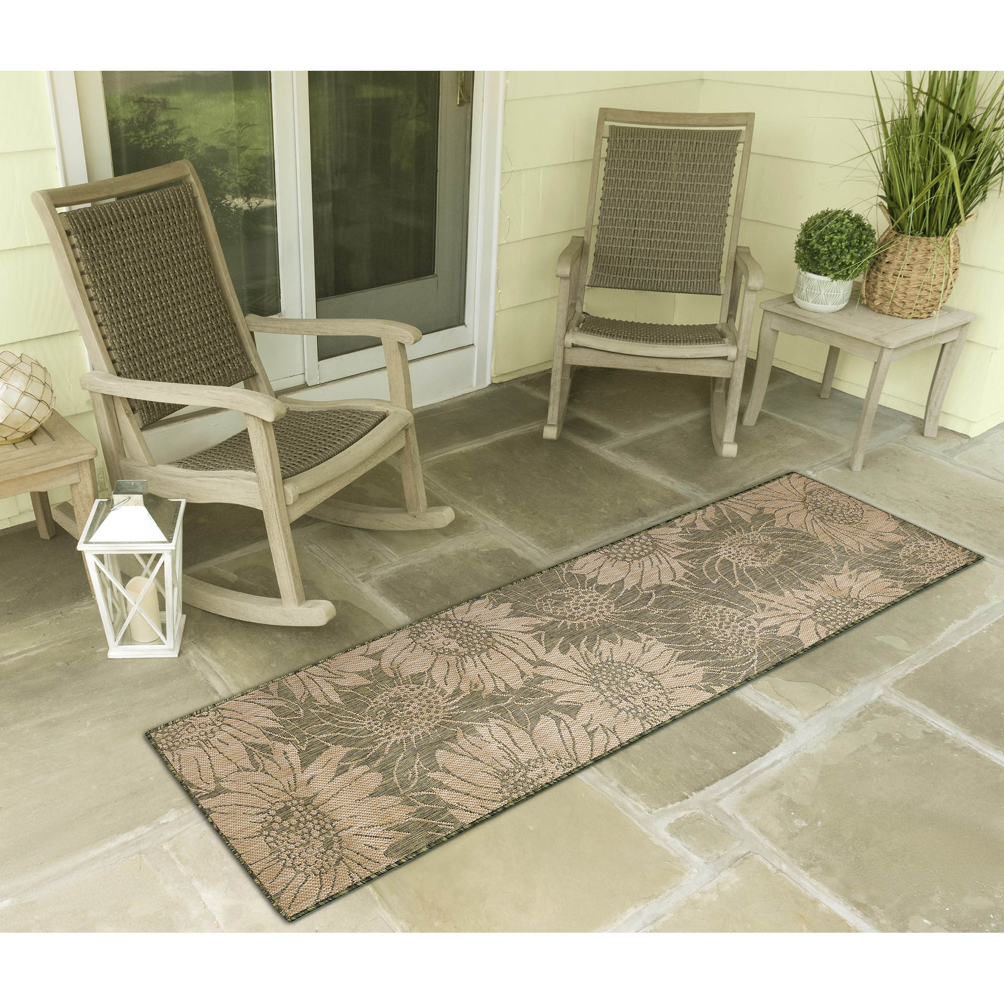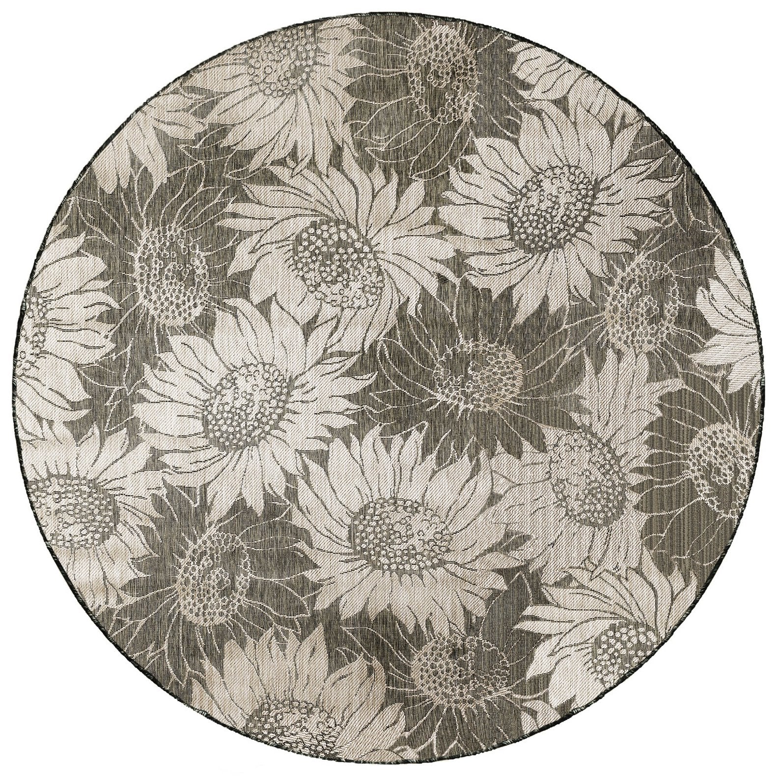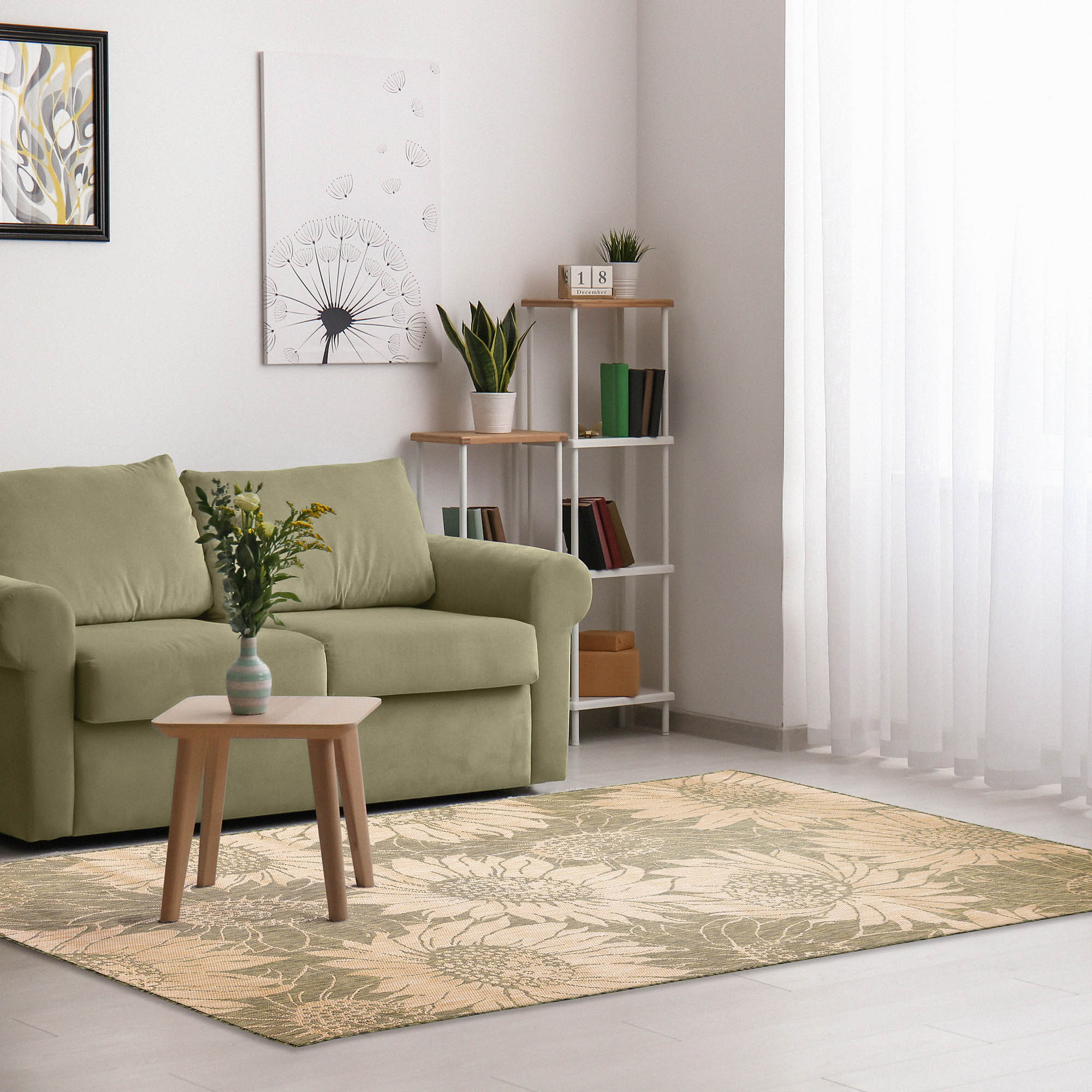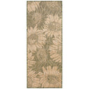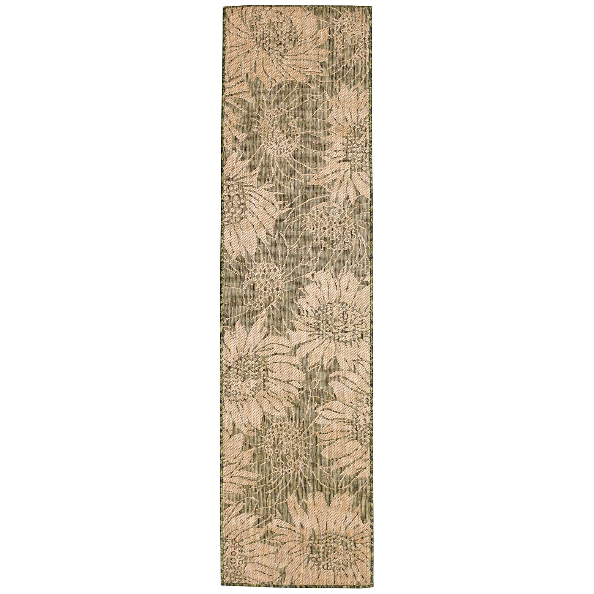 - This decorative area rug features oversized sunflower blossoms in sand on a green background,