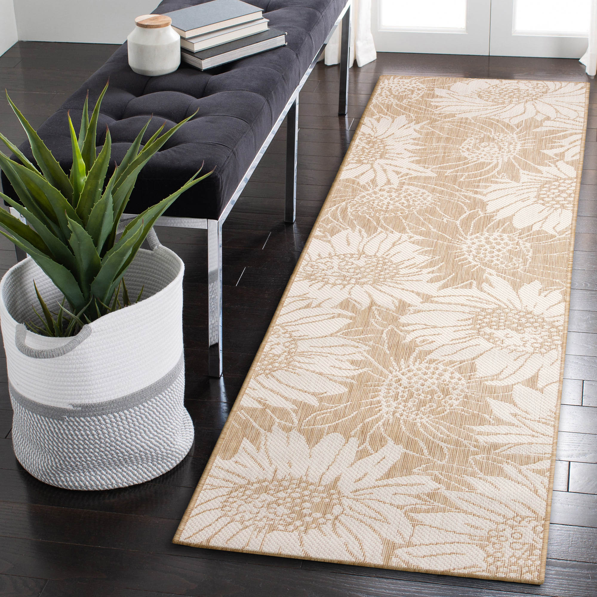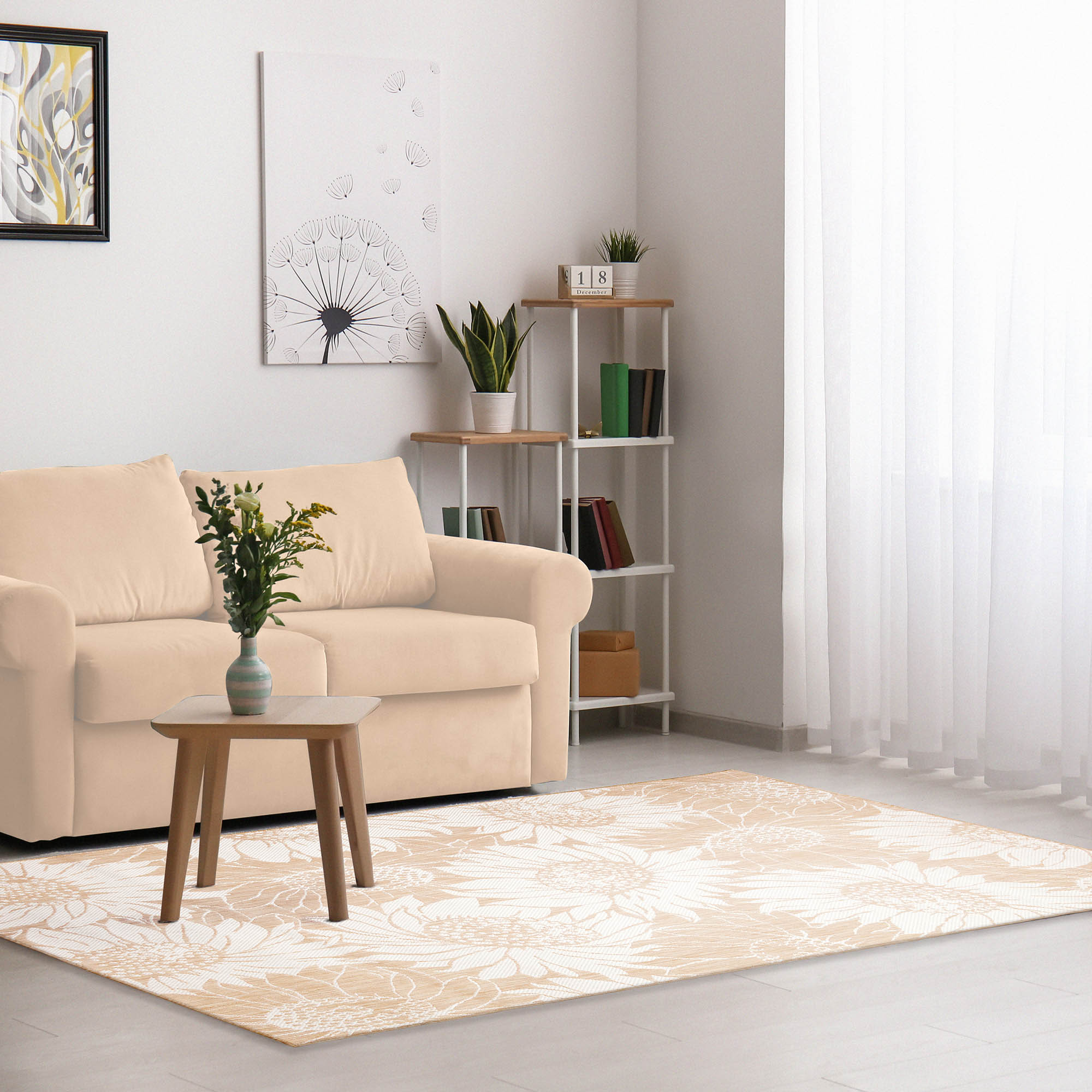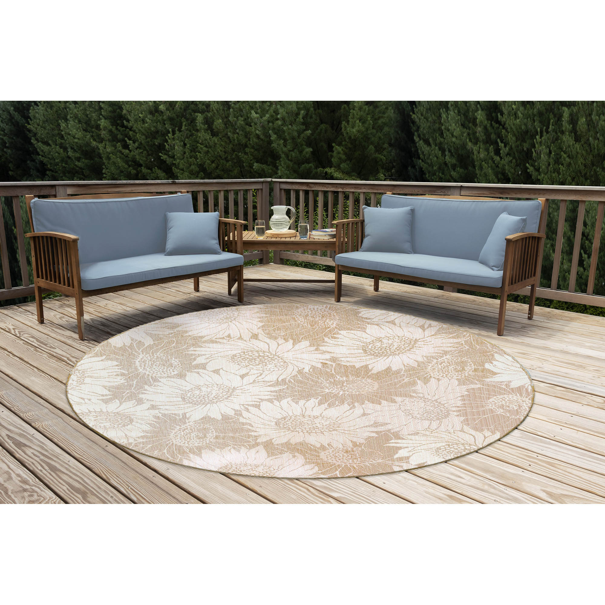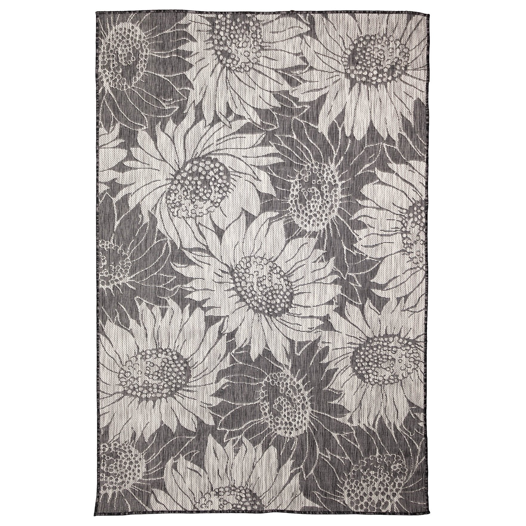 - This decorative area rug features oversized sunflower blossoms in sand on a green background,