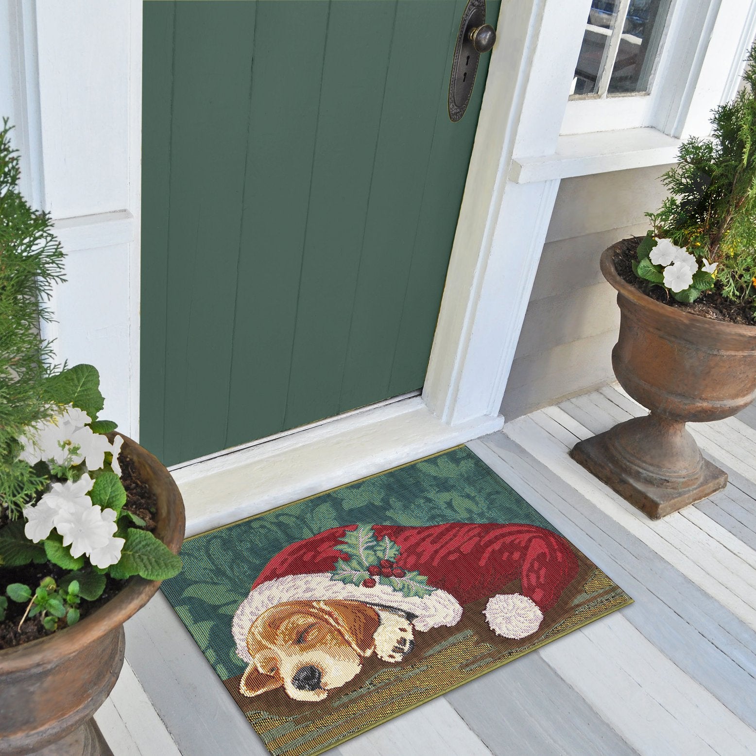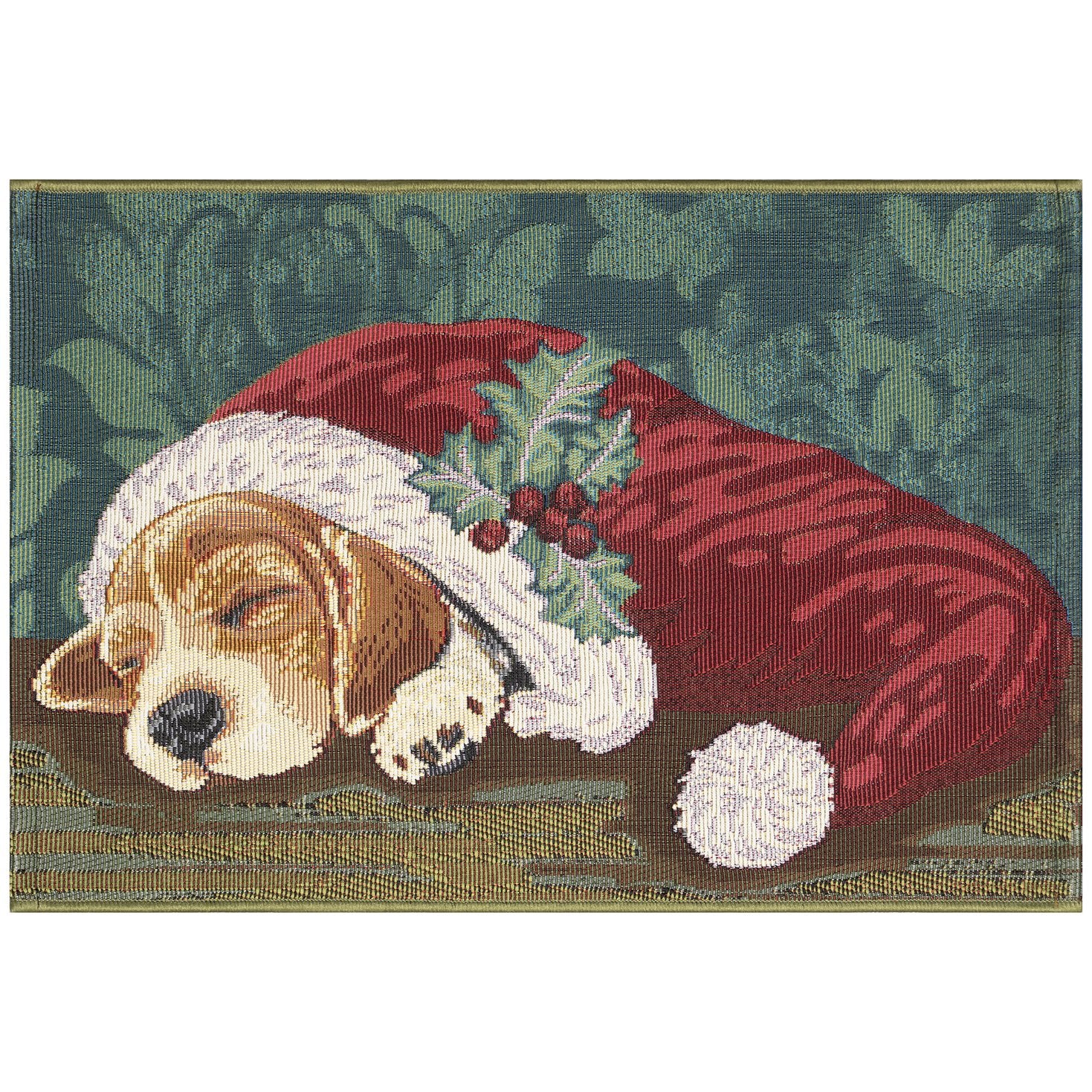 - Designed with a brown and white puppy snug in a red Santa hat with holiday greens as the background