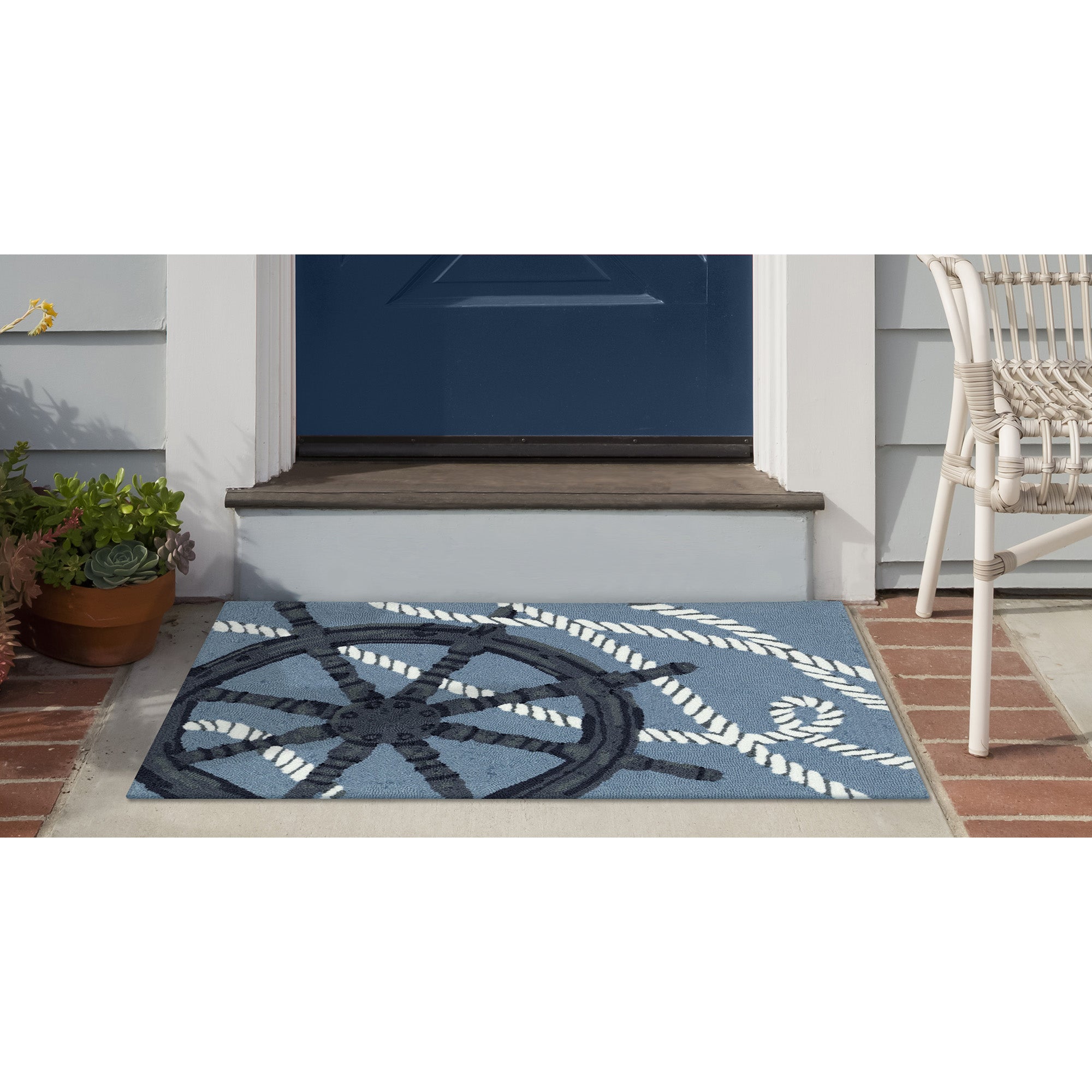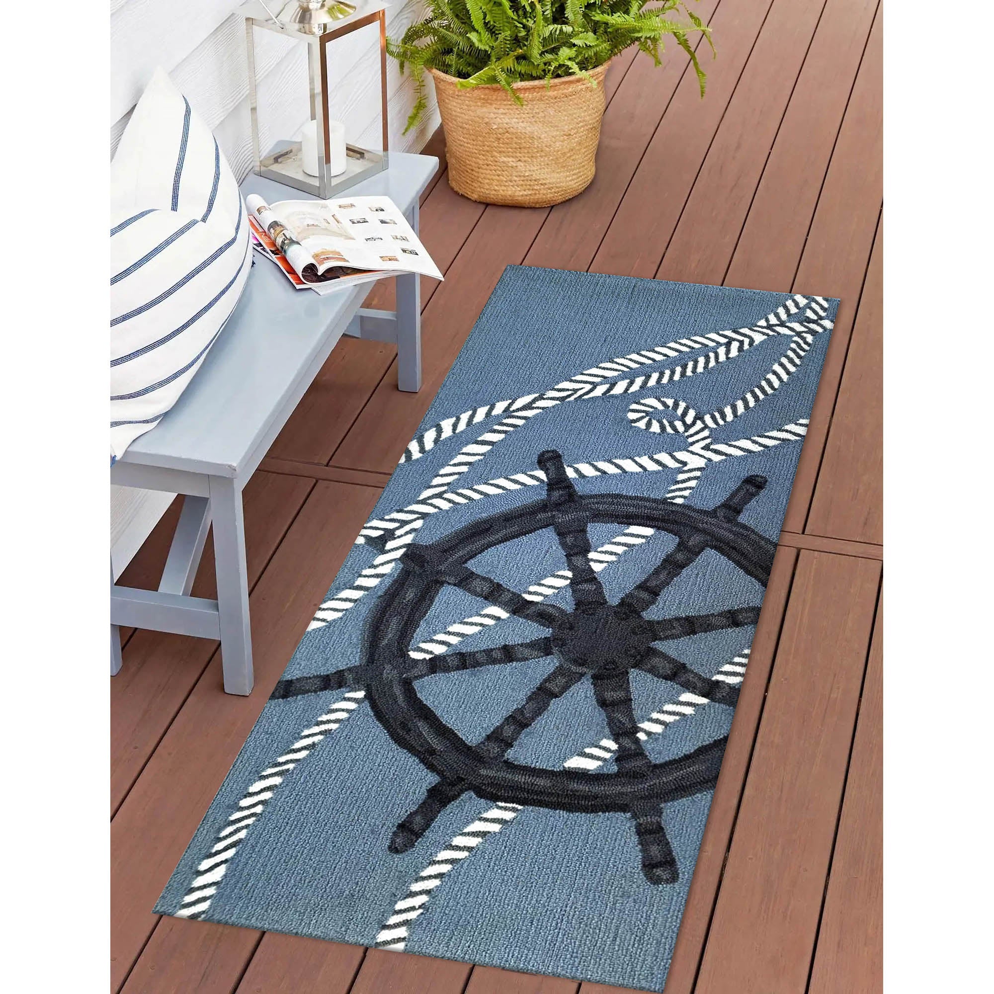 - Features a sports Decorative Transitional Contemporary Novelty All-Purpose Nautical Coastal mat with a shipwheel draped in white rope
