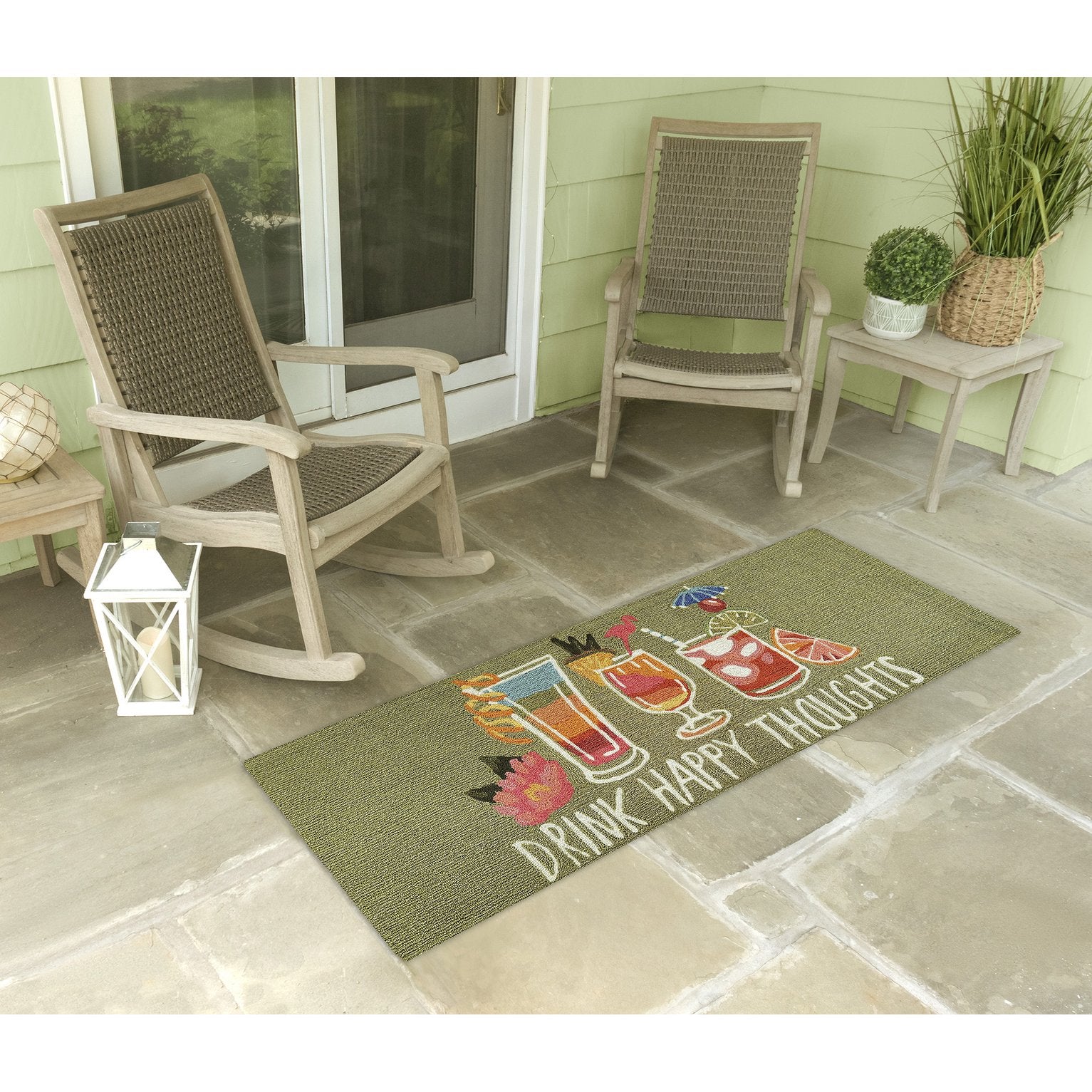 - Multicolor drinks on a green background with white letters saying "drink happy thoughts"