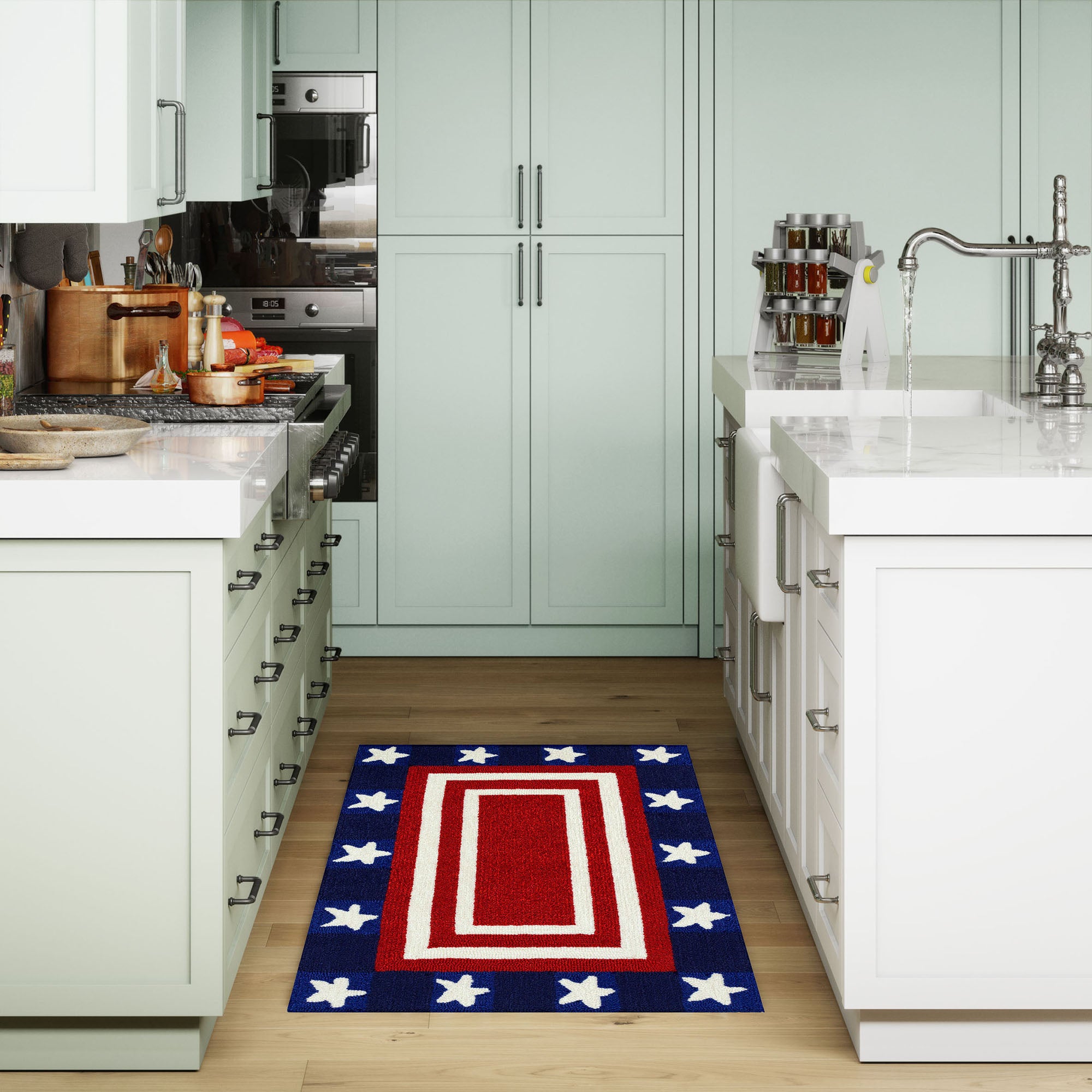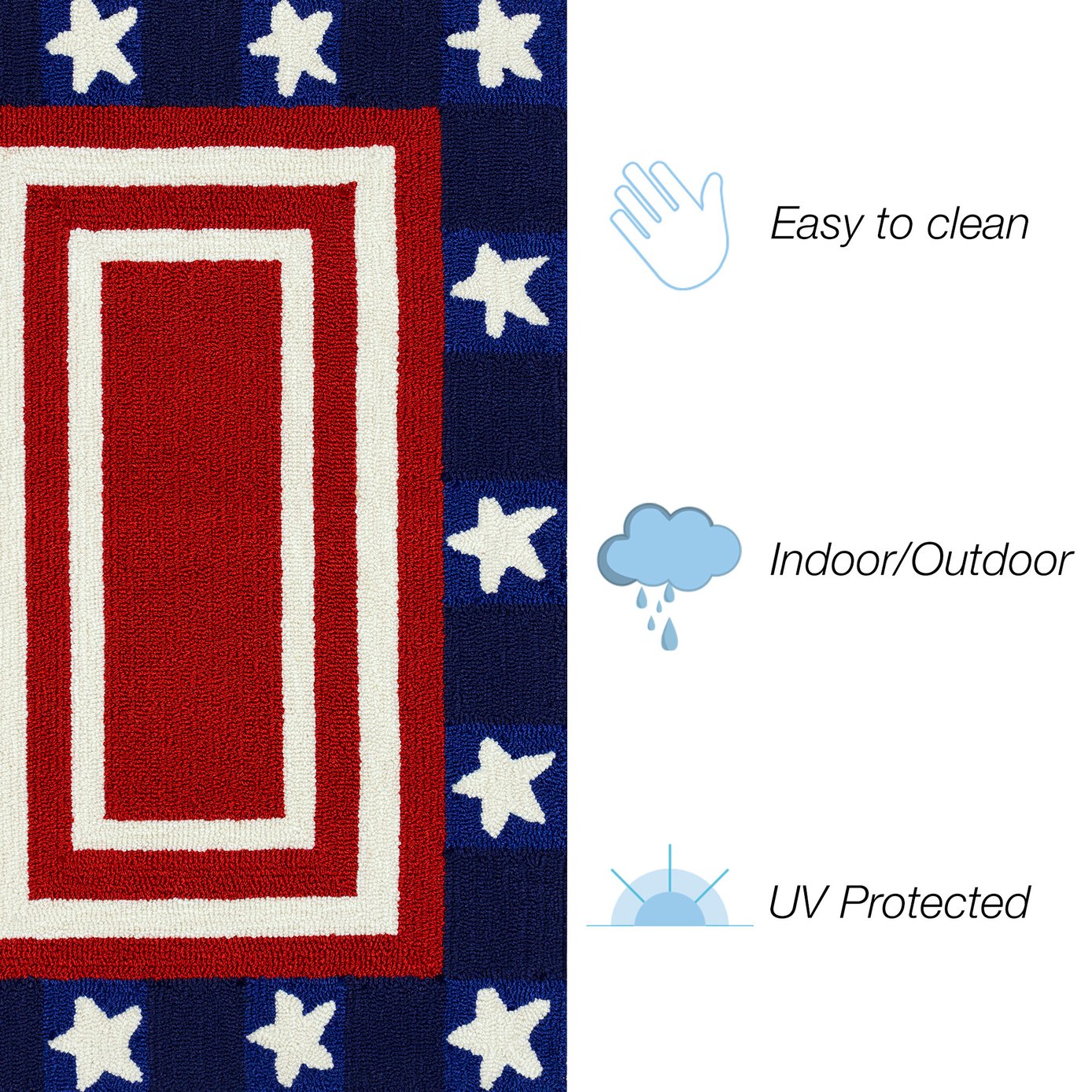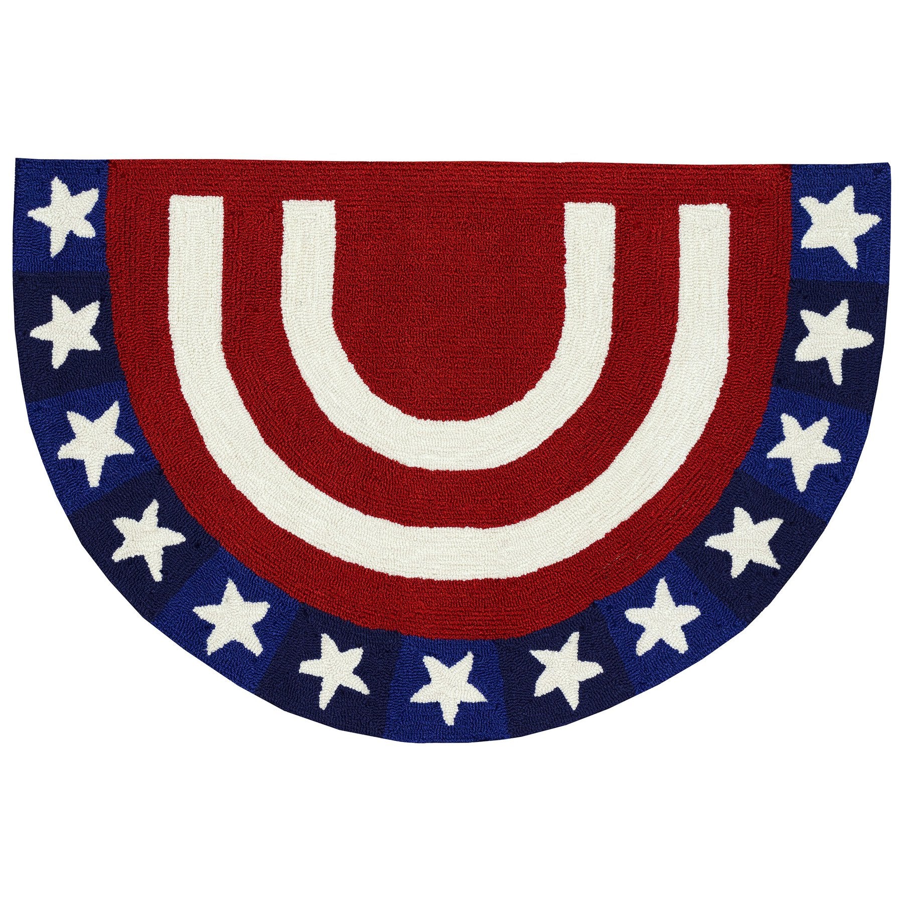 - This Transitional casual novelty features a colorful red center outlined with a decorative white striped border surrounded by white stars on a navy background