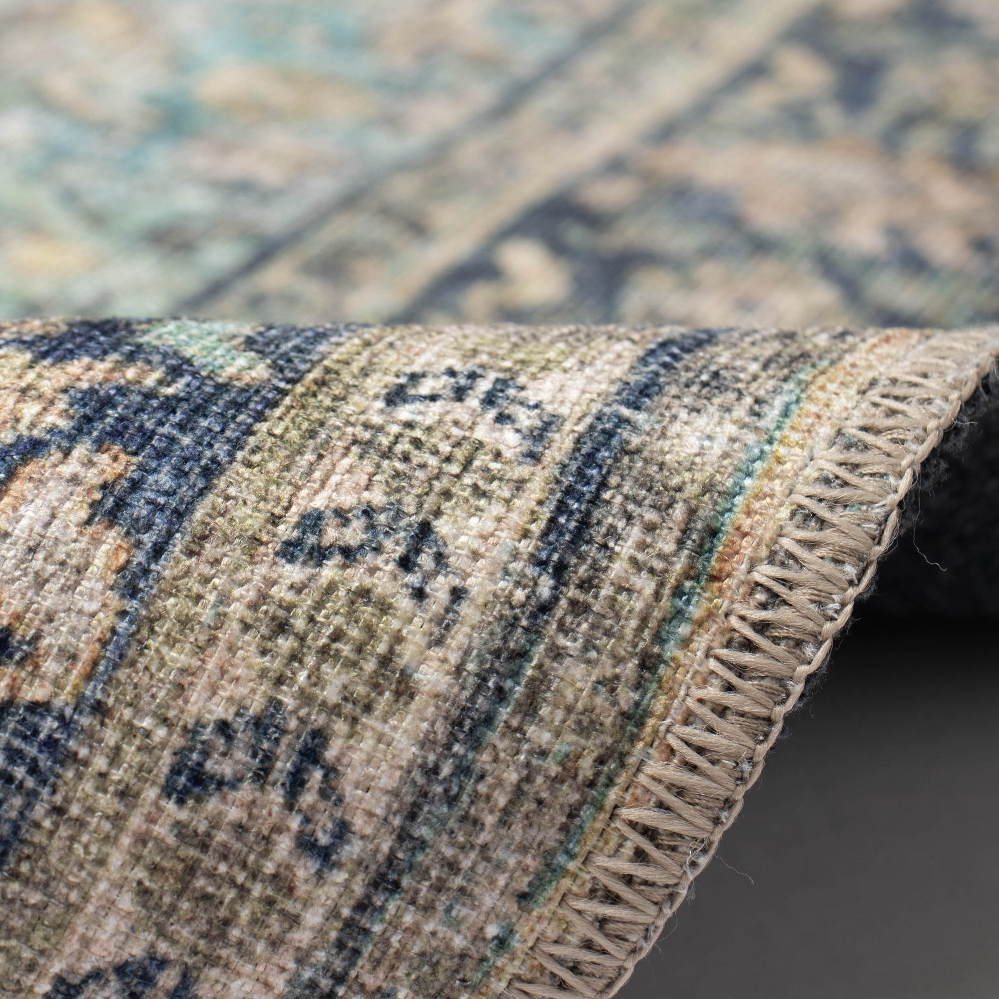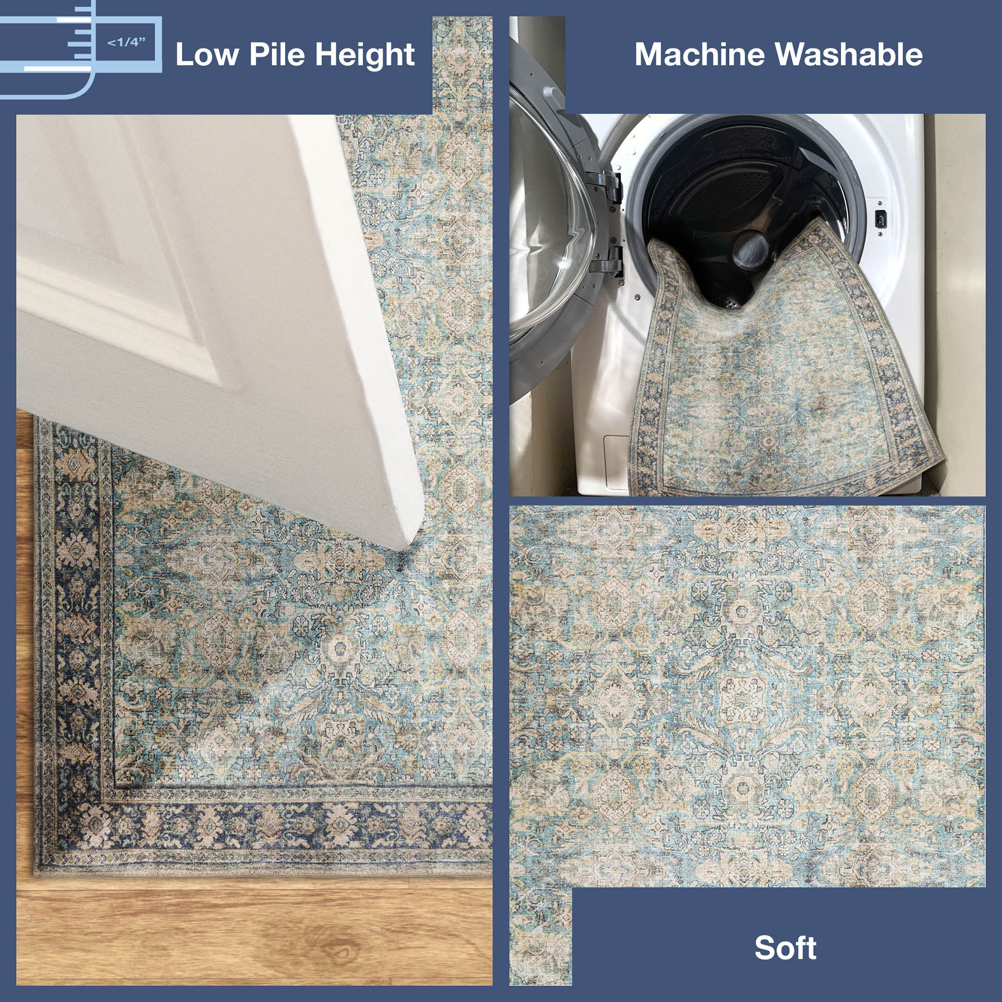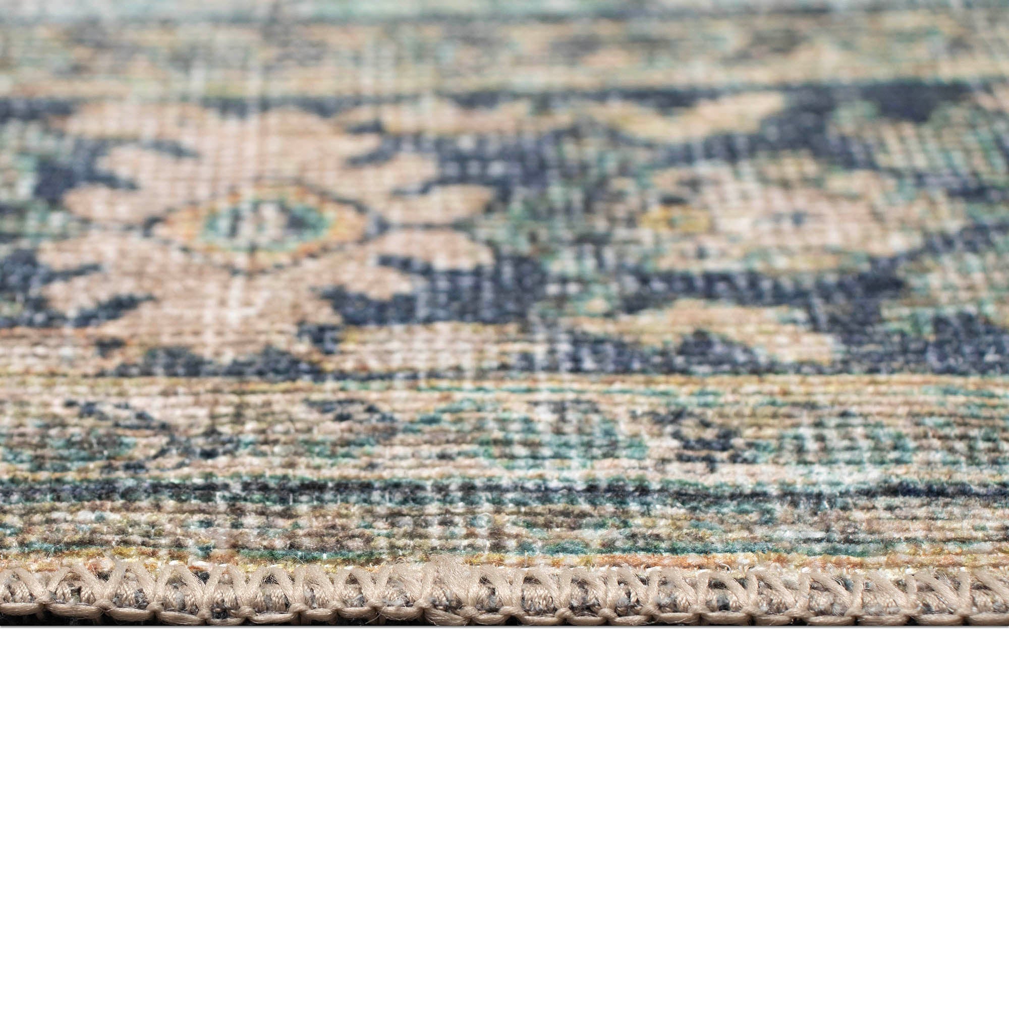 - Designed with center medallions surrounded by floral motifs and vine scrolls in multicolor aqua, navy and ivory
