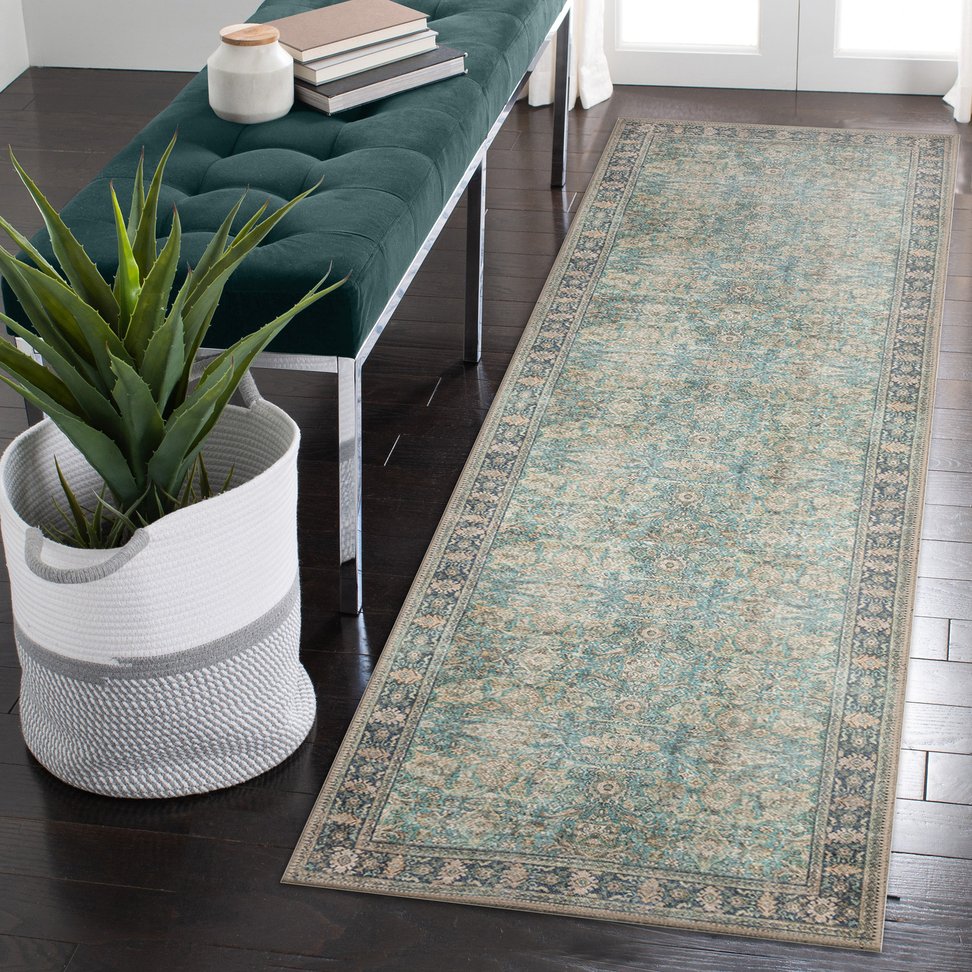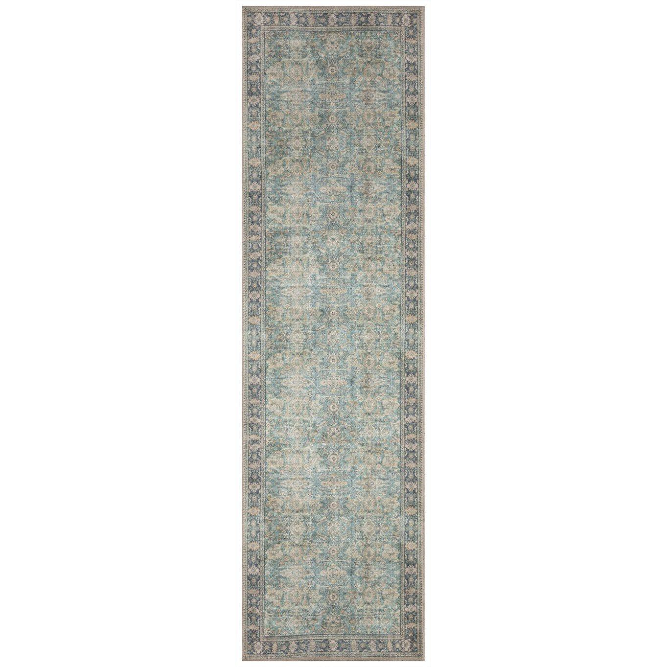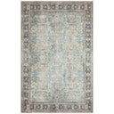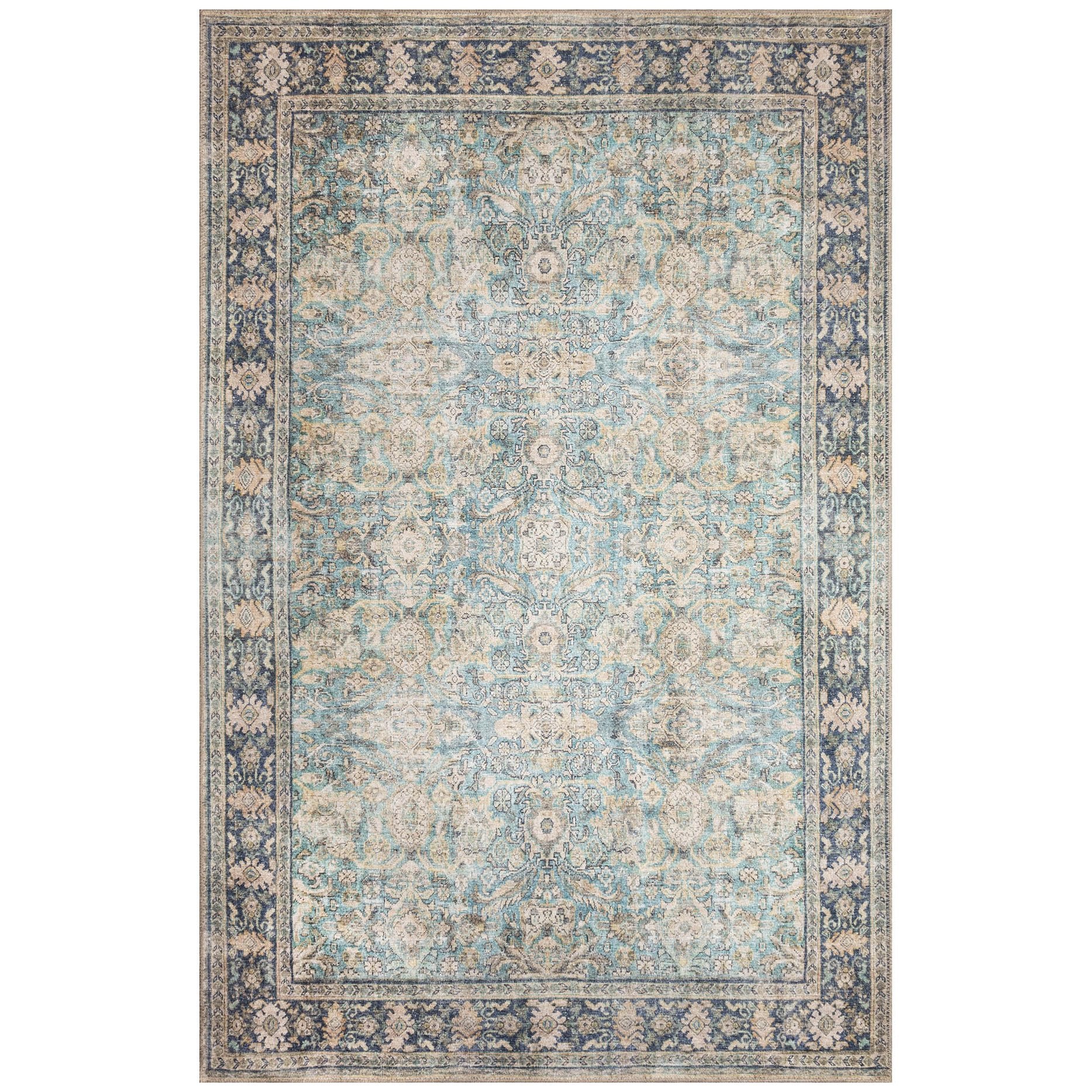 - Designed with center medallions surrounded by floral motifs and vine scrolls in multicolor aqua, navy and ivory