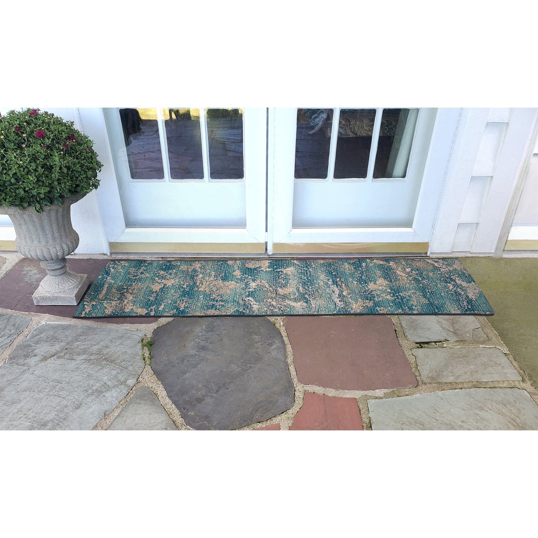 - Features a Transitional All-Purpose Global design in aqua and ivory