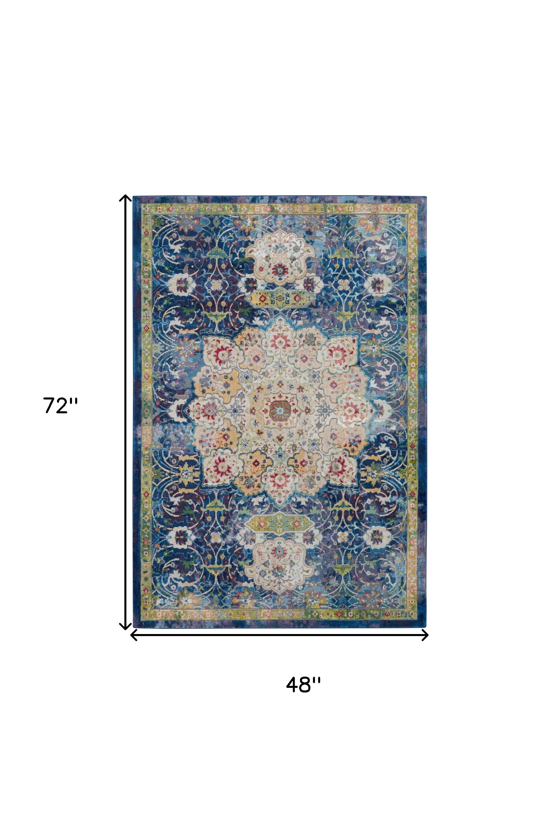 - Traditional navy blue and gold area rug with a worn faded look, ideal for the living room.