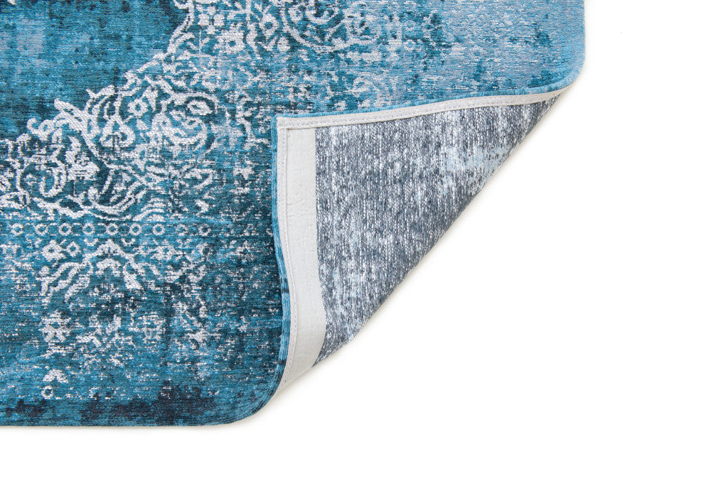 - Machine-made blue and white area rug.