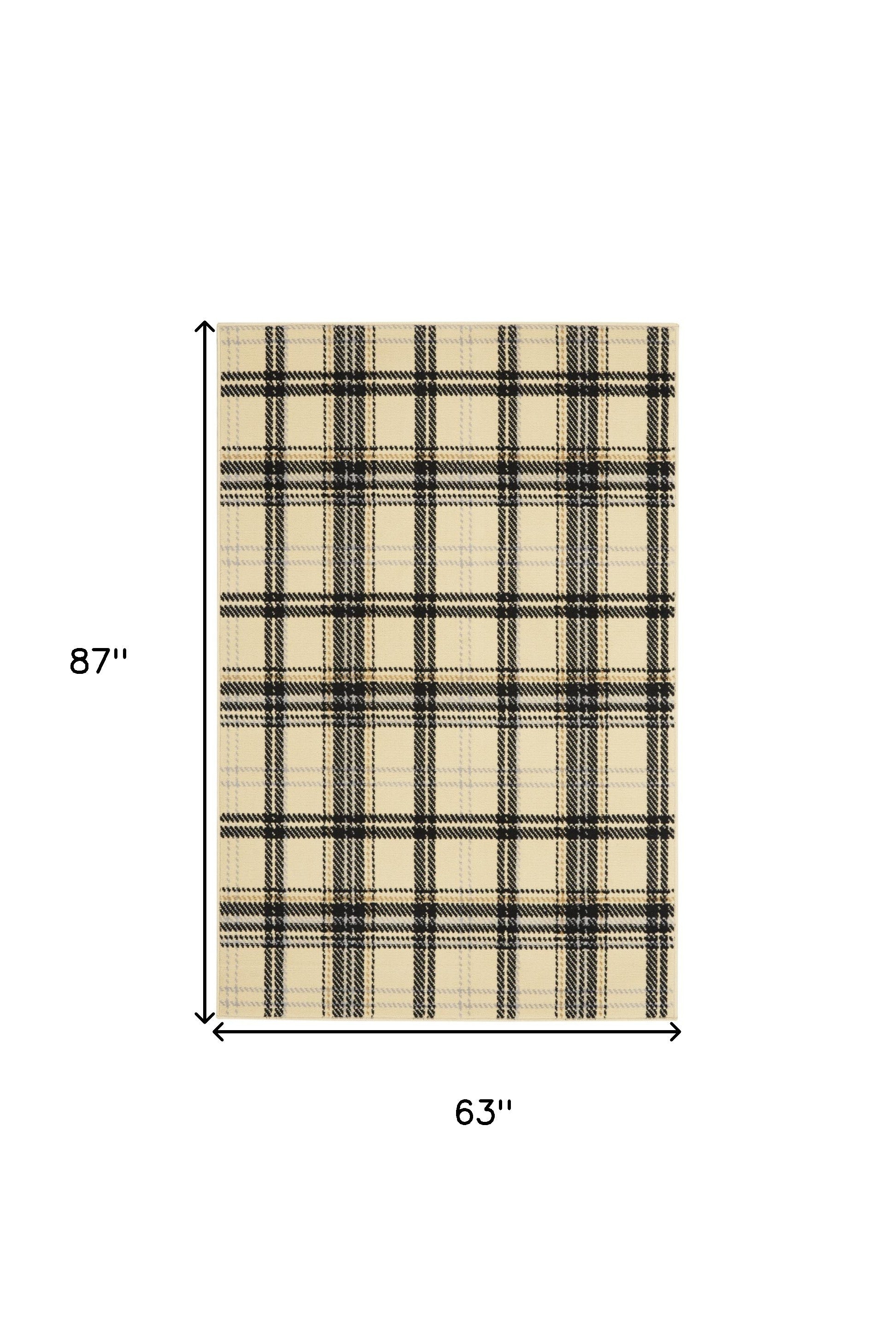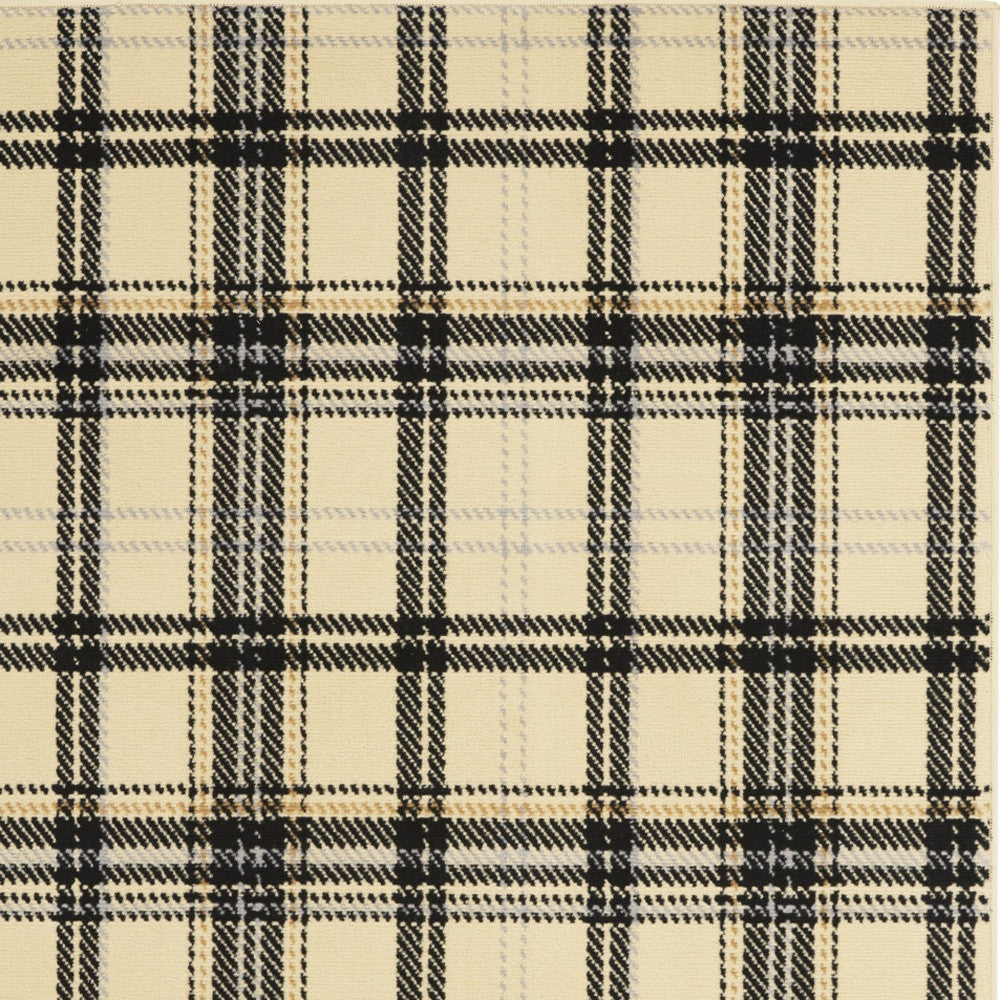 - Easy-care polypropylene area rug in contemporary beige and black design.