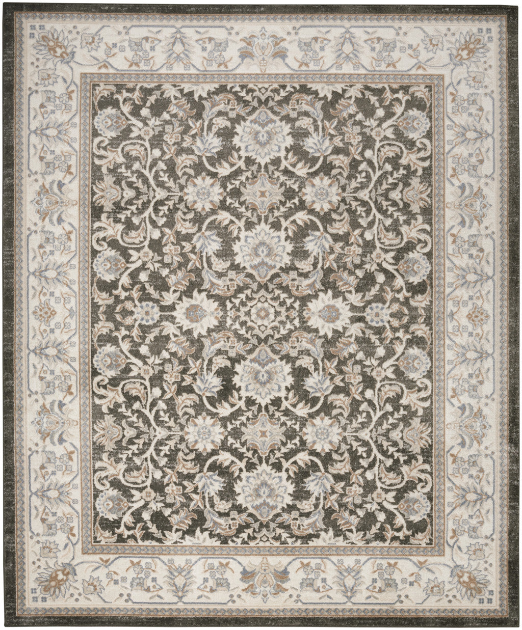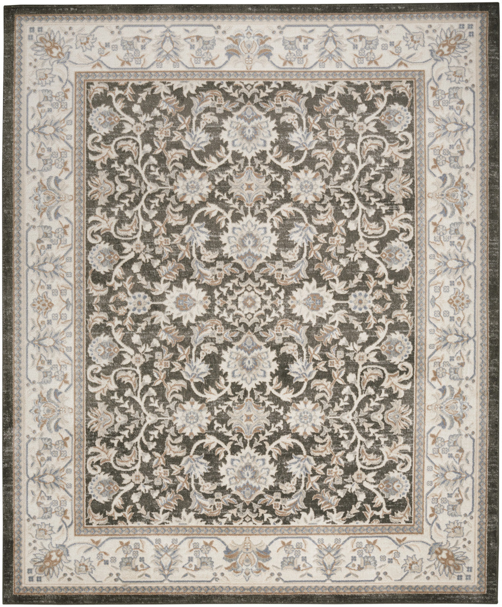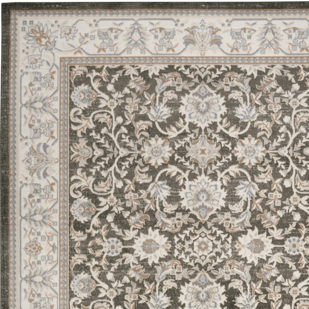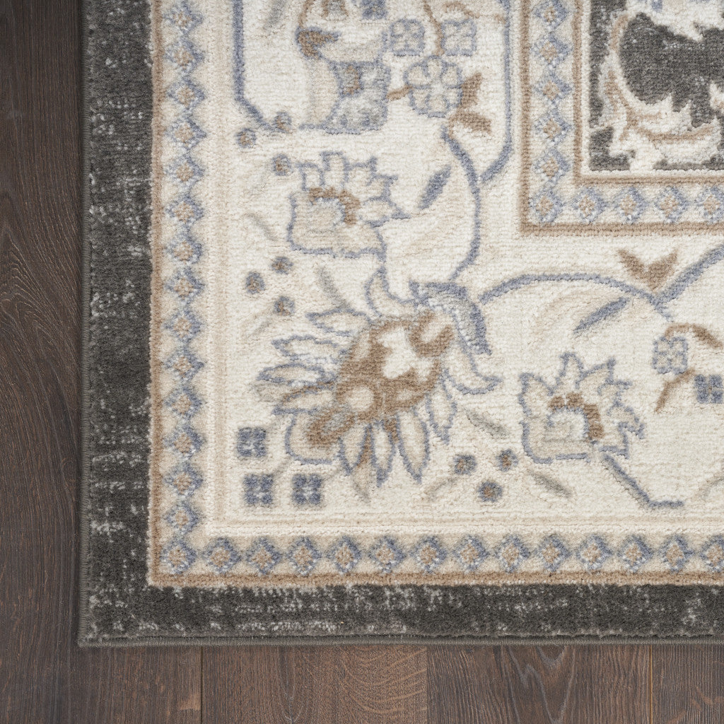 - Machine-made area rug with a rustic gray color and high-low construction.