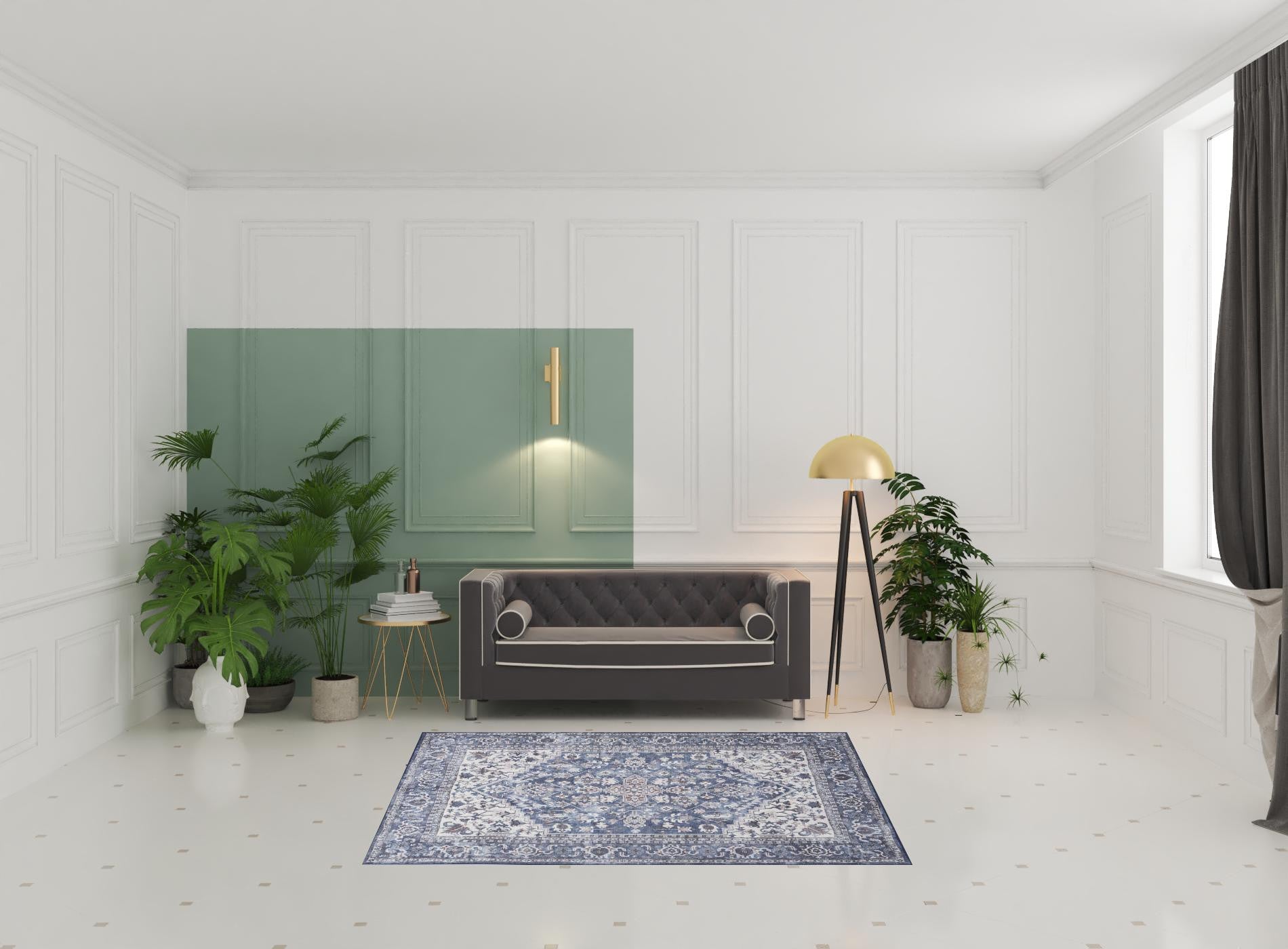 - Features a soft, bohemian design aesthetic with a distressed floral medallion pattern in navy blue, ivory, and gray.
