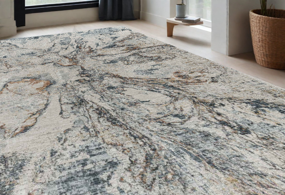 - This durable polyester rug features a modern abstract design with shades of neutral color including ivory, blue, gray and brown.
