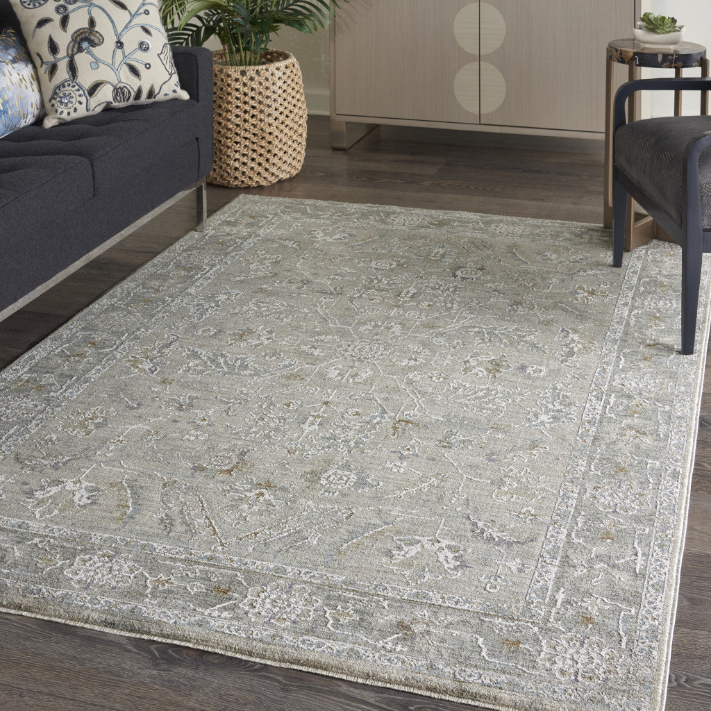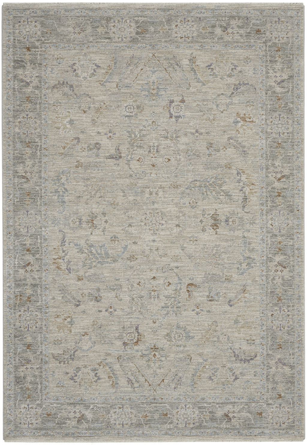- Machine-made area rug in a traditional beige and gray design crafted from polypropylene and polyester blend.