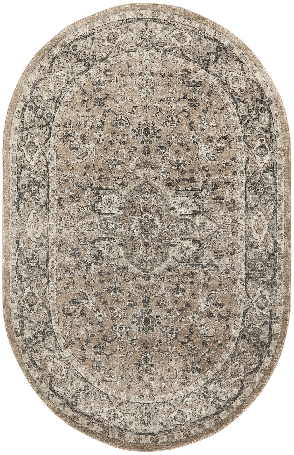 - Machine-made area rug crafted from a durable polypropylene and polyester blend in a traditional beige and gray design.