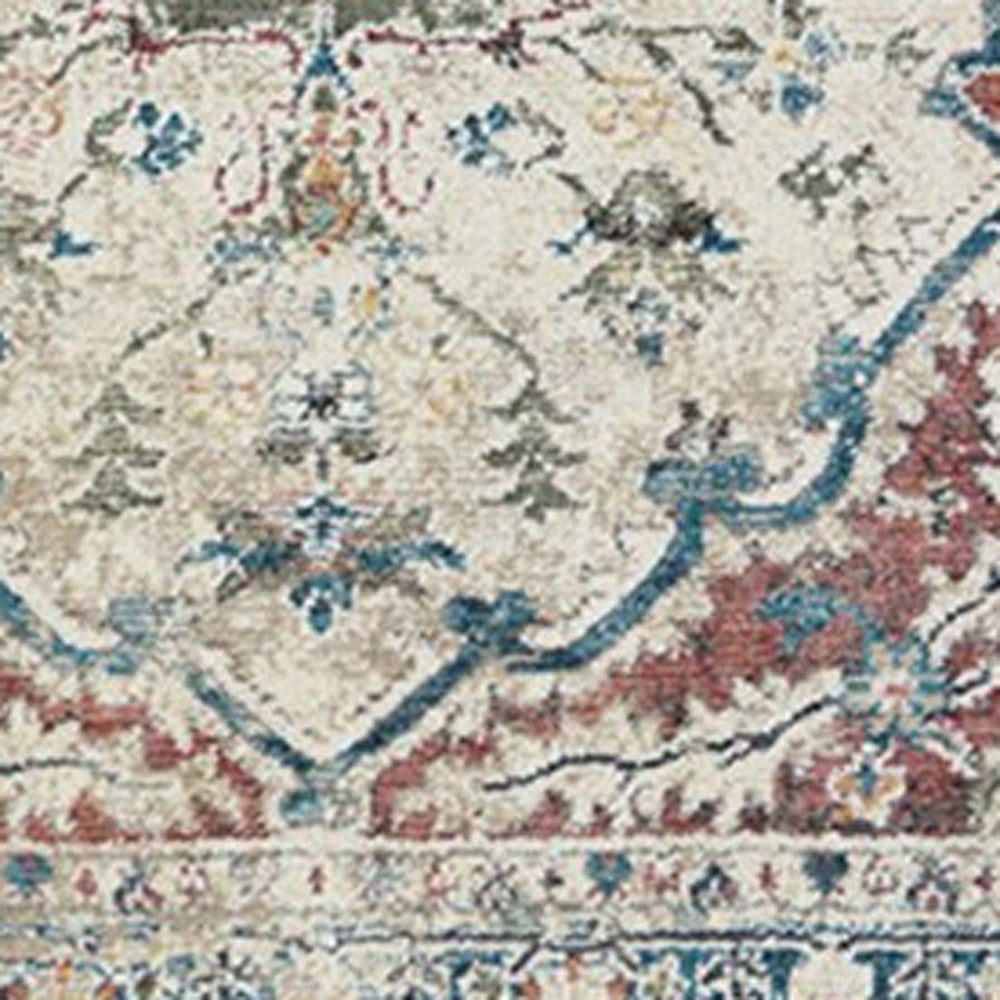 - Ivory Blue and Gray traditional oriental design that is slightly faded/worn and features pops of green and teal for interest.