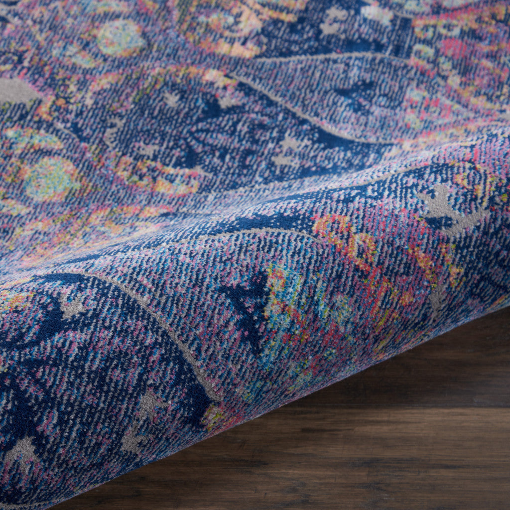 - Bohemian style area rug in navy blue and orange shades, perfect for a kitchen with worn faded distressing.