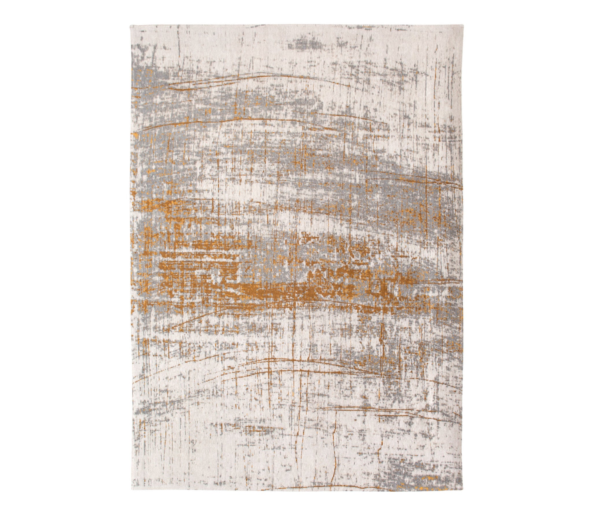 - Modern gray and gold area rug.