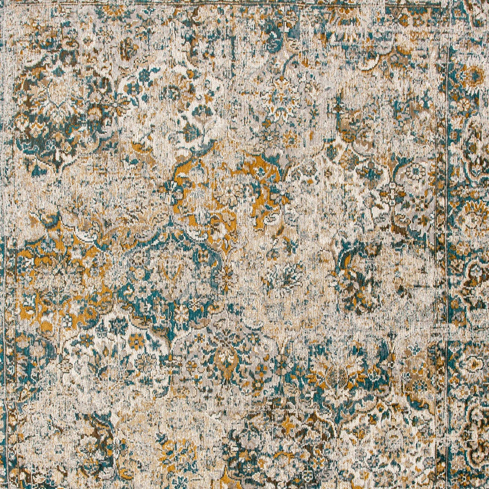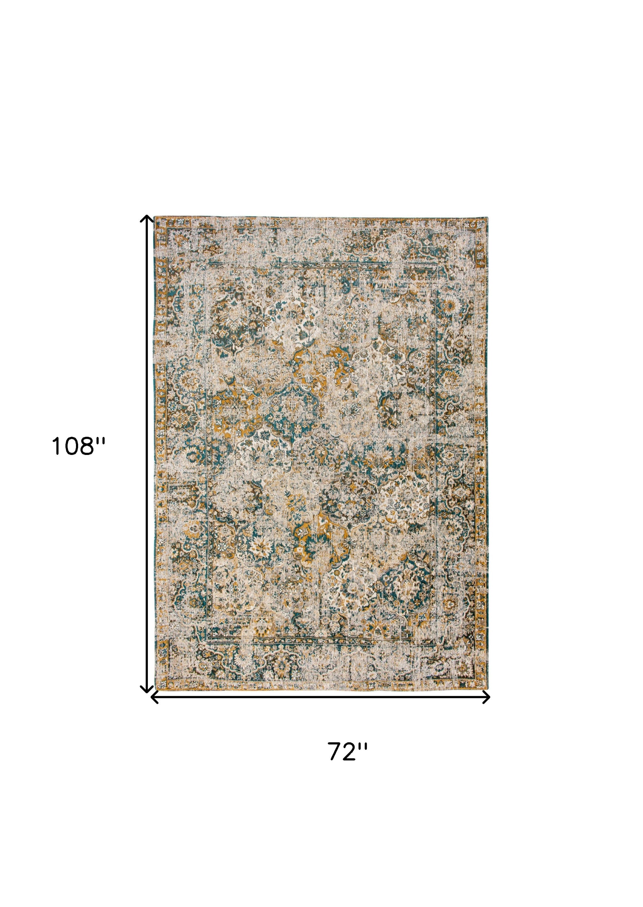 - Machine-made area rug in blue and green.