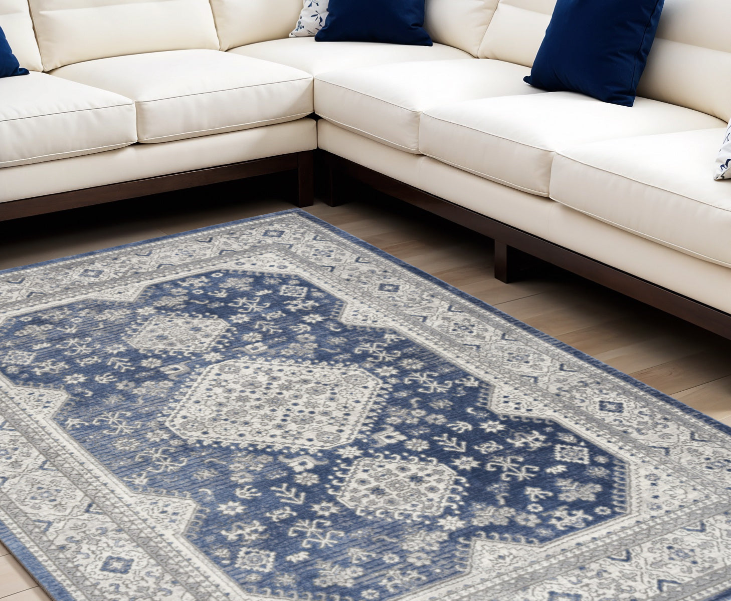 - ? Machine made area rug with a blue and gray Persian-style design crafted from a polypropylene and polyester blend.