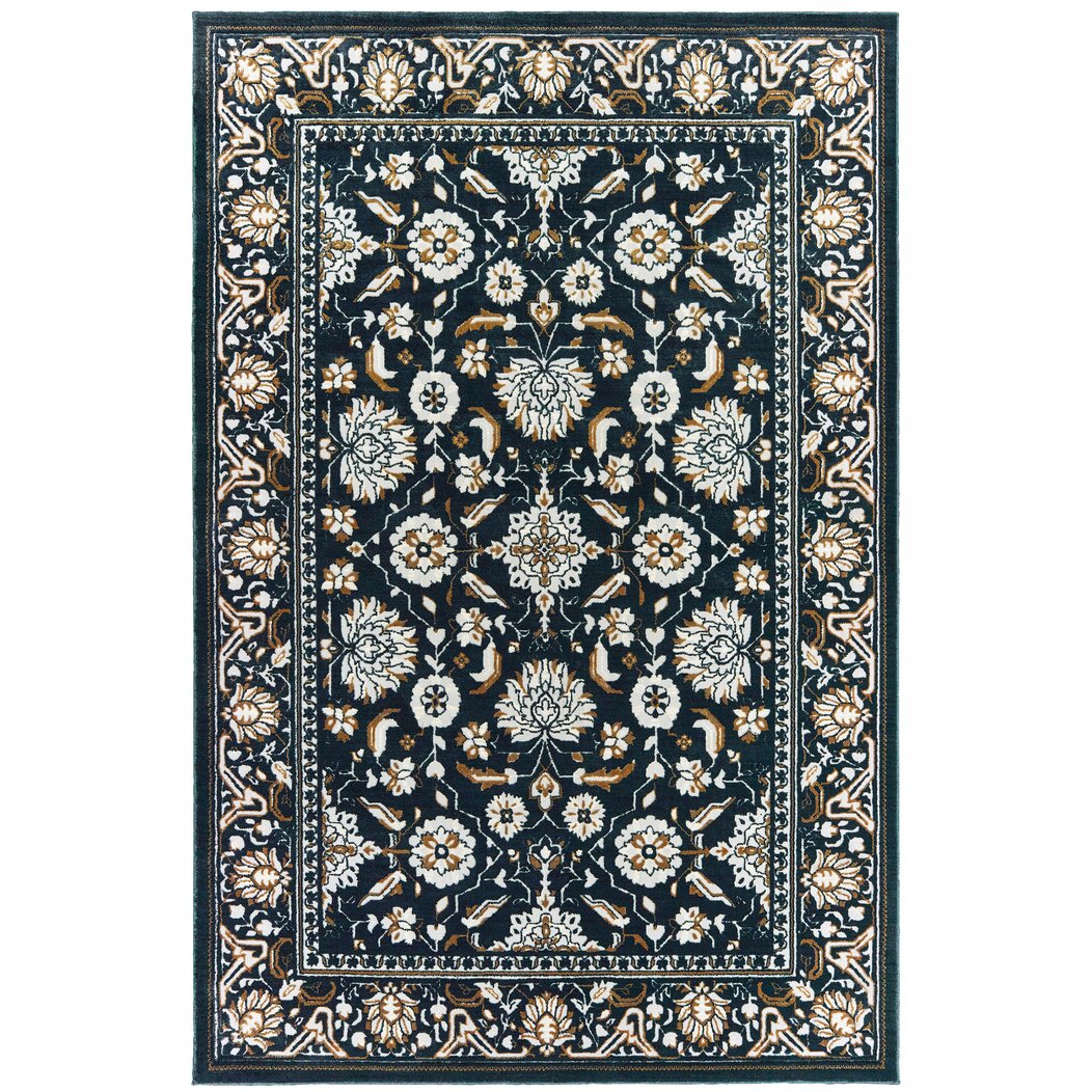 - Rug colors include navy, warm caramel and ivory