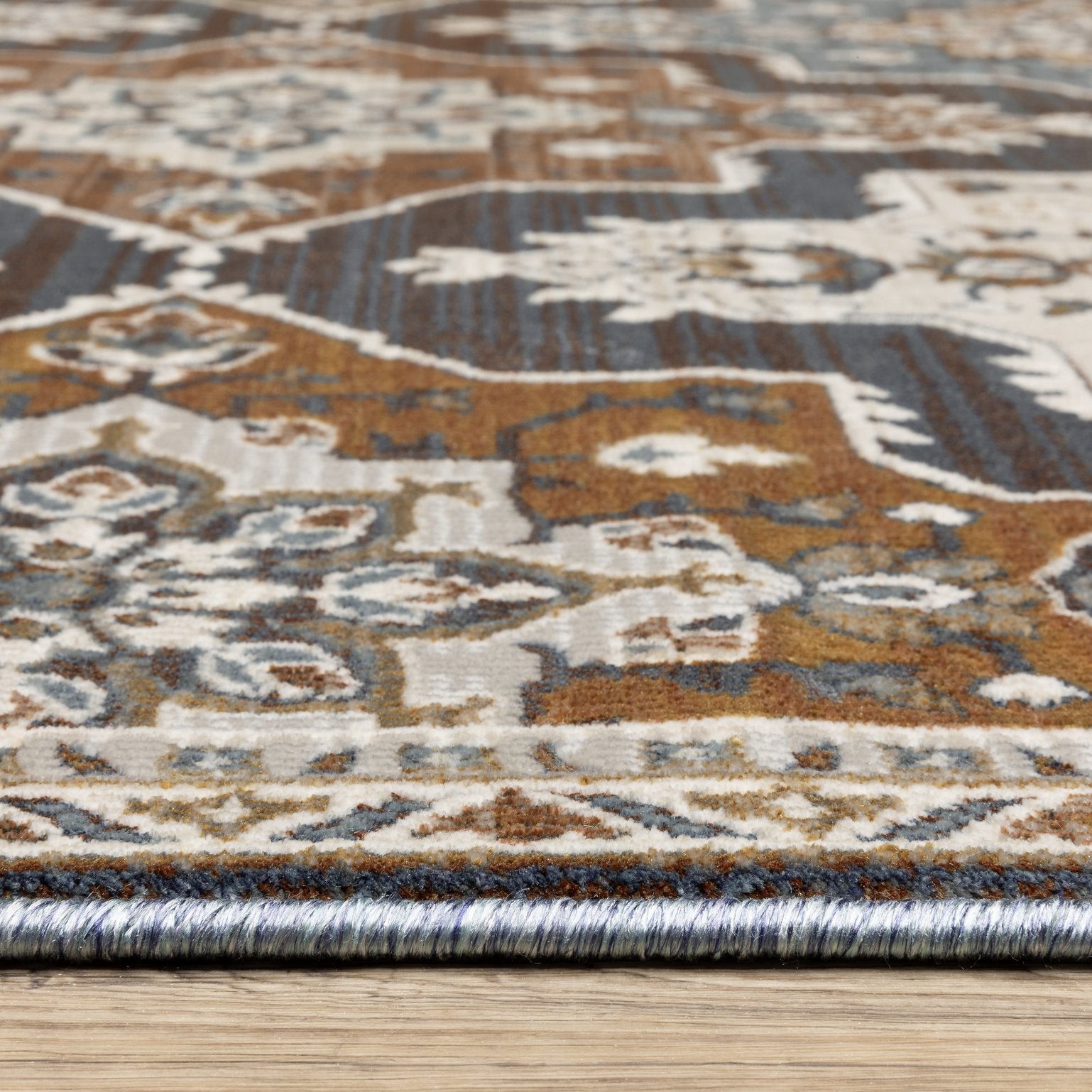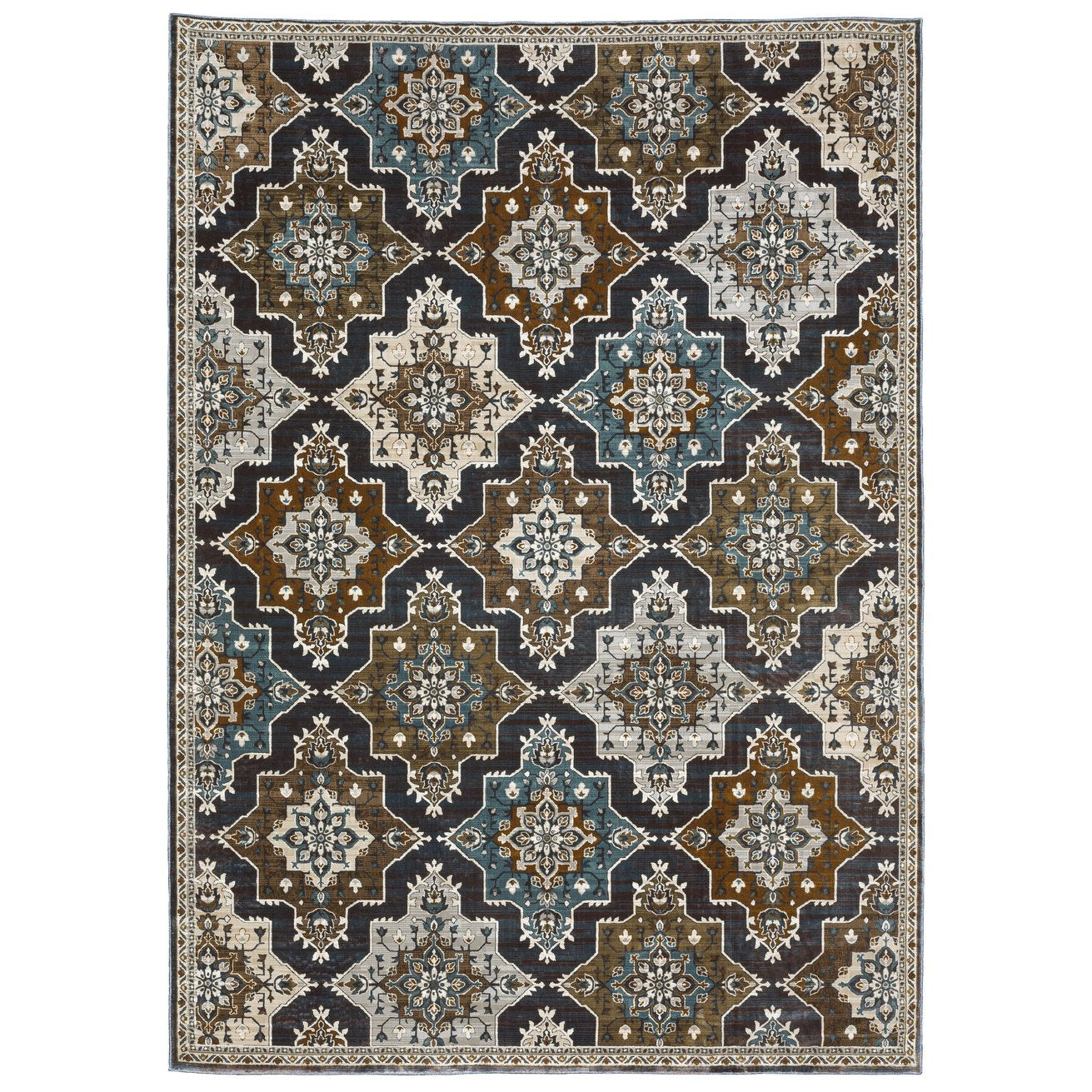 - Rug color include shades of blue, rust, teal, brown, grey, beige, brown, ivory