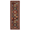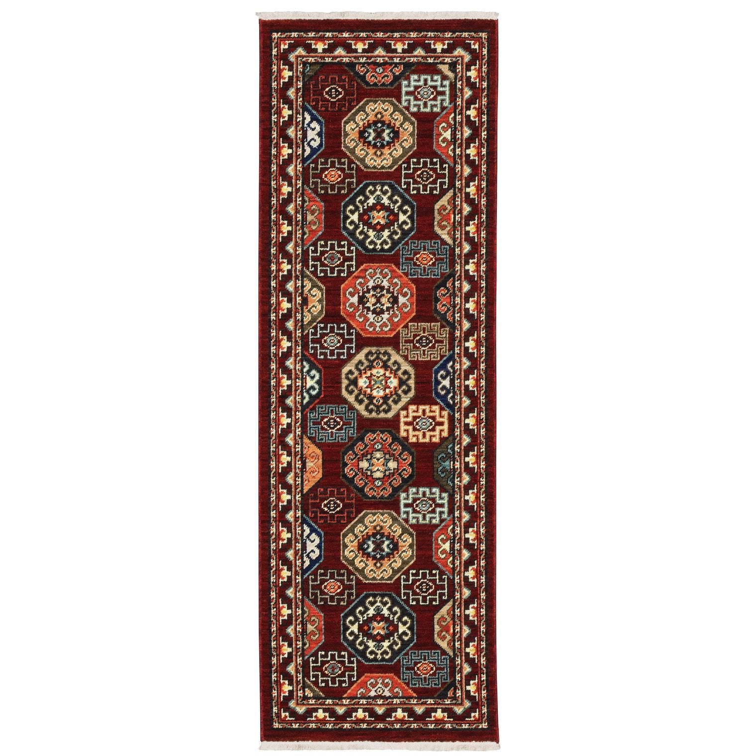- Rug features shades of red, blue, brown, tan, ivory, orange and black