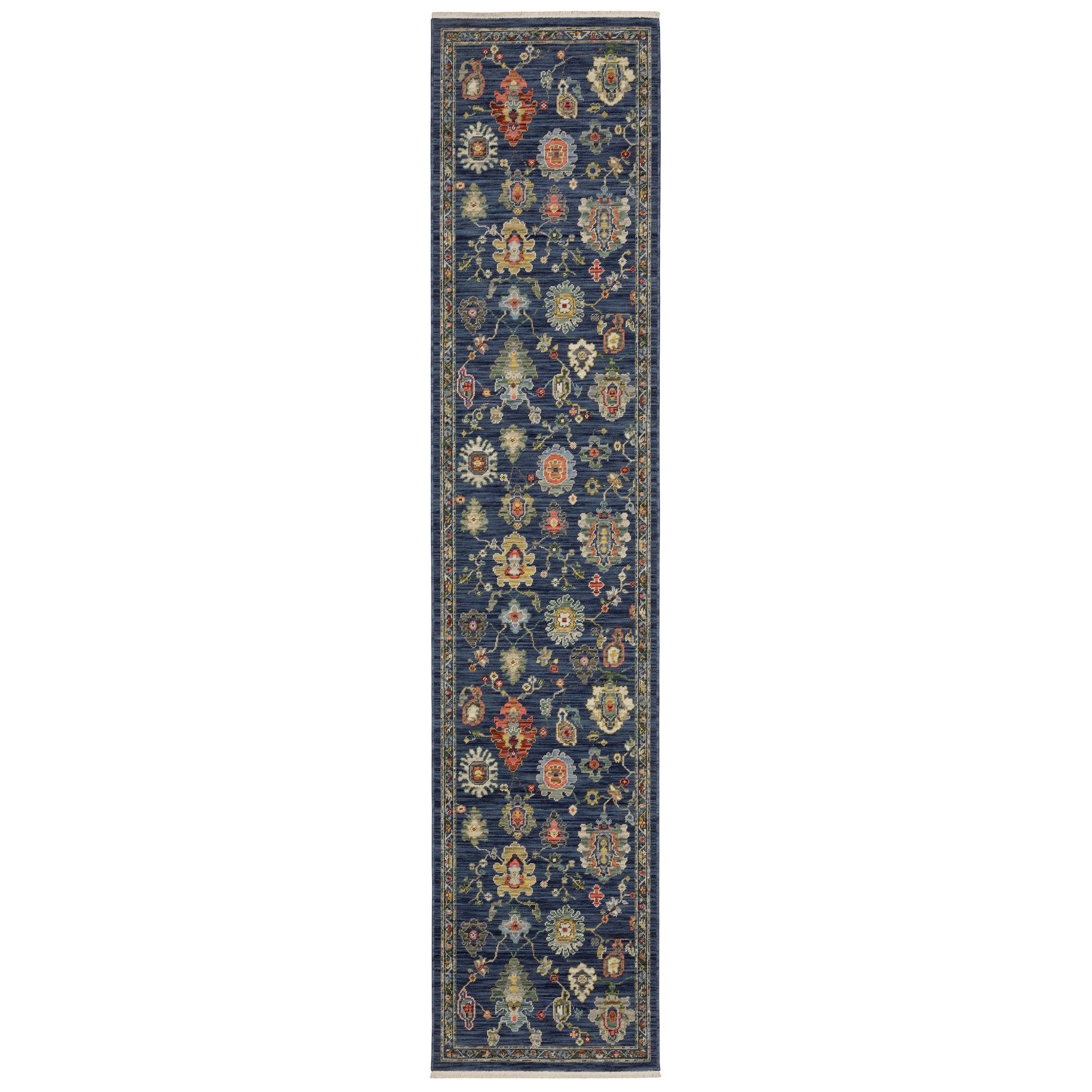 - Rug colors include shades of blue, salmon, peach, red, gold, green, grey and ivory