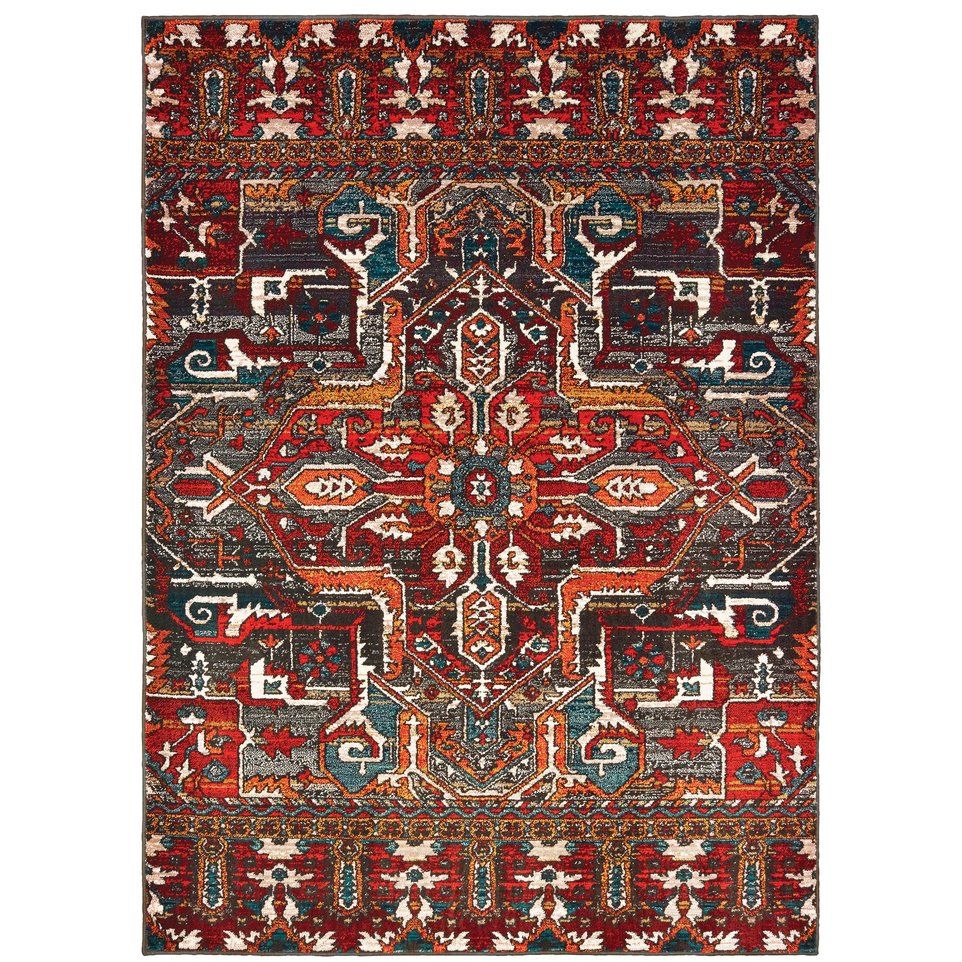 - Rug colors include red and orange with accents of blue and gray