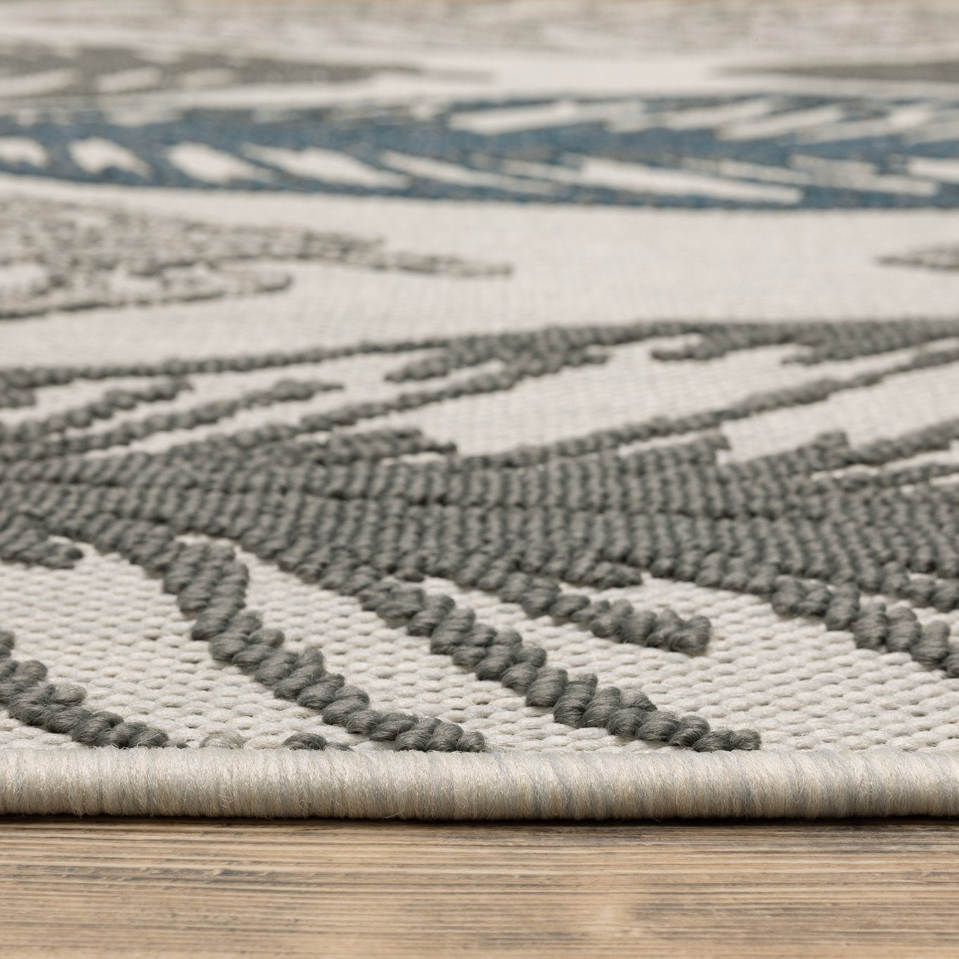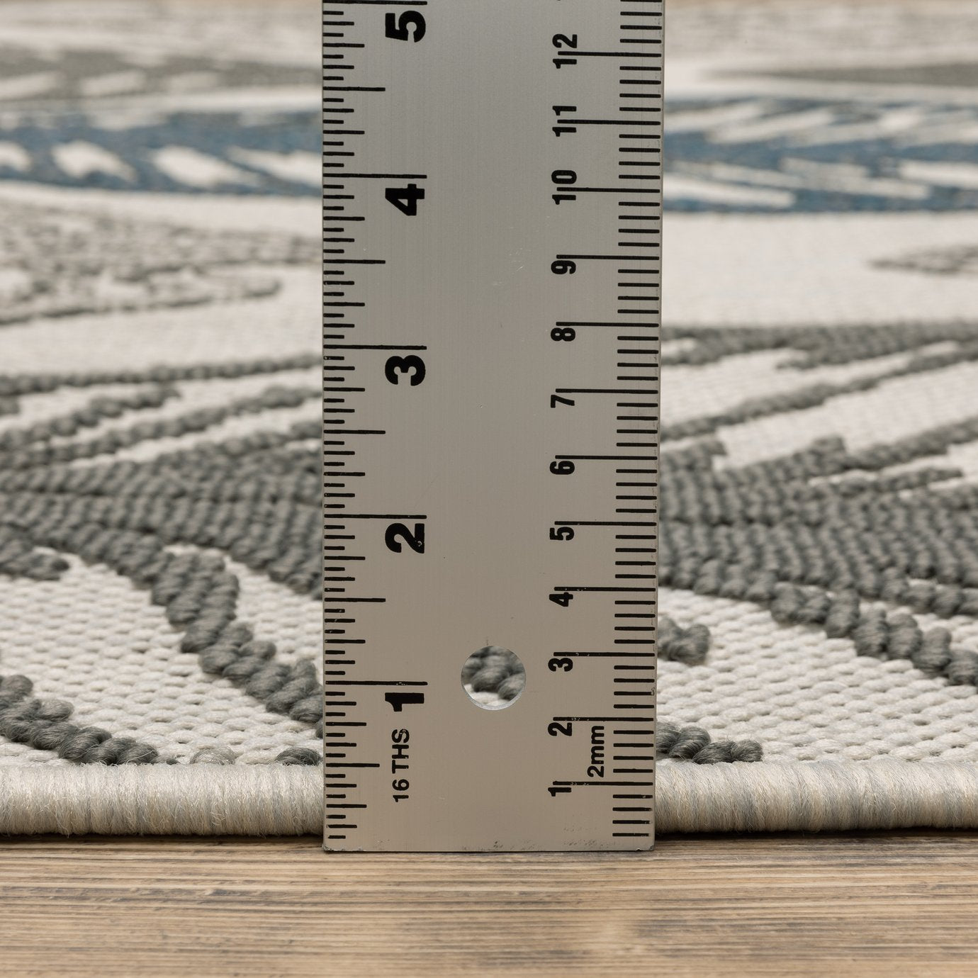 - Rug colors include shades of grey and teal on a beige background