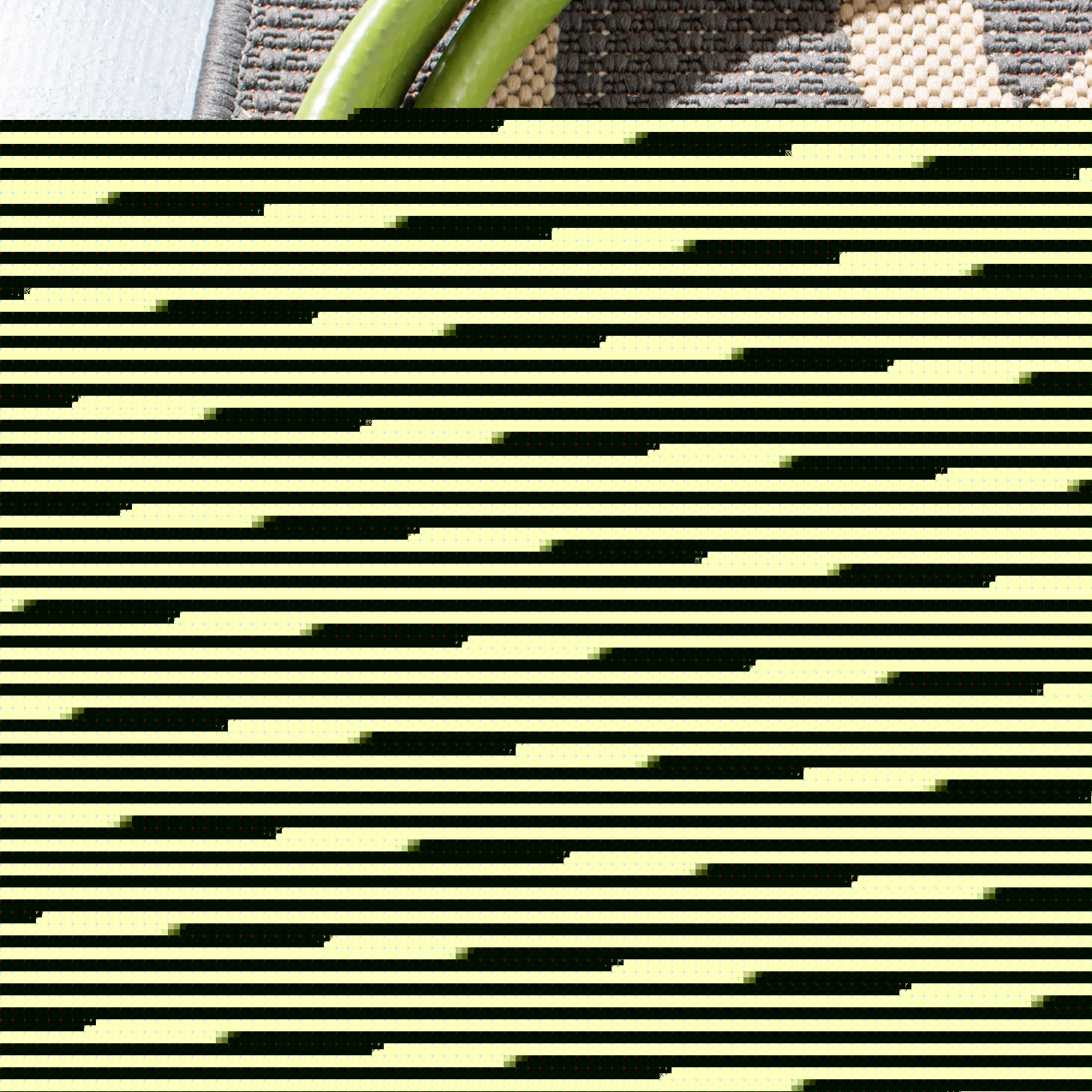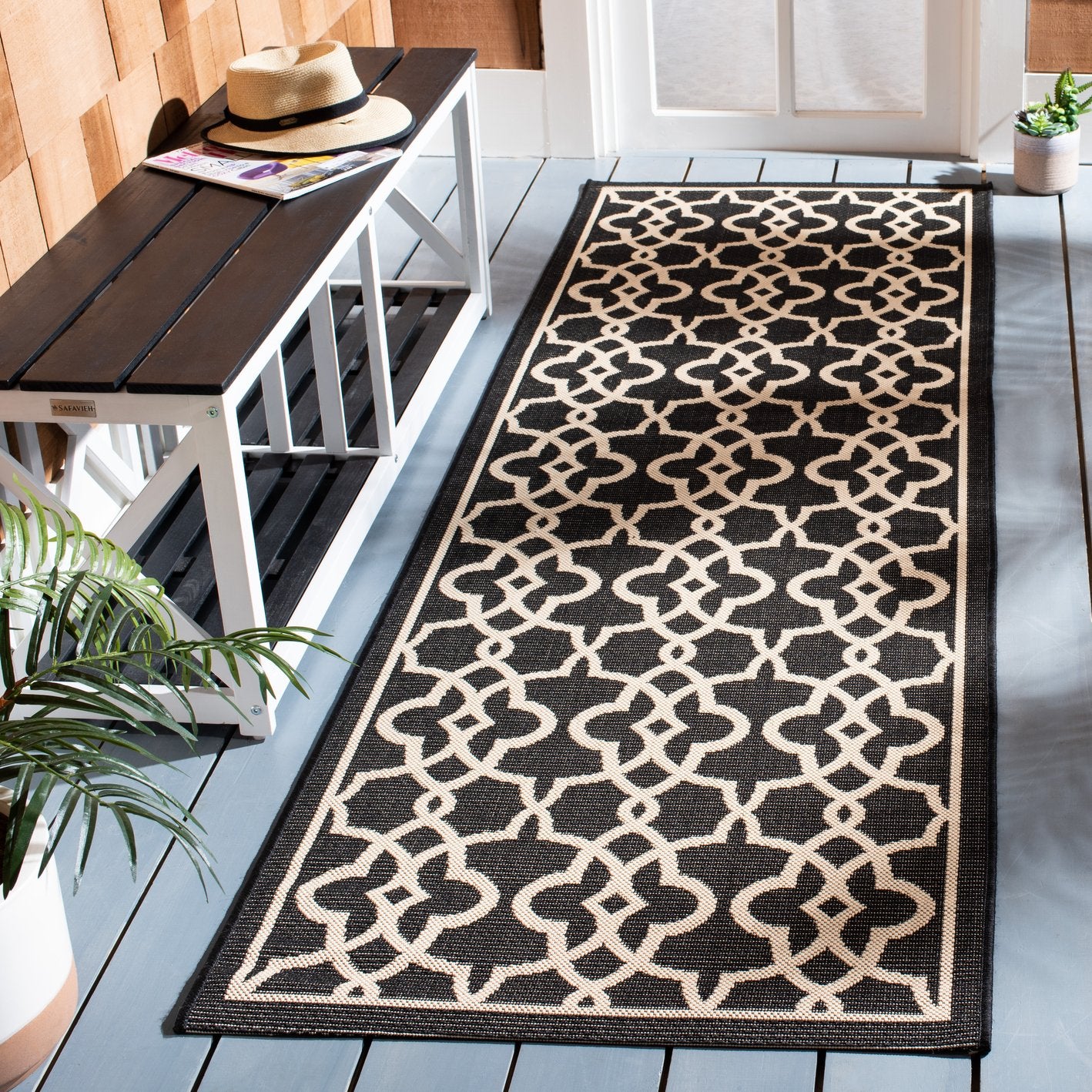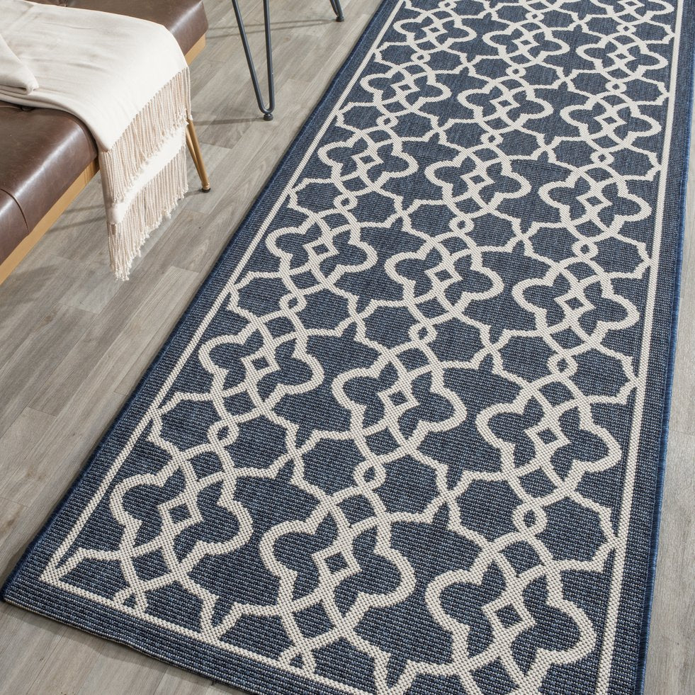 - Detailed interwoven ellipses and quatrefoils, colored in a neutral beige, reach across a deep navy pile on this artfully styled indoor/outdoor rug. A unique sisal weave achieves the sophisticated look of a fine indoor area rug while power-loomed synt