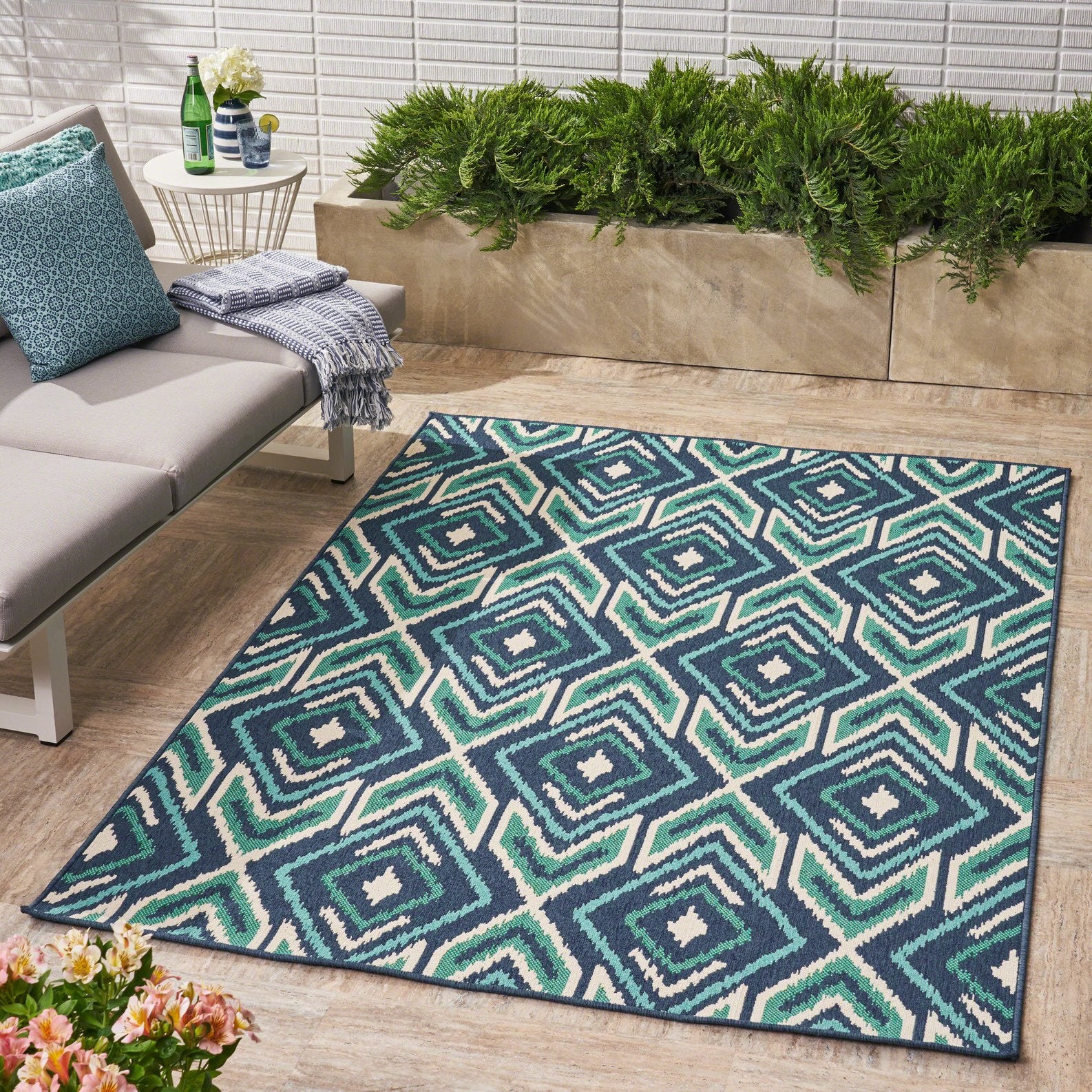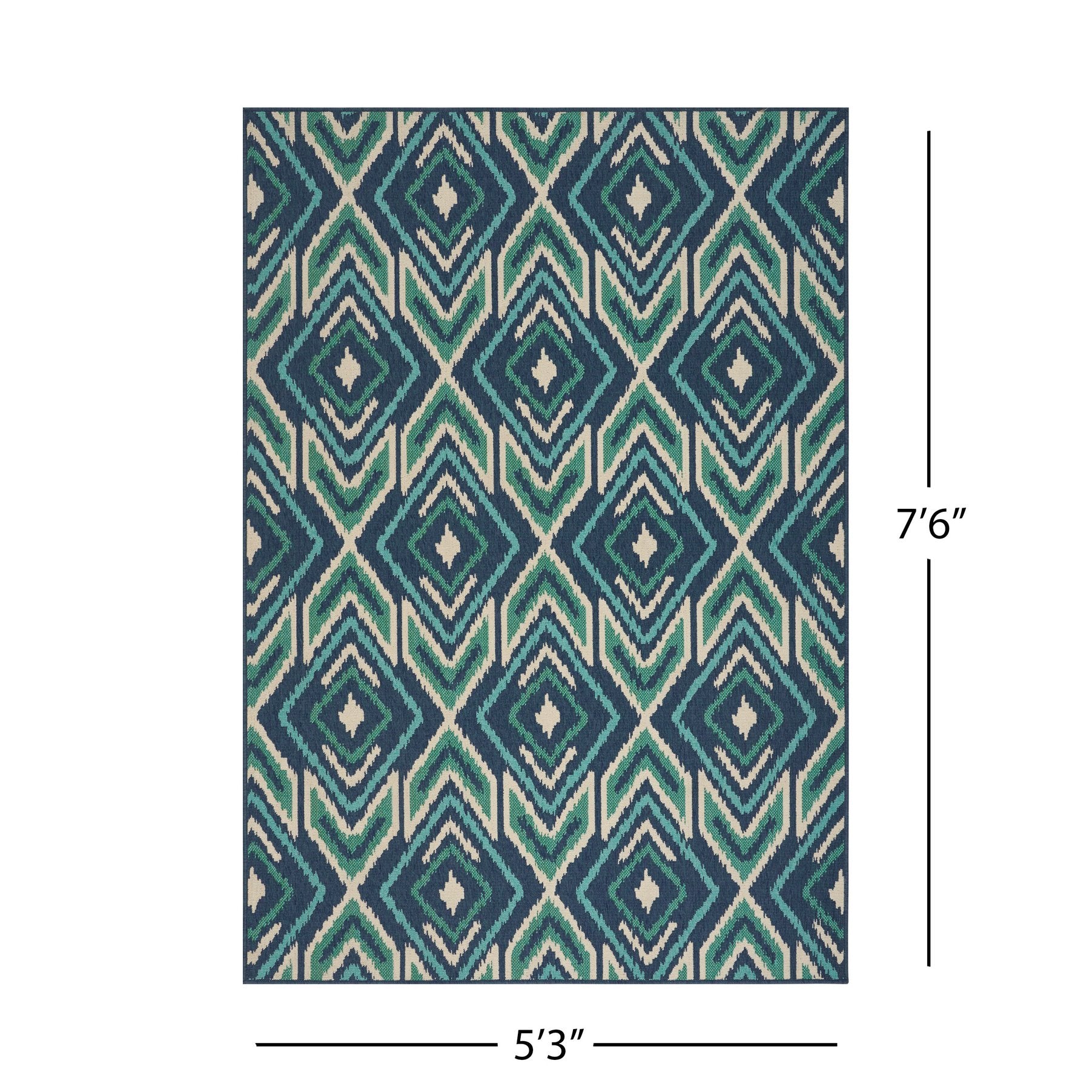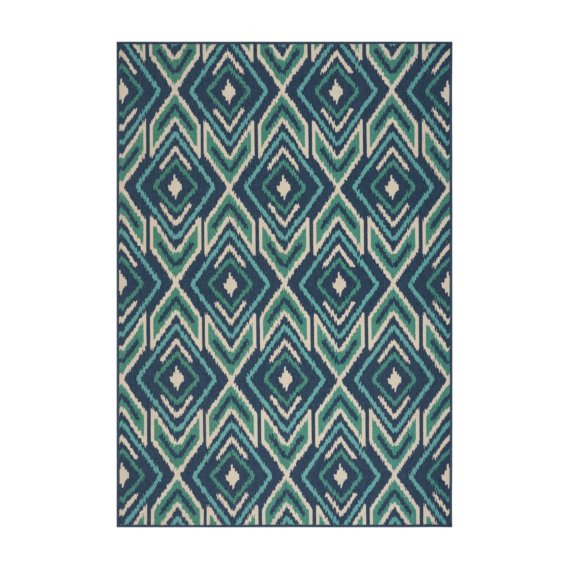- This durable outdoor rug is a fresh, playful decoration that is perfect for sprucing up your patio area. Featuring an ikat and chequer inspired design with tricolor yarn in various shades of blue and green, this rug provides a unique and yet simple addition to any patio. Wow your guests with this on point rug in your back yard. Naturally stain- and fade-resistant.