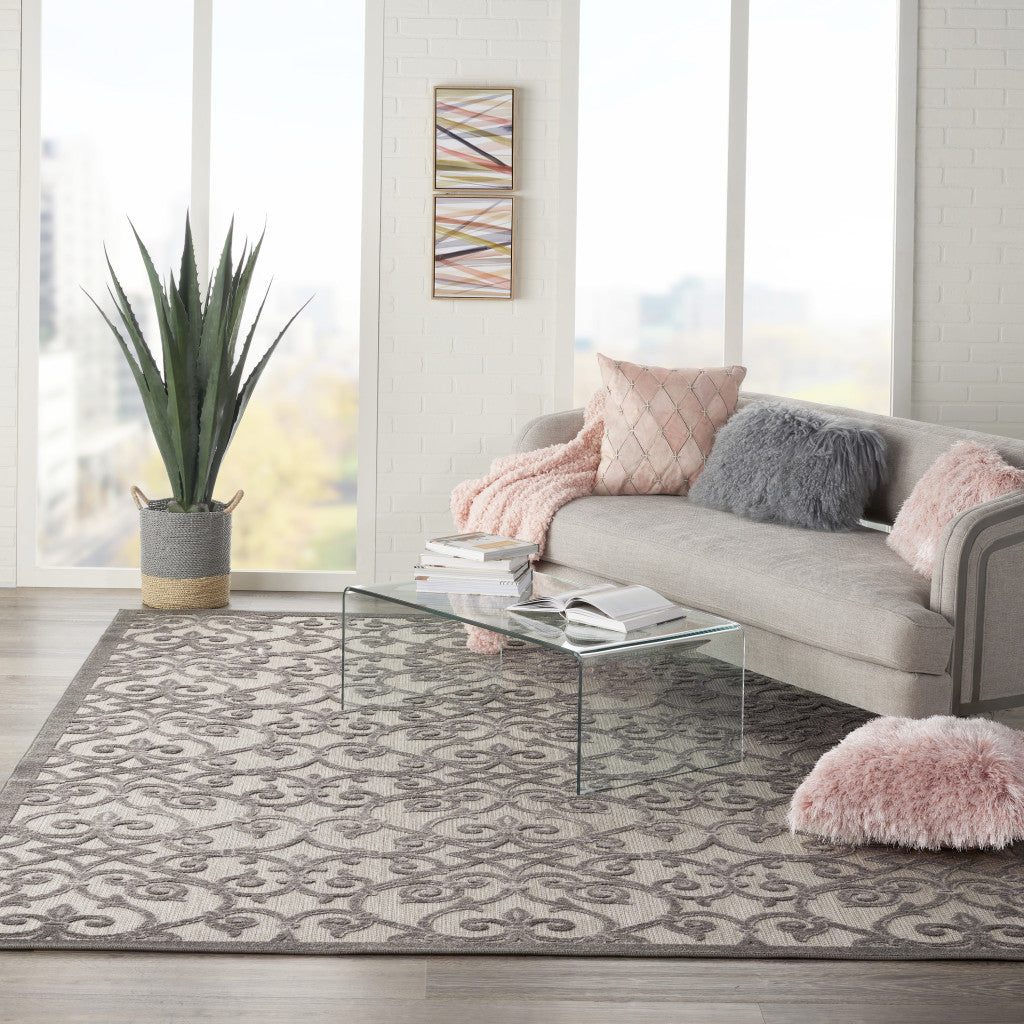 - Contemporary indoor/outdoor rug invites a touch of elegance to modern décor